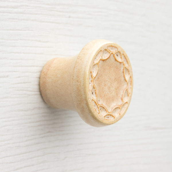 Ceramiczna gałka do mebli z lekko wypukłym ornamentem. Ręcznie wykonana z jasnej gliny, pokryta błyszczącym szkliwem. Twoje meble zyskają nowy, niepowtarzalny, jedyny w swoim rodzaju wygląd.