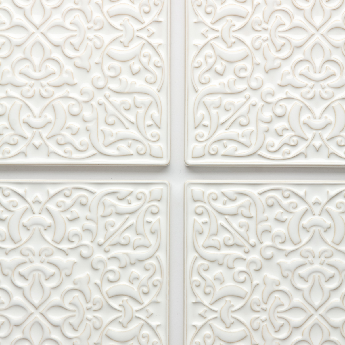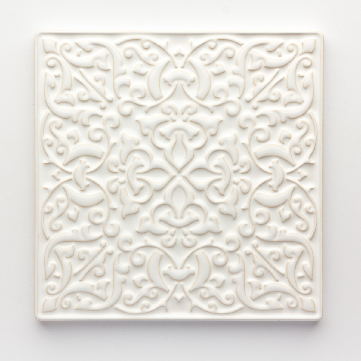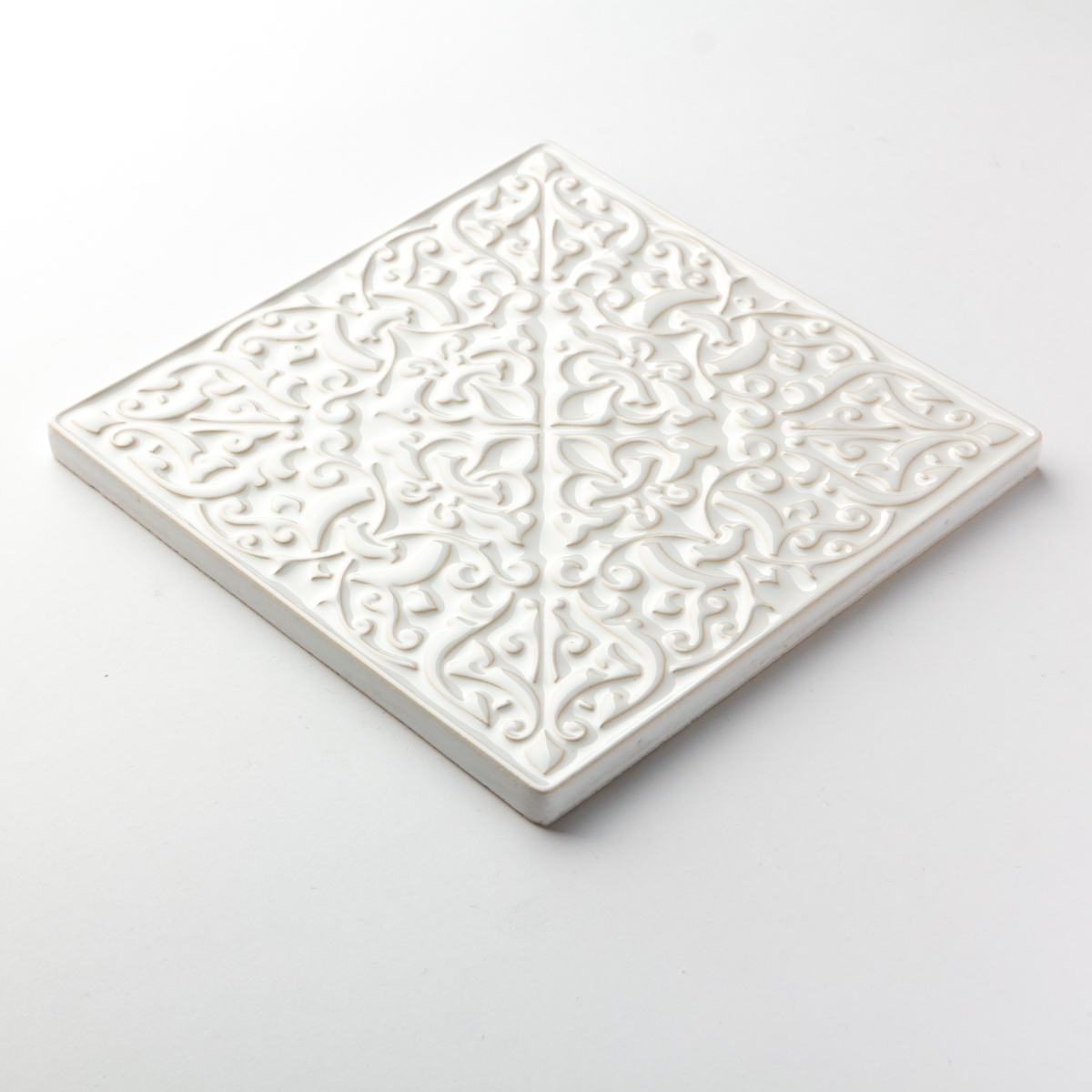 Kafle ceramiczne ręcznie robione, ścienne z lekko wypukłymi, misternymi ornamentami. Wykonane z jasnej gliny. Pokryte błyszczącym, szkliwem, w sposób który odpowiednio podkreśla ozdobny wzór arabeskowej powierzchni. Dwukrotnie wypalane. Odporne na wodę, ścieranie, wysokie i niskie temperatury. Montaż standardowy.
