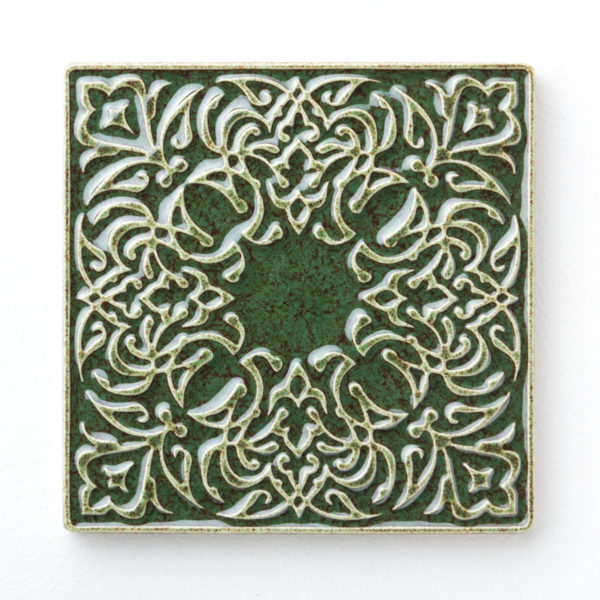 Dekor ceramiczny ręcznie robiony, ścienny z lekko wypukłym, misternym ornamentem. Wykonany z jasnej gliny. Pokryte błyszczącym szkliwem, w sposób który odpowiednio podkreśla ozdobny wzór arabeskowej powierzchni. Dwukrotnie wypalany. Odporny na wodę, ścieranie, wysokie i niskie temperatury. Można wkleić go między innymi kaflami na ścianie lub po prostu zawiesić w dowolnym miejscu (każdy dekor posiada z tyłu otwór, umożliwiający zawieszenie).