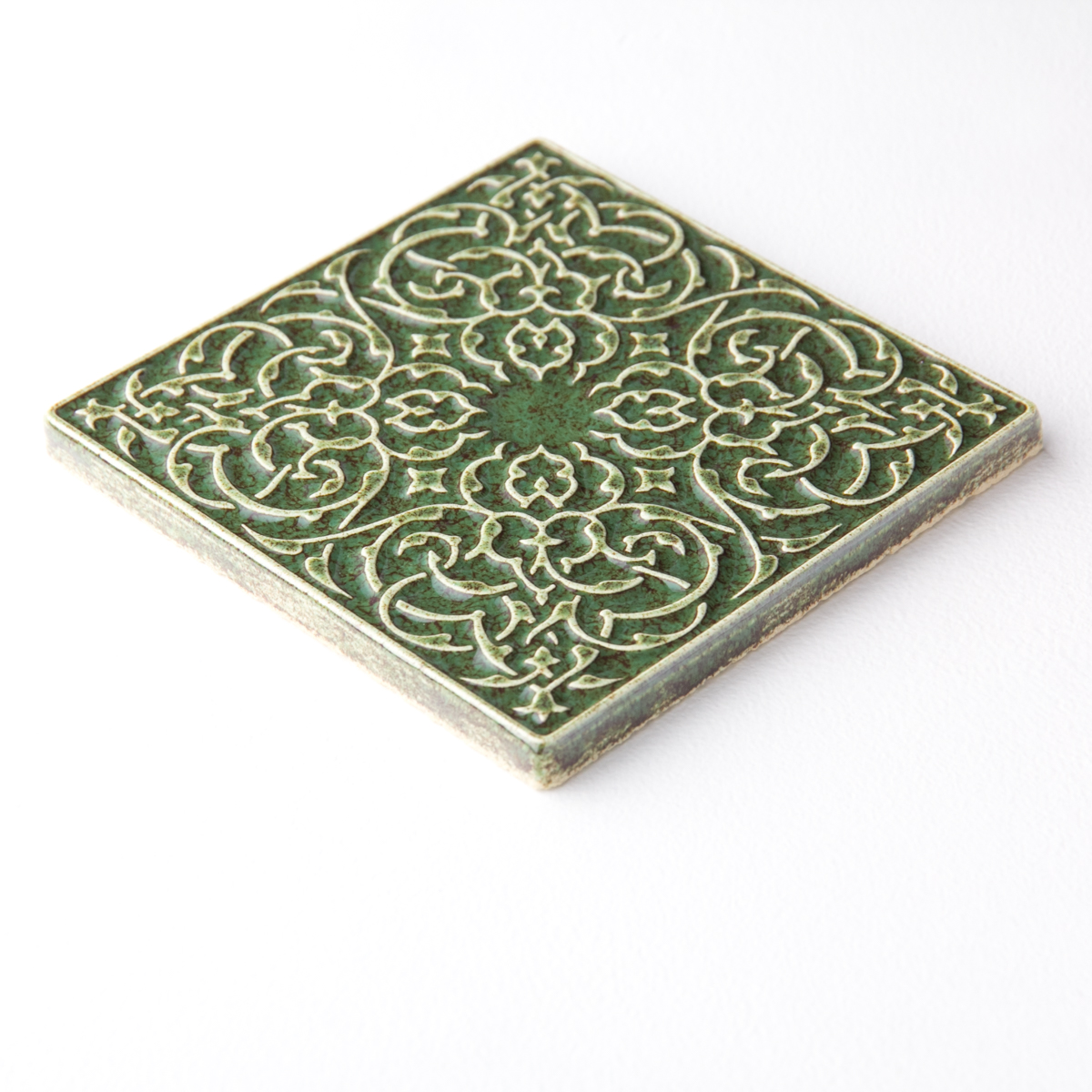 Kafel ceramiczny ręcznie robiony, ścienny z lekko wypukłym, misternym ornamentem. Wykonany z jasnej gliny. Pokryte błyszczącym, szkliwem, w sposób który odpowiednio podkreśla ozdobny wzór arabeskowej powierzchni. Dwukrotnie wypalany. Odporny na wodę, ścieranie, wysokie i niskie temperatury. Montaż kafli standardowy. Na zamówienie istnieje możliwość wykonania większej ilości podobnych.