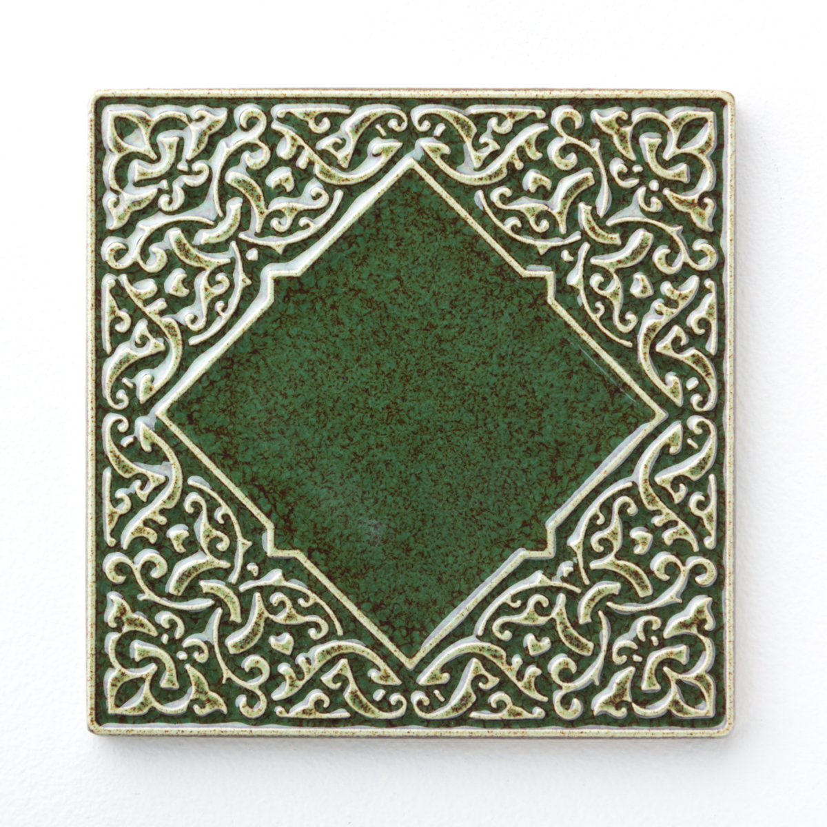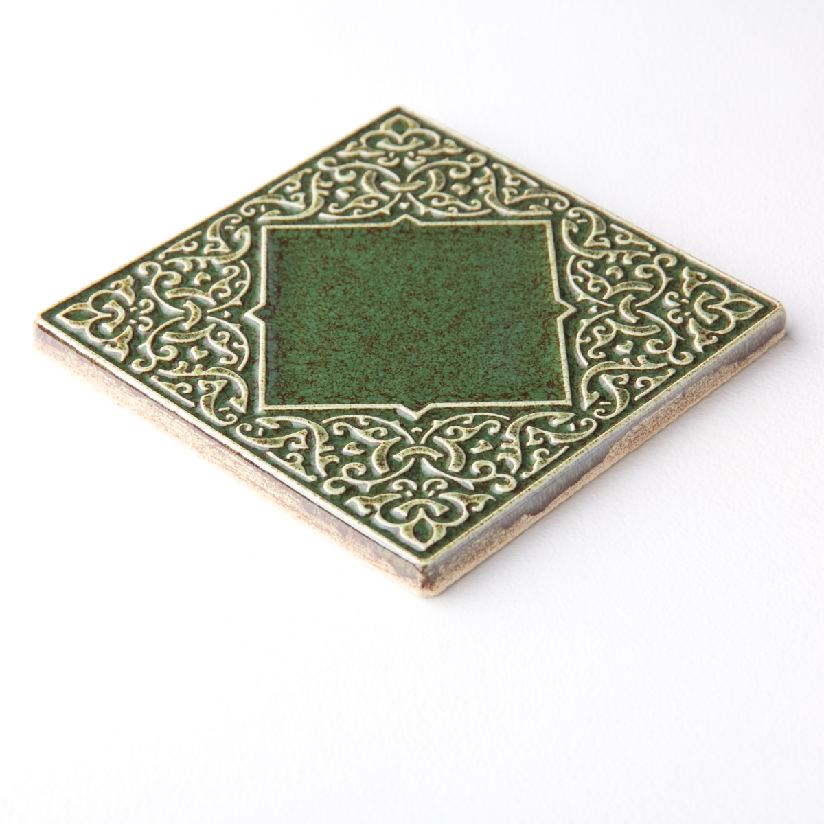 Kafel ceramiczny ręcznie robiony, ścienny z lekko wypukłym, misternym ornamentem. Wykonany z jasnej gliny. Pokryte błyszczącym, szkliwem, w sposób który odpowiednio podkreśla ozdobny wzór arabeskowej powierzchni. Dwukrotnie wypalany. Odporny na wodę, ścieranie, wysokie i niskie temperatury. Montaż kafli standardowy. Na zamówienie istnieje możliwość wykonania większej ilości podobnych.