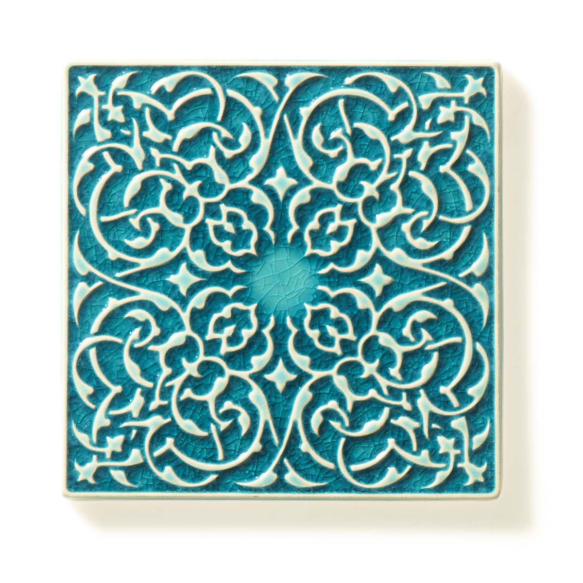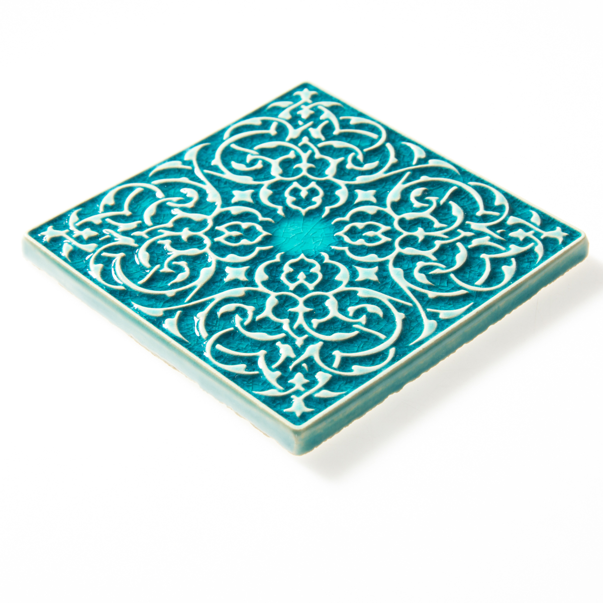 Kafel ceramiczny ręcznie robiony, ścienny z lekko wypukłym, misternym ornamentem. Wykonany z jasnej gliny. Pokryte błyszczącym,  szkliwem, w sposób który odpowiednio podkreśla ozdobny wzór arabeskowej powierzchni. Dwukrotnie wypalany. Odporny na wodę, ścieranie, wysokie i niskie temperatury. Montaż kafli standardowy. Na zamówienie istnieje możliwość wykonania większej ilości podobnych.