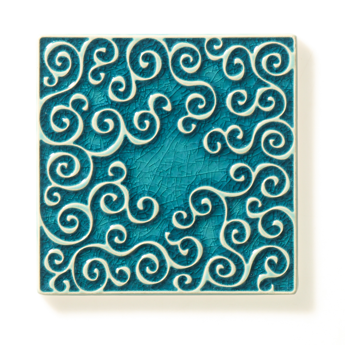 Kafel ceramiczny ręcznie robiony, ścienny z lekko wypukłym, misternym ornamentem. Wykonany z jasnej gliny. Pokryte błyszczącym, szkliwem, w sposób który odpowiednio podkreśla ozdobny wzór arabeskowej powierzchni. Dwukrotnie wypalany. Odporny na wodę, ścieranie, wysokie i niskie temperatury. Montaż kafli standardowy. Na zamówienie istnieje możliwość wykonania większej ilości podobnych.