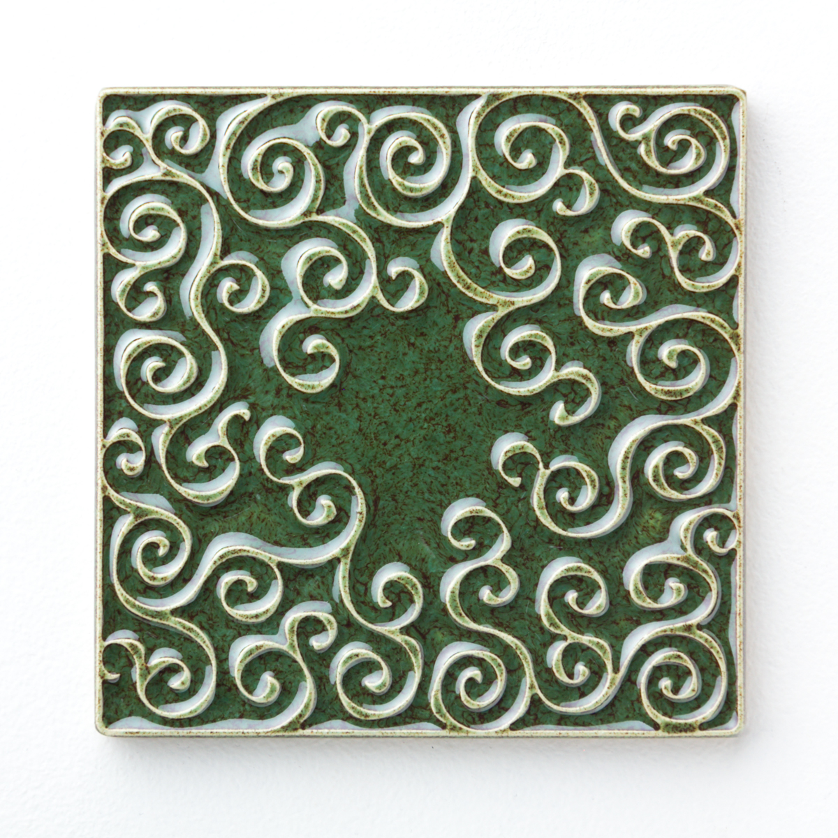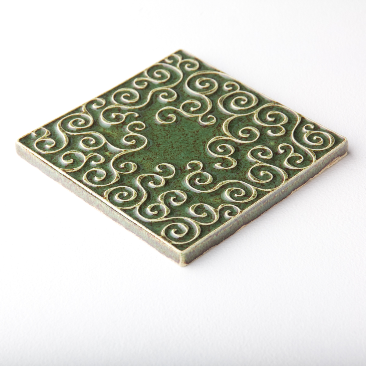 Kafel ceramiczny ręcznie robiony, ścienny z lekko wypukłym, misternym ornamentem. Wykonany z jasnej gliny. Pokryte błyszczącym, szkliwem, w sposób który odpowiednio podkreśla ozdobny wzór arabeskowej powierzchni. Dwukrotnie wypalany. Odporny na wodę, ścieranie, wysokie i niskie temperatury. Montaż kafli standardowy. Na zamówienie istnieje możliwość wykonania większej ilości podobnych.