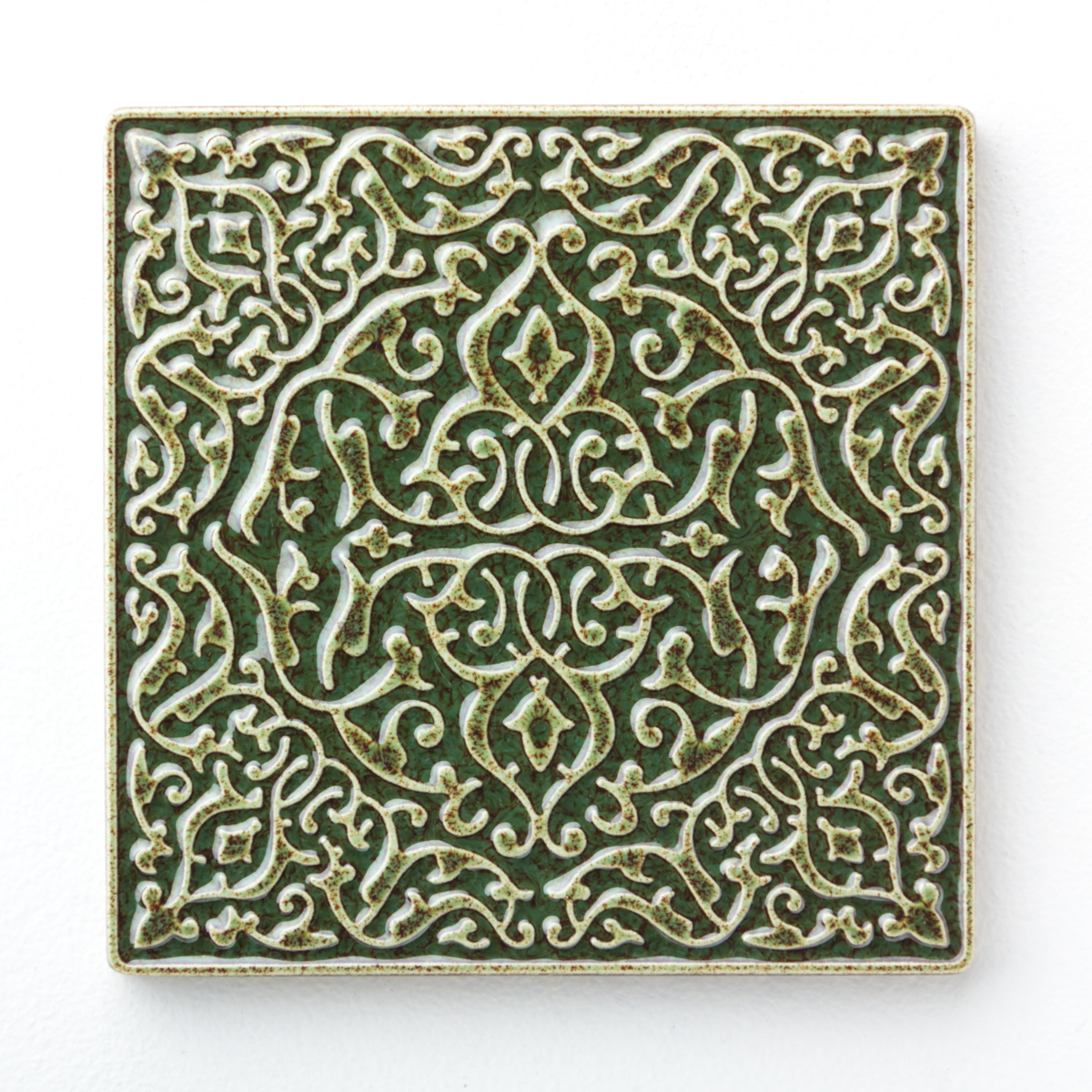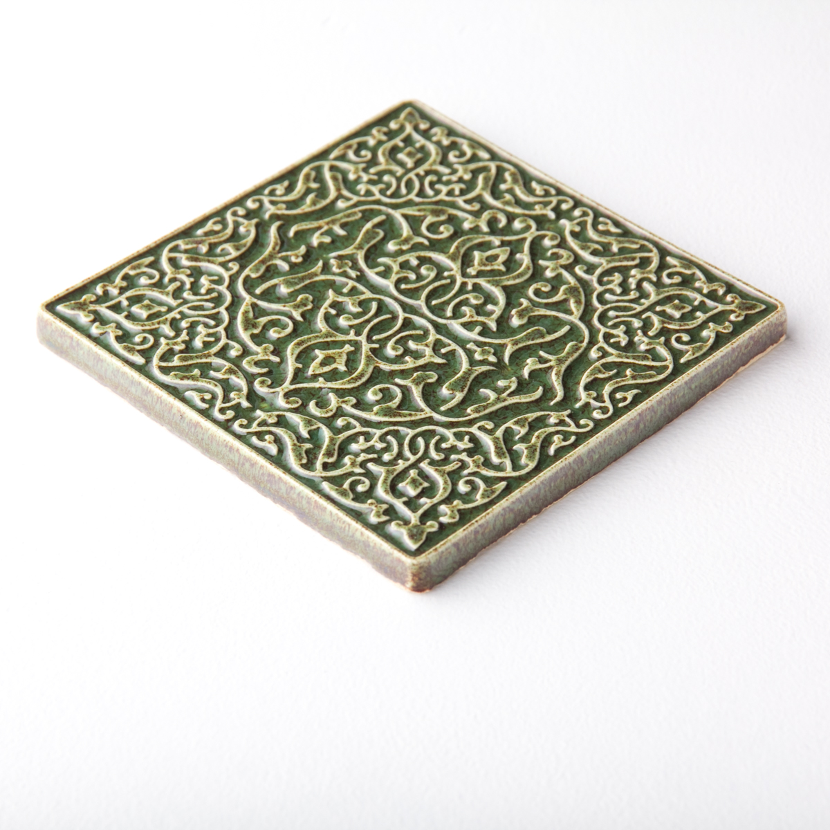 Kafel ceramiczny ręcznie robiony, ścienny z lekko wypukłym, misternym ornamentem. Wykonany z jasnej gliny. Pokryte błyszczącym, szkliwem, w sposób który odpowiednio podkreśla ozdobny wzór arabeskowej powierzchni. Dwukrotnie wypalany. Odporny na wodę, ścieranie, wysokie i niskie temperatury. Montaż kafli standardowy. Na zamówienie istnieje możliwość wykonania większej ilości podobnych.