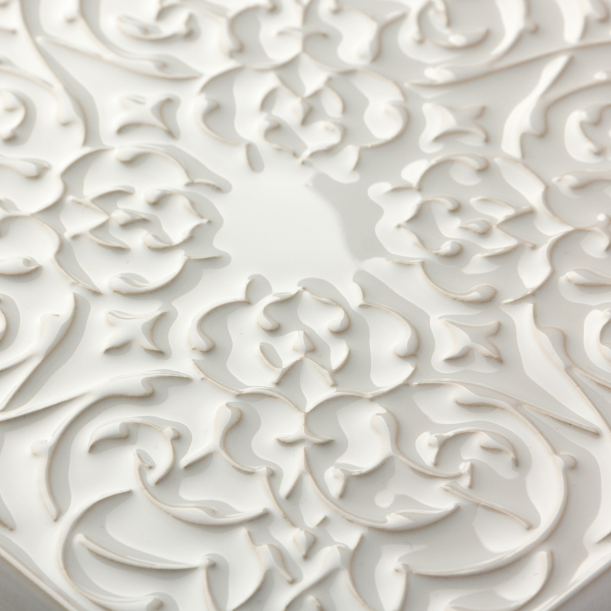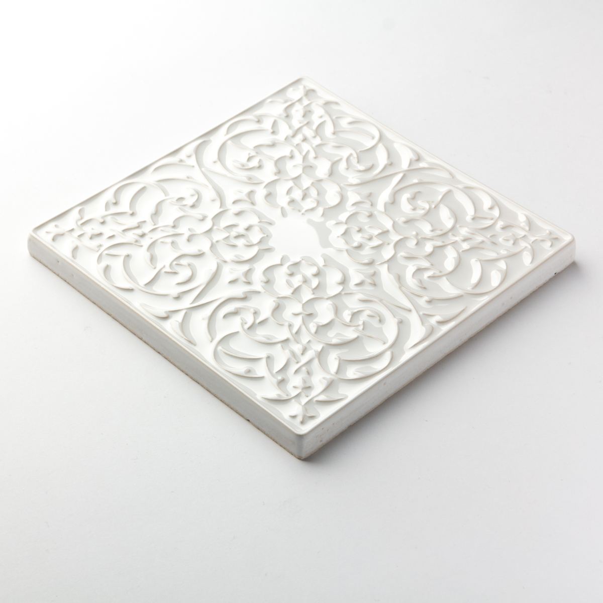 Kafel ceramiczny ręcznie robiony, ścienny z lekko wypukłym, misternym ornamentem. Wykonany z jasnej gliny. Pokryty błyszczącym szkliwem, w sposób który odpowiednio podkreśla ozdobny wzór arabeskowej powierzchni. Dwukrotnie wypalany. Odporny na wodę, ścieranie, wysokie i niskie temperatury. Montaż standardowy. Na zamówienie istnieje możliwość wykonania większej ilości podobnych.
