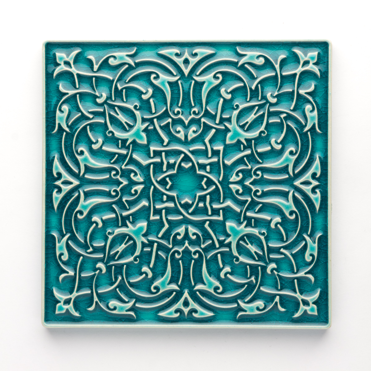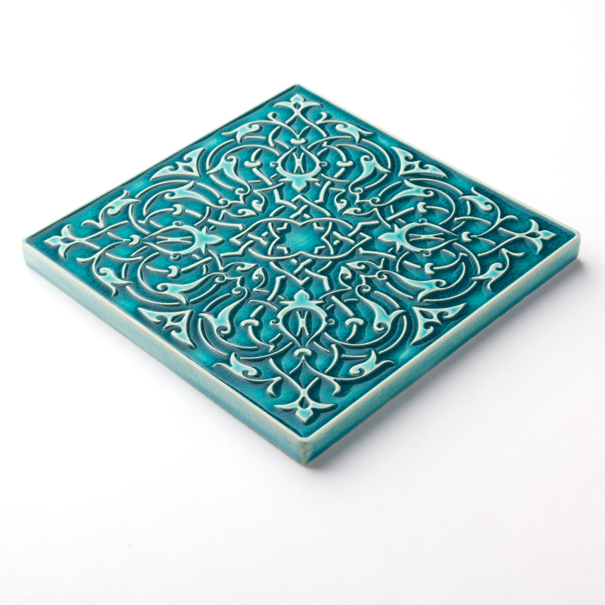 Kafel ceramiczny ręcznie robiony, ścienny z lekko wypukłym, misternym ornamentem. Wykonany z jasnej gliny. Pokryty błyszczącym,  szkliwem, w sposób który odpowiednio podkreśla ozdobny wzór arabeskowej powierzchni. Dwukrotnie wypalany. Odporny na wodę, ścieranie, wysokie i niskie temperatury. Montaż standardowy.