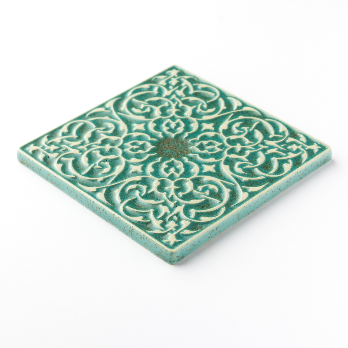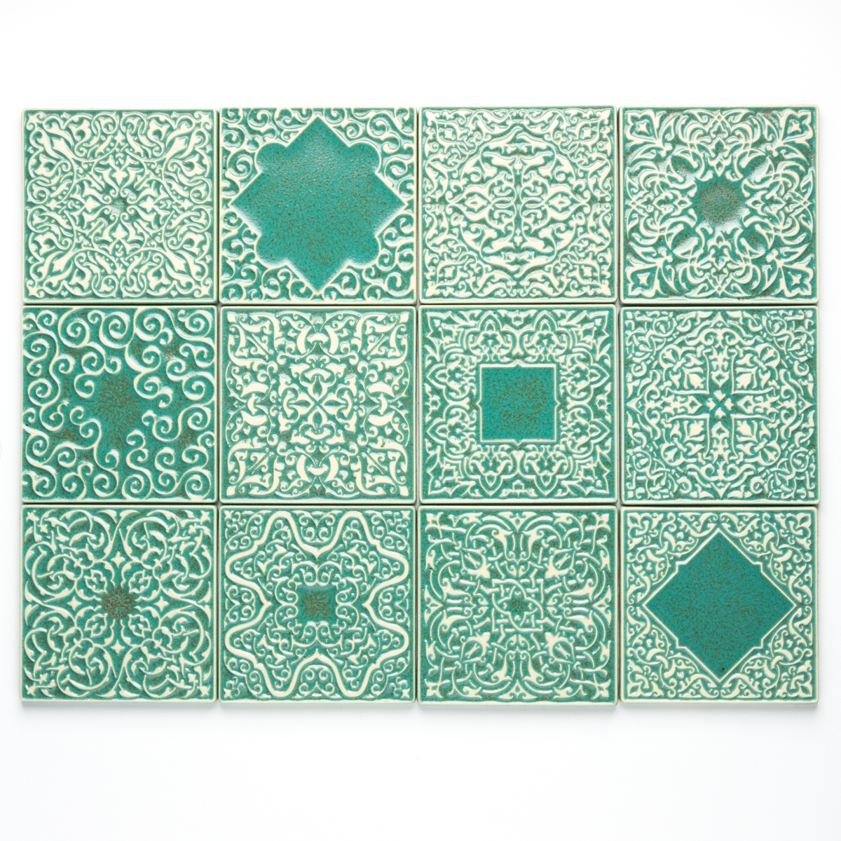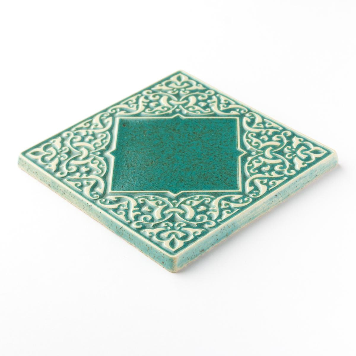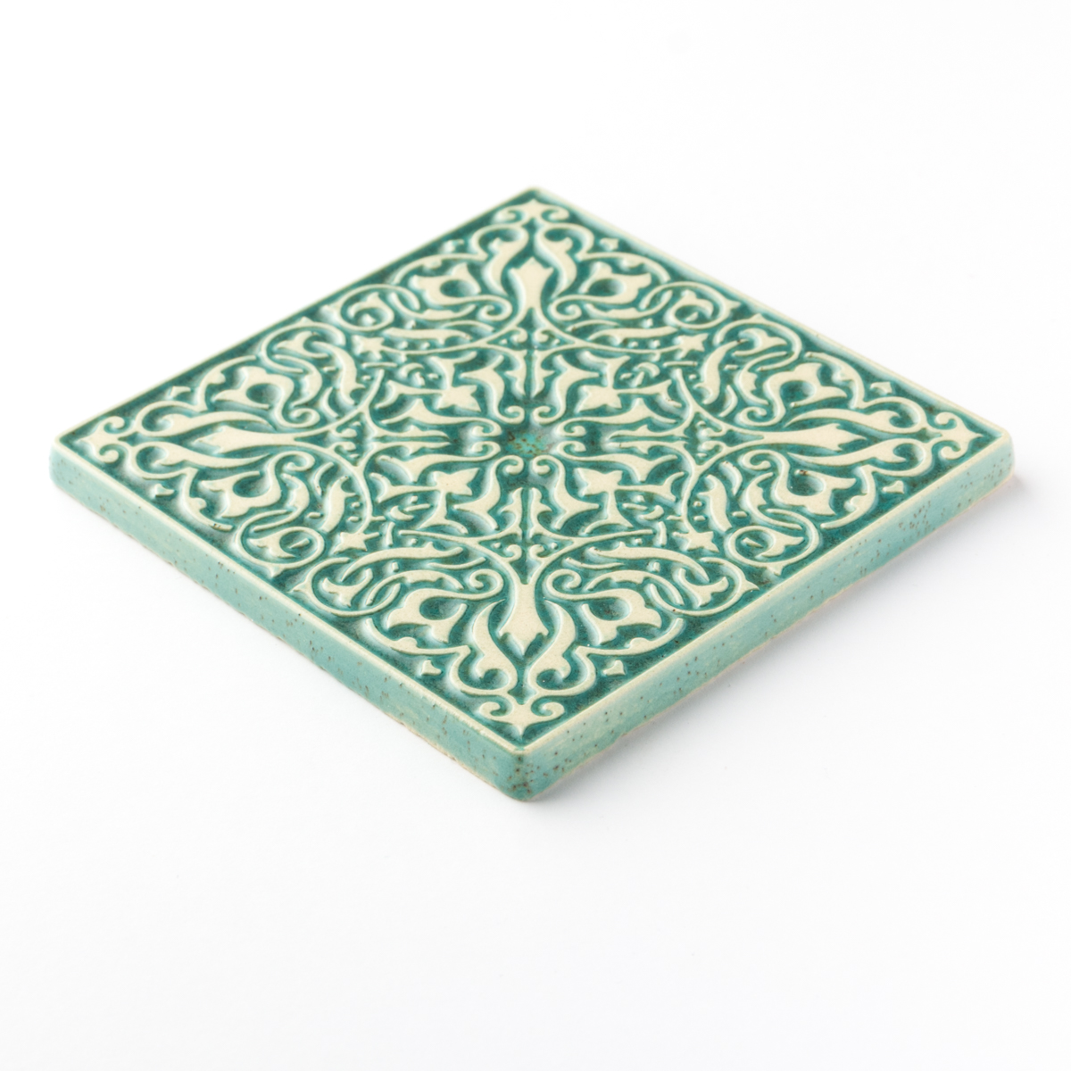 Kafle ceramiczne ręcznie robione, ścienne z lekko wypukłymi, misternymi ornamentami. Wykonane z jasnej gliny. Pokryte satynowym szkliwem, w sposób który odpowiednio podkreśla ozdobny wzór arabeskowej powierzchni. Dwukrotnie wypalane. Odporne na wodę, ścieranie, wysokie i niskie temperatury. Montaż kafli standardowy. Na zamówienie istnieje możliwość wykonania większej ilości podobnych.