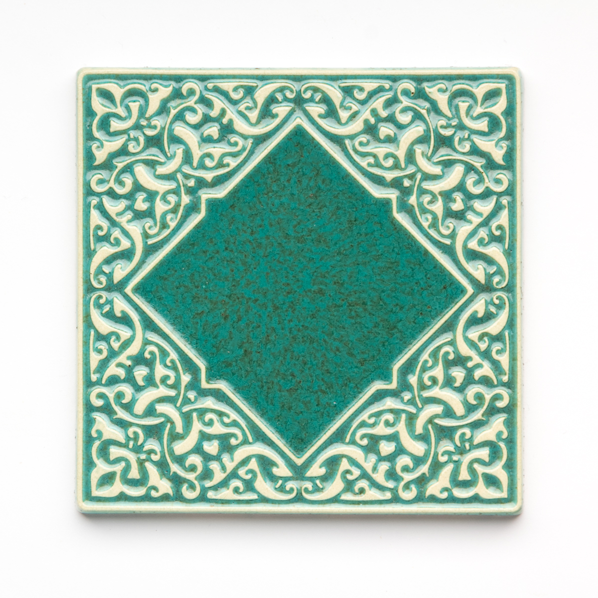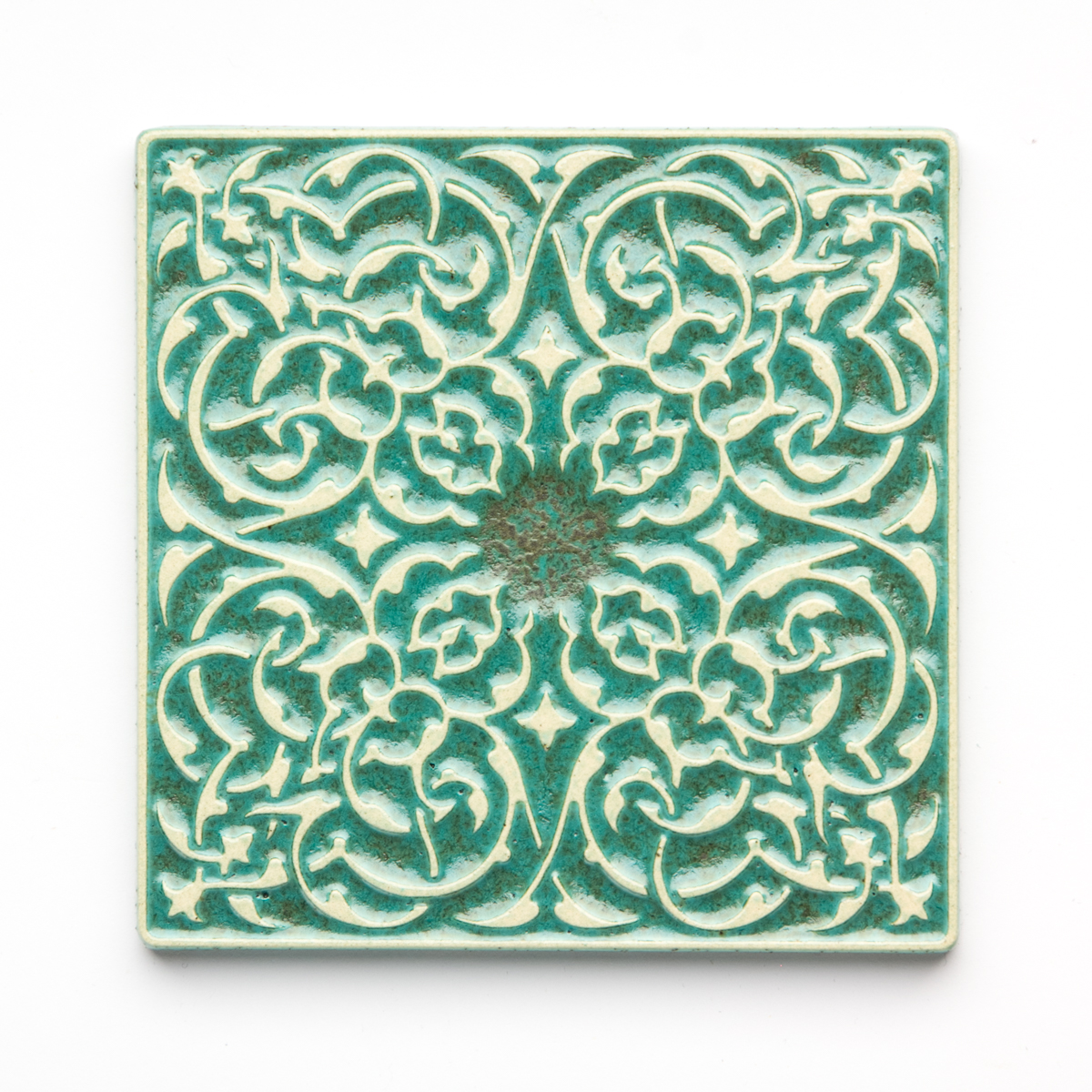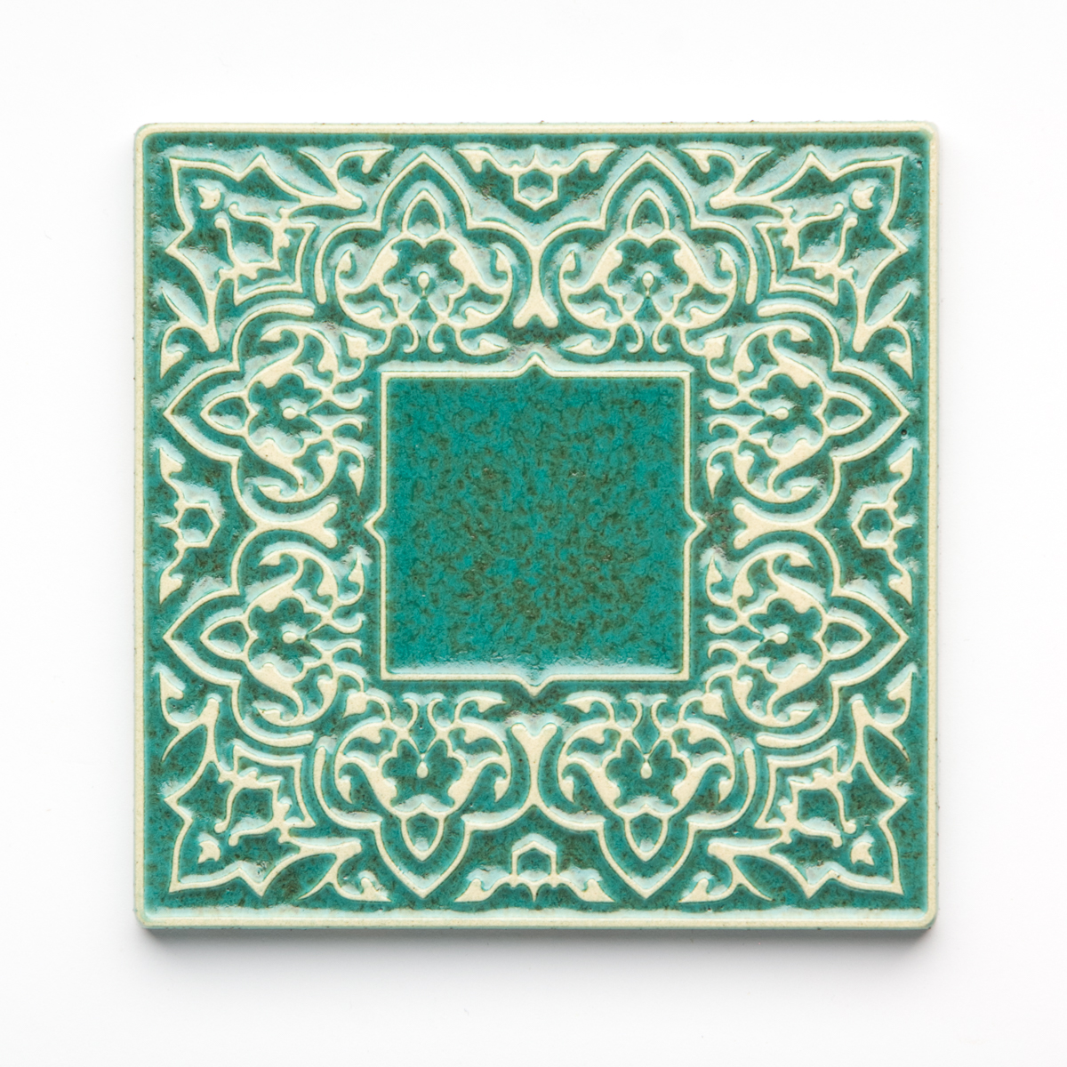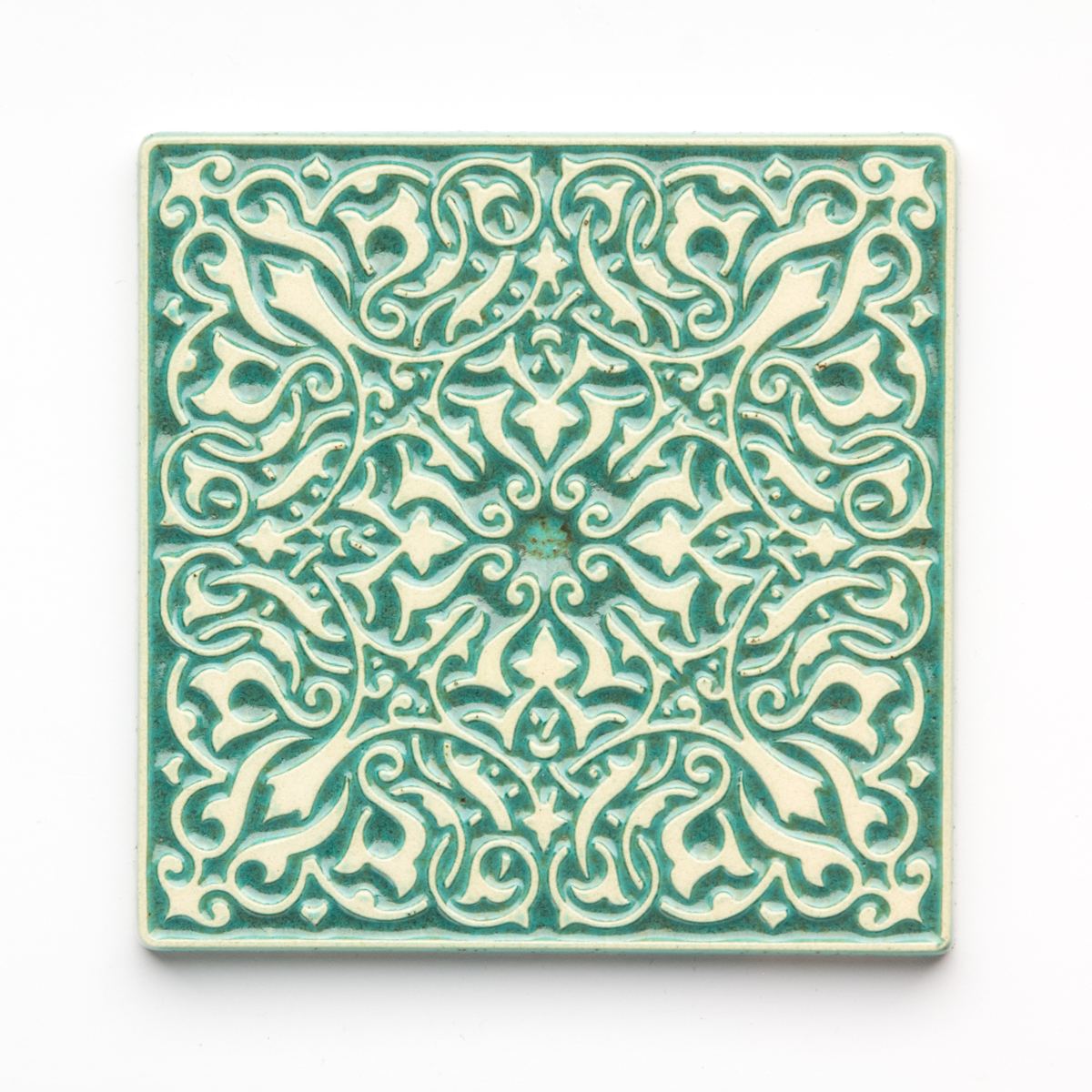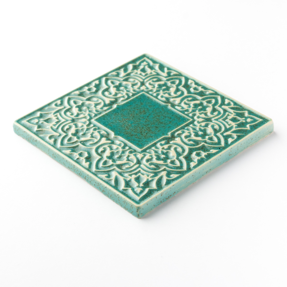 Kafle ceramiczne ręcznie robione, ścienne z lekko wypukłymi, misternymi ornamentami. Wykonane z jasnej gliny. Pokryte satynowym szkliwem, w sposób który odpowiednio podkreśla ozdobny wzór arabeskowej powierzchni. Dwukrotnie wypalane. Odporne na wodę, ścieranie, wysokie i niskie temperatury. Montaż kafli standardowy. Na zamówienie istnieje możliwość wykonania większej ilości podobnych.