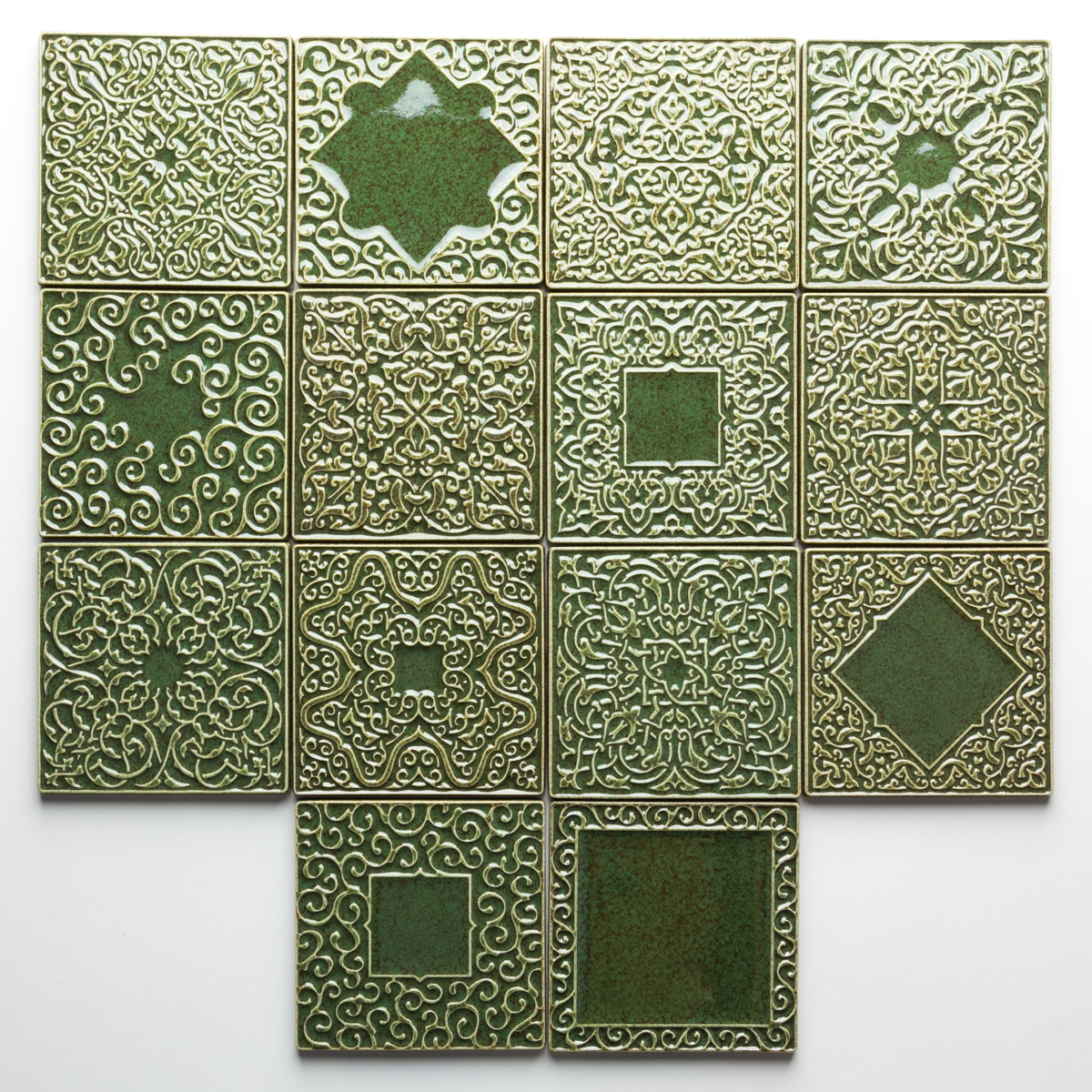 Kafle ceramiczne ręcznie robione, ścienne z lekko wypukłymi, misternymi ornamentami. Wykonane z jasnej gliny. Pokryte błyszczącym szkliwem, w sposób który odpowiednio podkreśla ozdobny wzór arabeskowej powierzchni. Dwukrotnie wypalane. Odporne na wodę, ścieranie, wysokie i niskie temperatury. Montaż kafli standardowy. Na zamówienie istnieje możliwość wykonania większej ilości podobnych.