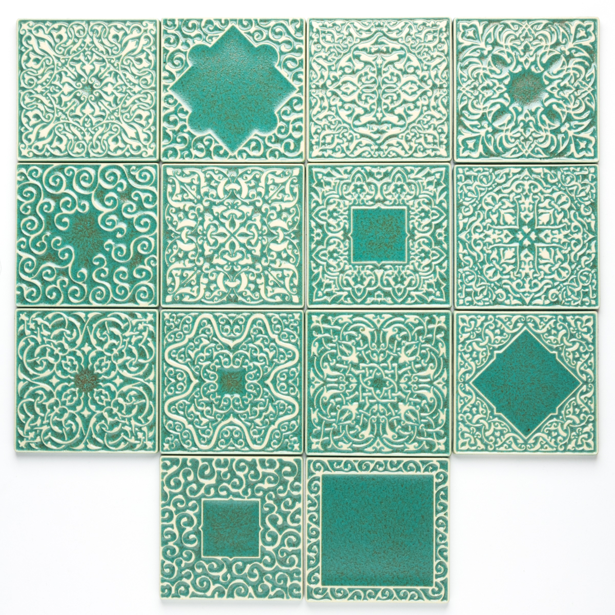 Kafle ceramiczne ręcznie robione, ścienne z lekko wypukłymi, misternymi ornamentami. Wykonane z jasnej gliny. Pokryte satynowym, turkusowym szkliwem, w sposób który odpowiednio podkreśla ozdobny wzór arabeskowej powierzchni. Dwukrotnie wypalane. Odporne na wodę, ścieranie, wysokie i niskie temperatury. Montaż kafli standardowy. Na zamówienie istnieje możliwość wykonania większej ilości podobnych.