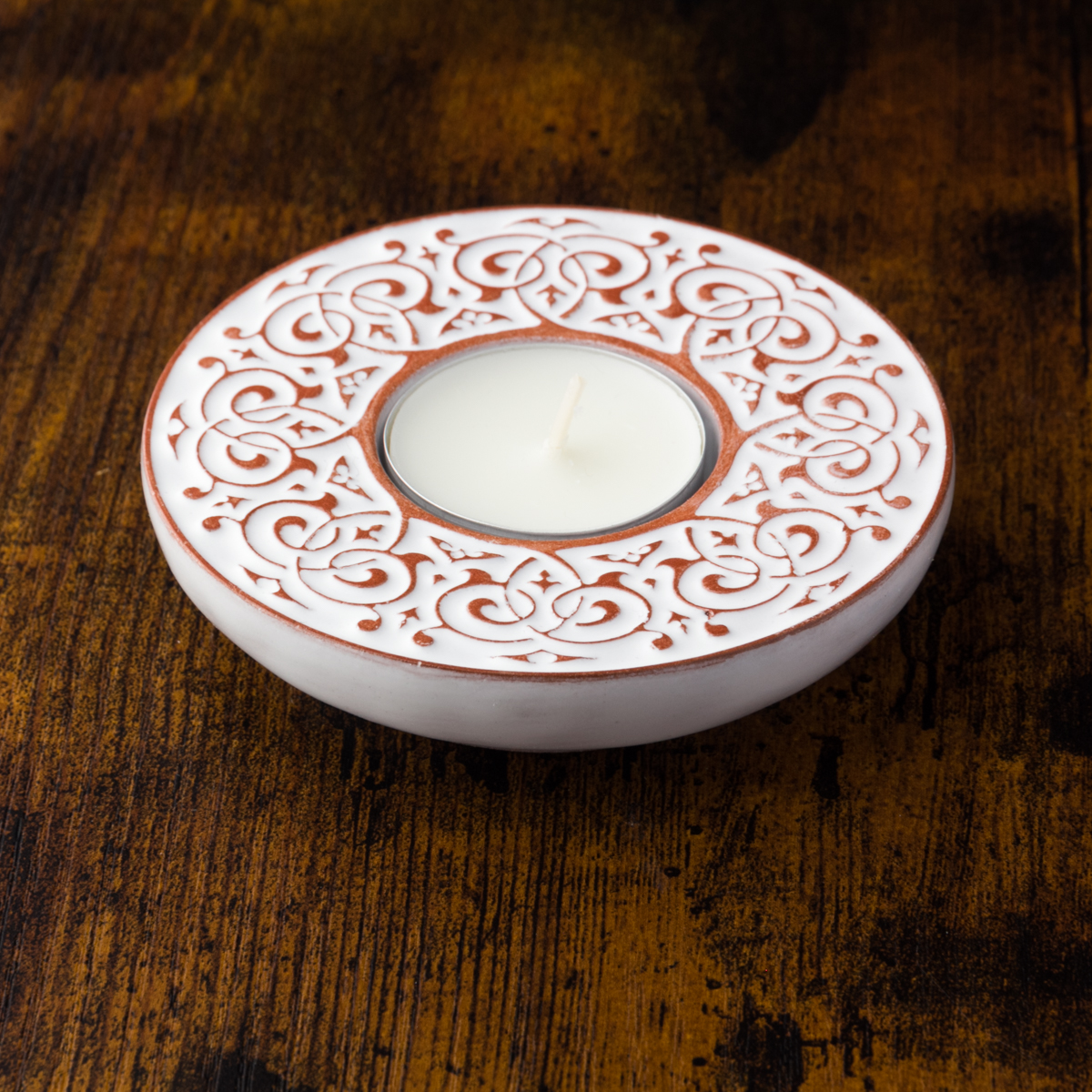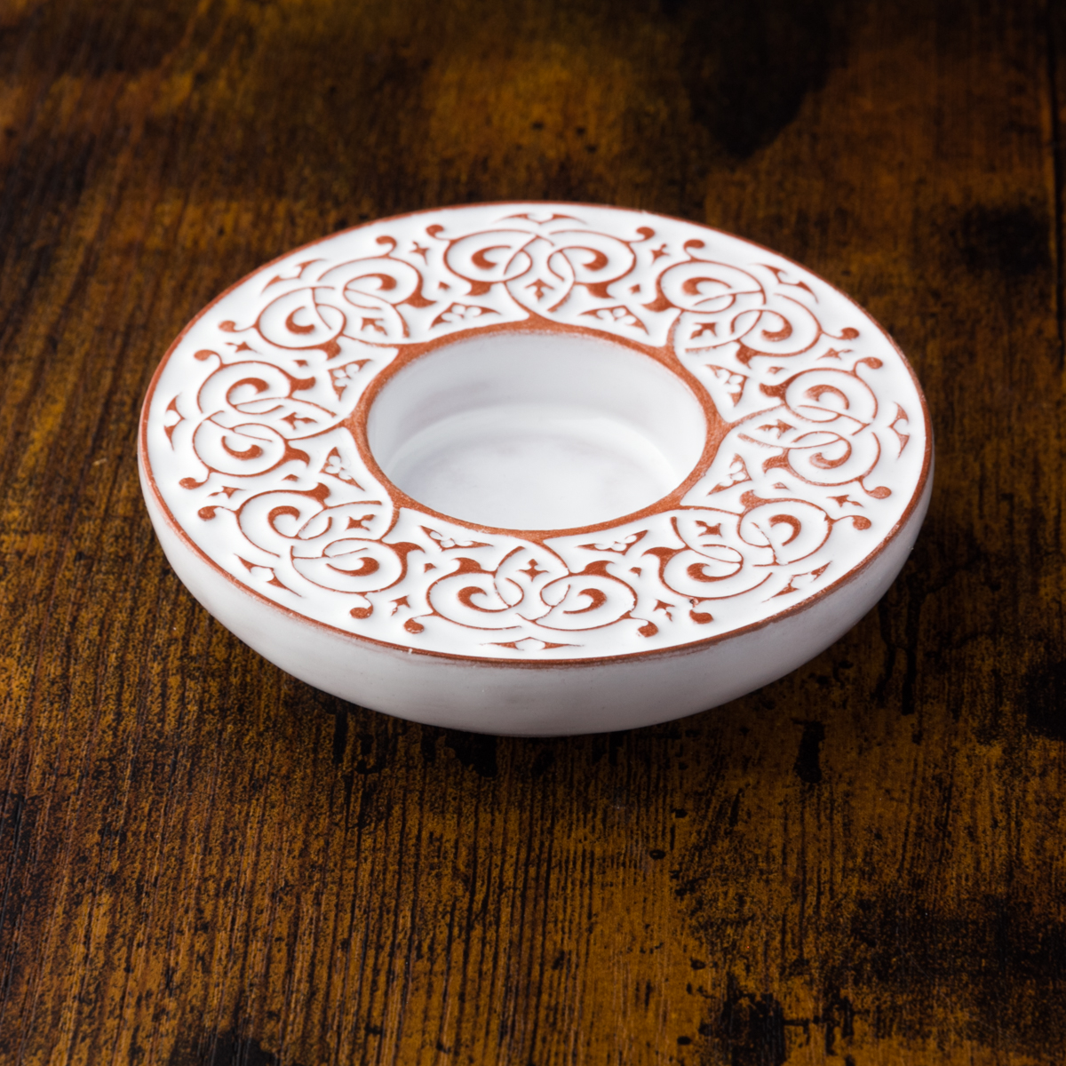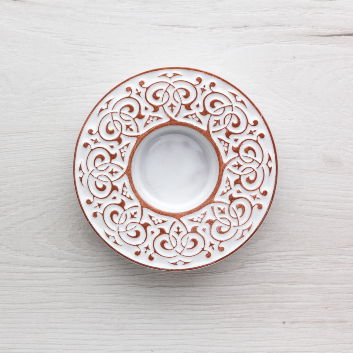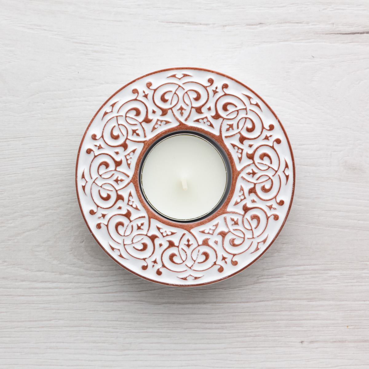 Ręcznie wykonany, ceramiczny, okrągły, biały lampion-świecznik z misternym, lekko wypukłym, brązowym ornamentem.