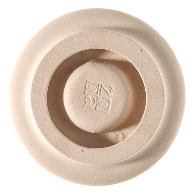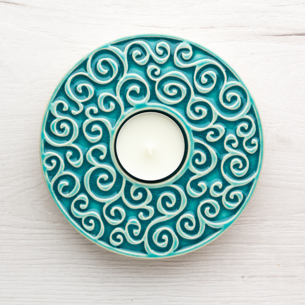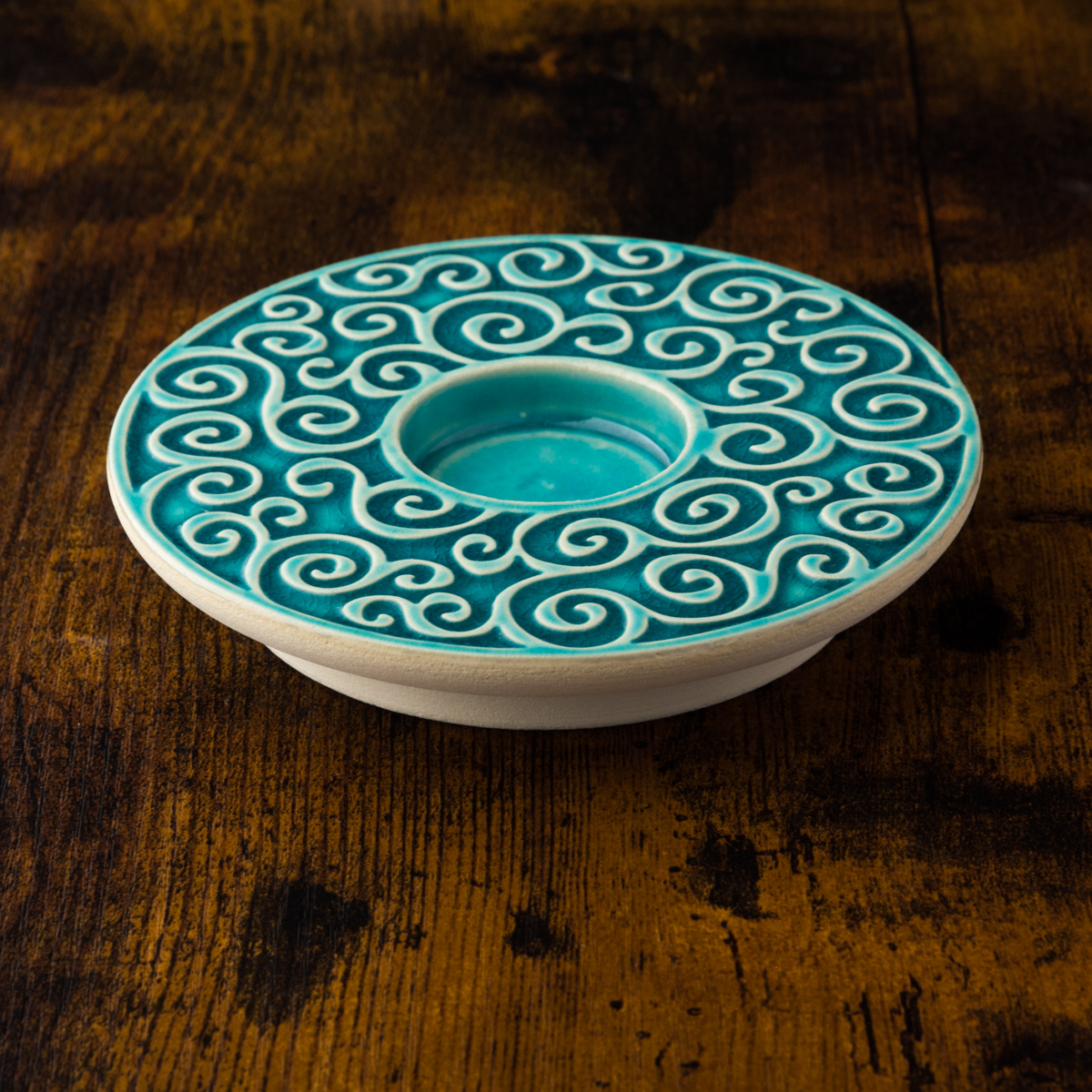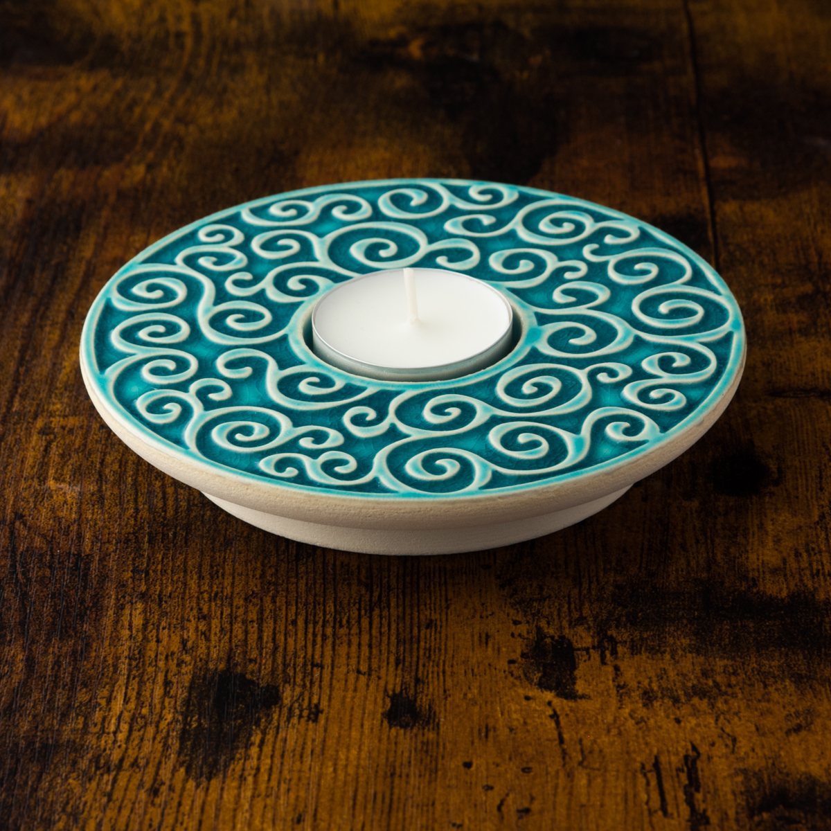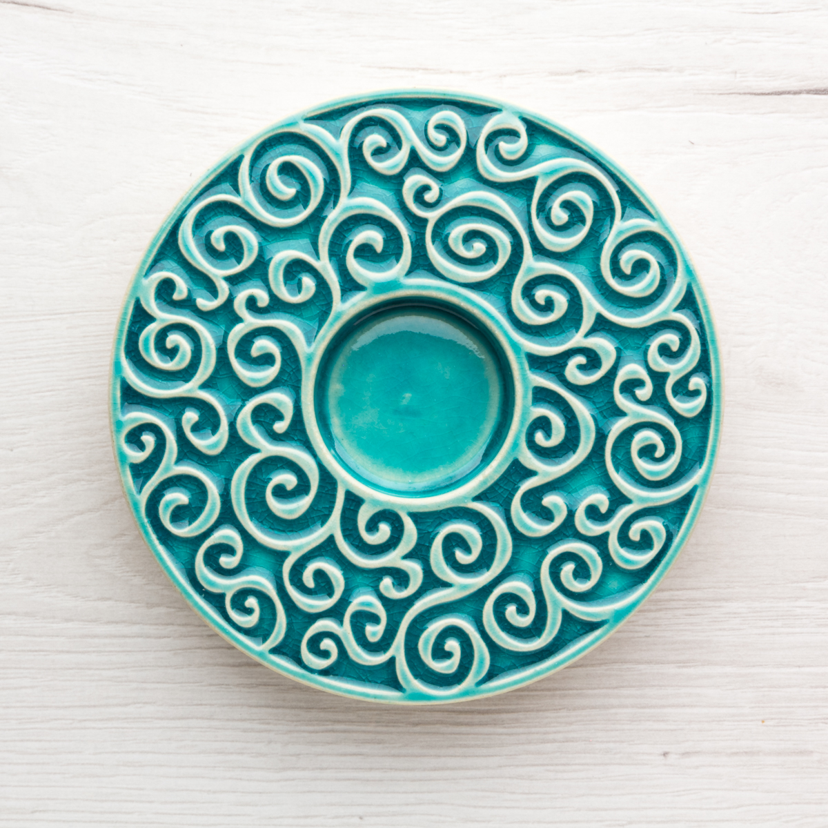 Ceramiczny lampion (świecznik) z dekoracyjnym, lekko wypukłym ornamentem. Ręcznie wykonany z jasnej gliny, górna powierzchnia i wnętrze pokryte błyszczącym szkliwem.