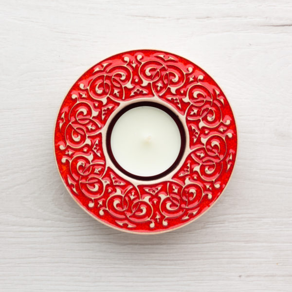 Ceramiczny lampion (świecznik) z misternym, lekko wypukłym geometrycznym ornamentem. Wykonany z jasnej gliny, górna powierzchnia i wnętrze pokryte błyszczącym szkliwem.