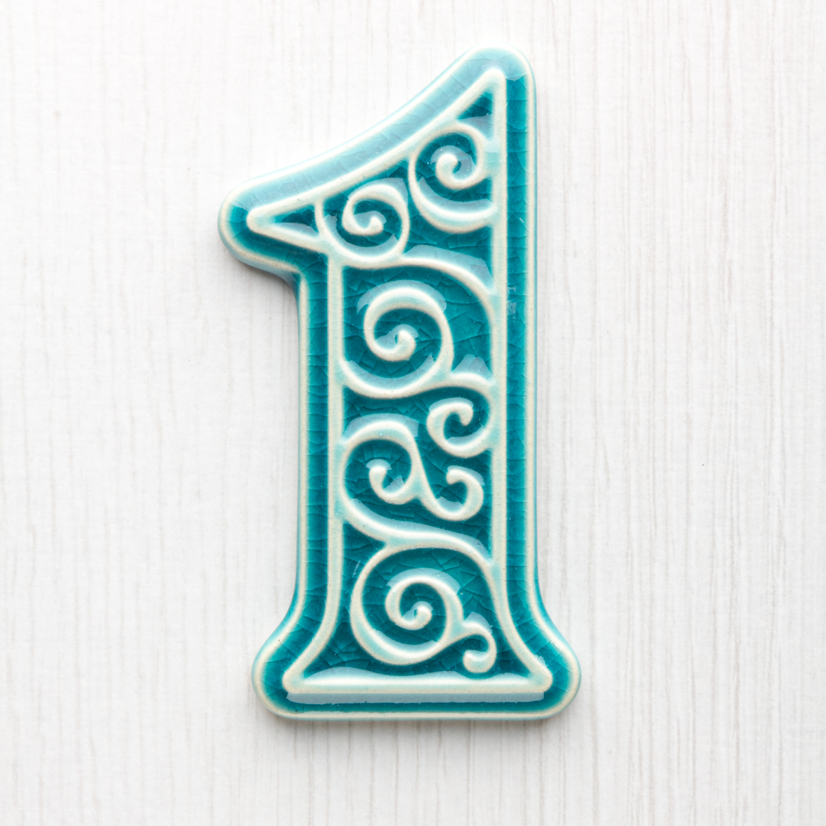 Ceramiczna cyfra z ozdobnym, lekko wypukłym ornamentem, do zamocowania na drzwi mieszkania lub domu. Wykonana z jasnej gliny, pokryta błyszczącym szkliwem. Dwukrotnie wypalana w wysokiej temperaturze.