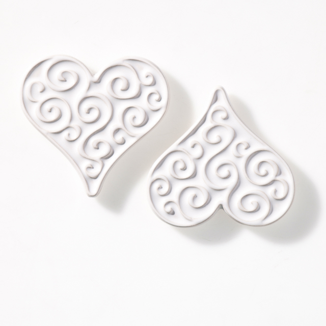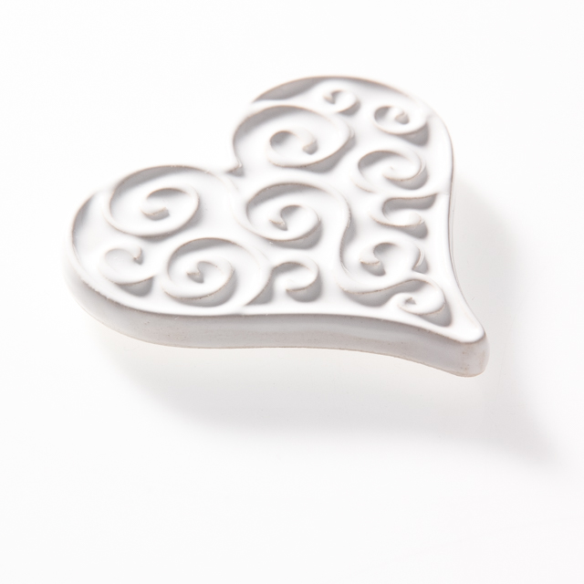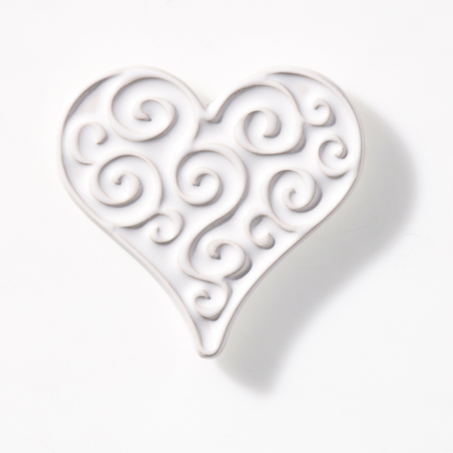 Ceramiczne, ornamentowe serce z naklejonym od spodu okrągłym, bardzo silnym magnesem. Wykonane z jasnej gliny, pokryte błyszczącym szkliwem.