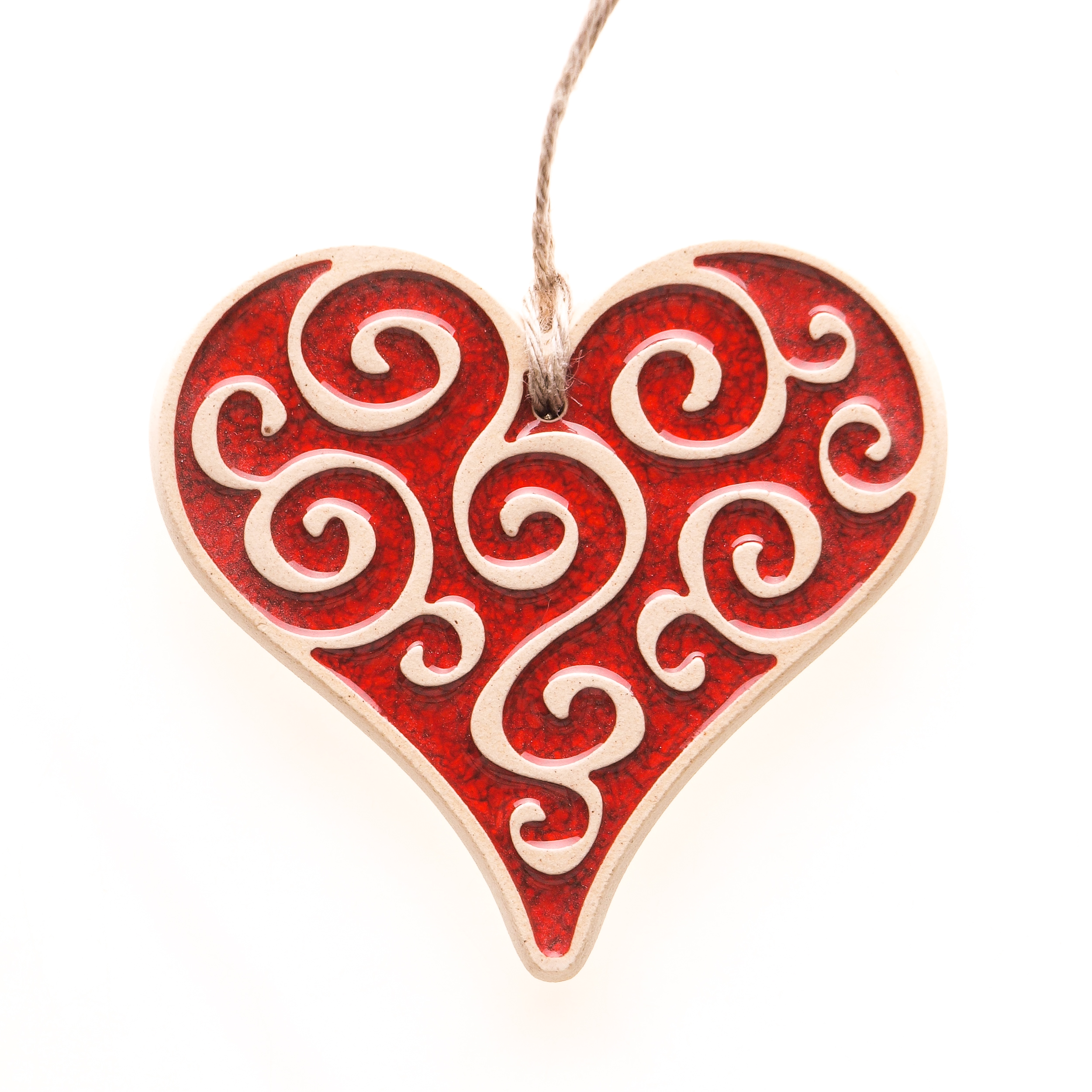 Ceramiczne, ornamentowe serce do zawieszenia np. na choince. Wykonane z jasnej gliny, jednostronnie pokryte błyszczącym, czerwonym szkliwem. Polecam serdecznie.