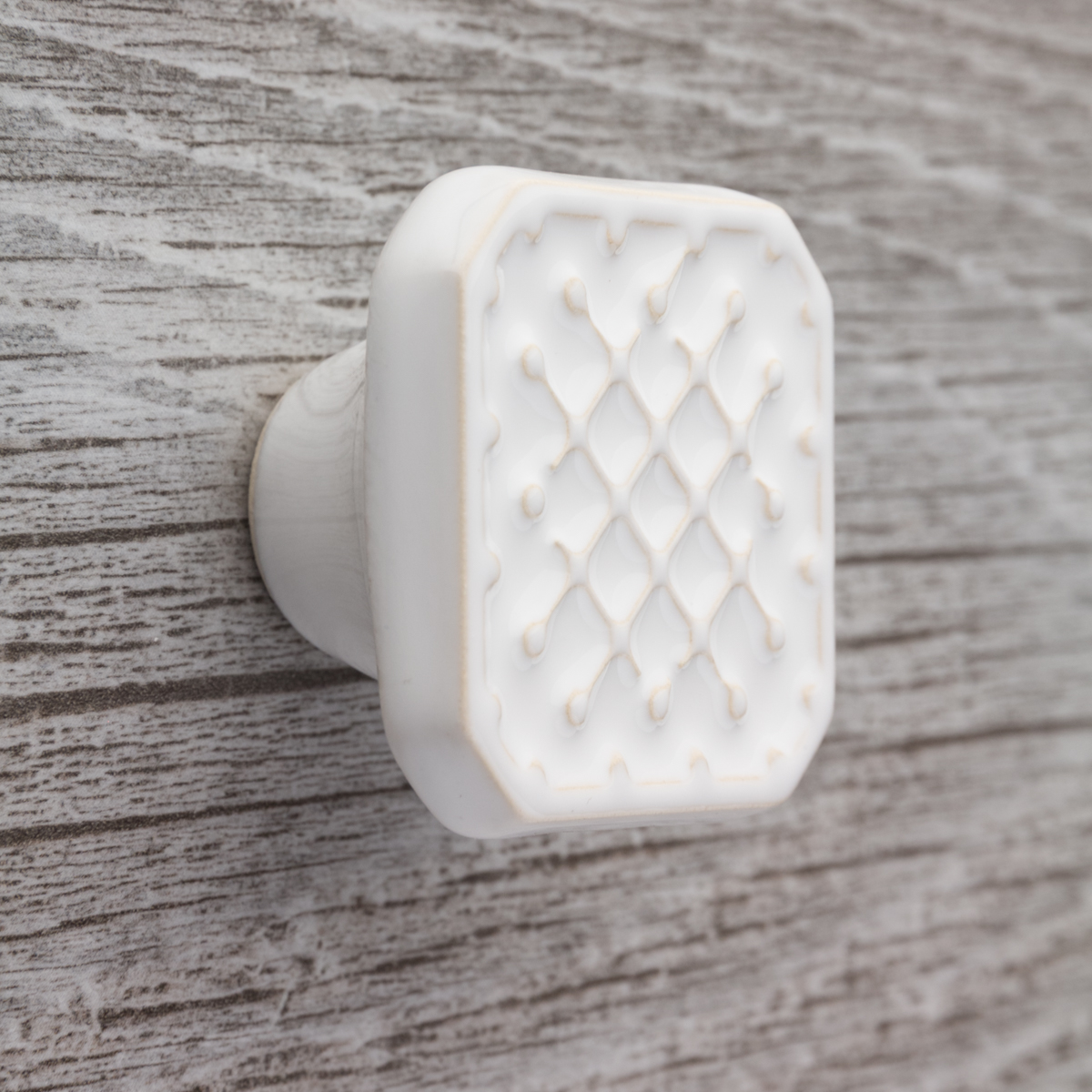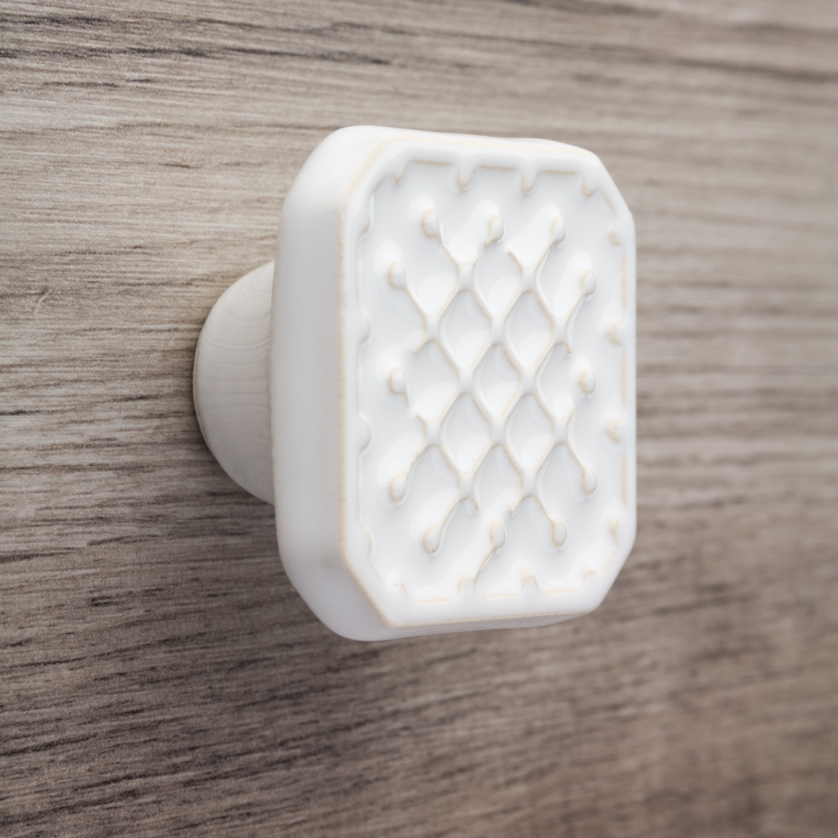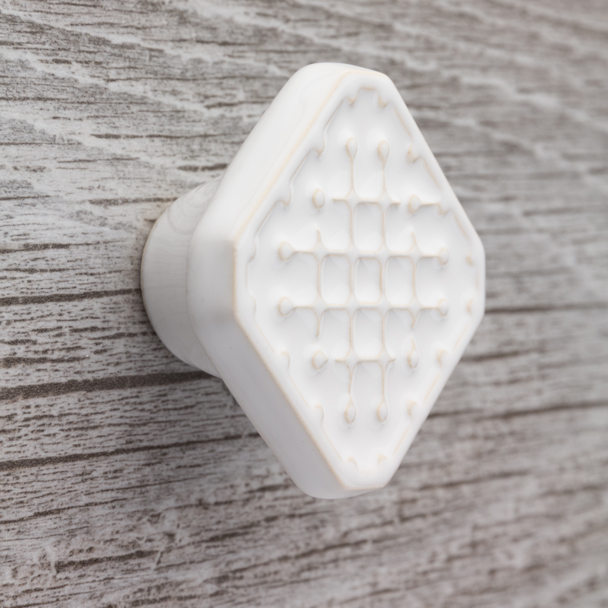 Ceramiczna gałka do mebli z lekko wypukłym ornamentem. Ręcznie wykonana z jasnej gliny, pokryta błyszczącym szkliwem.