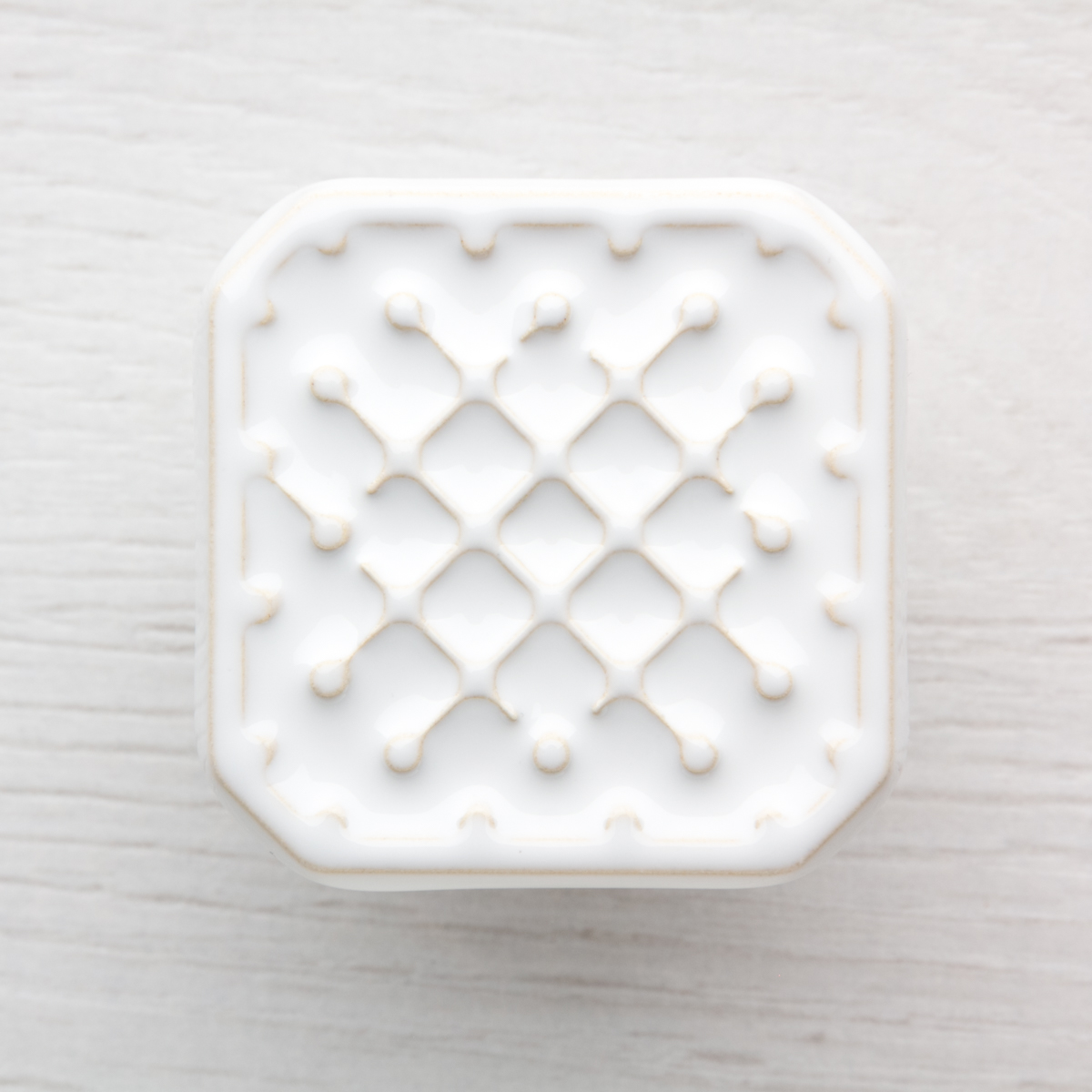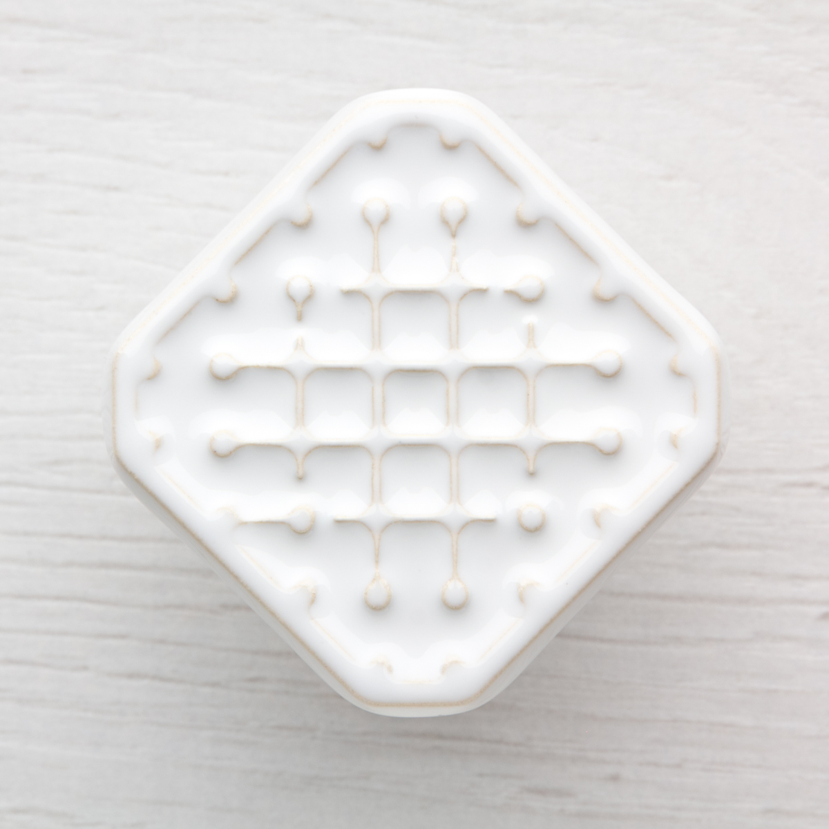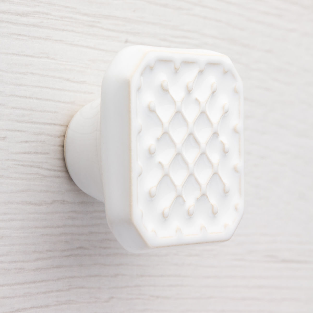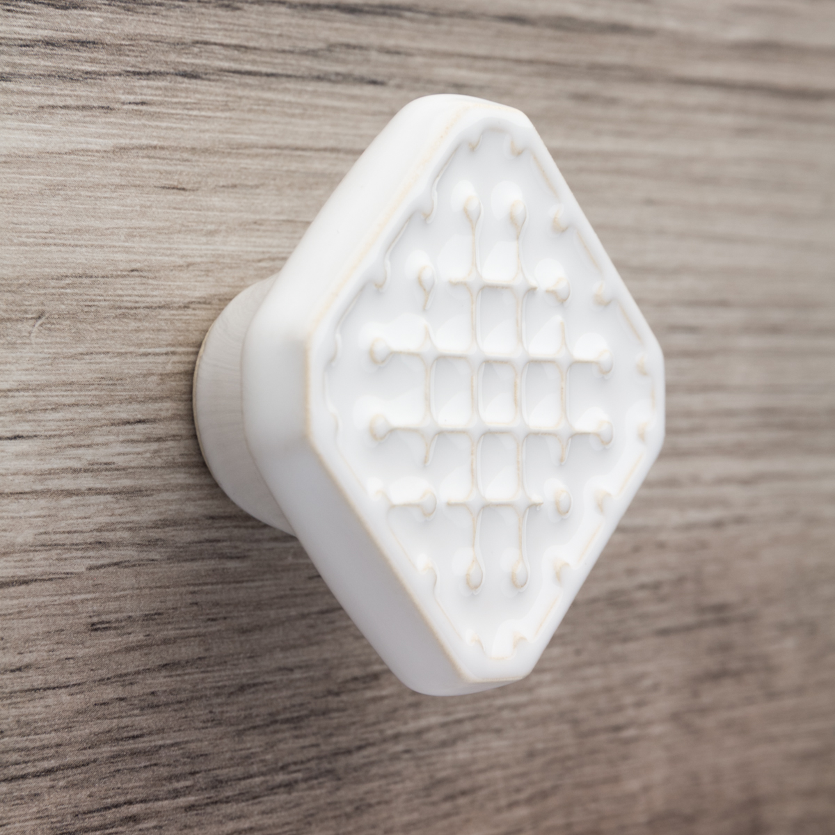 Ceramiczna gałka do mebli z lekko wypukłym ornamentem. Ręcznie wykonana z jasnej gliny, pokryta błyszczącym szkliwem.
