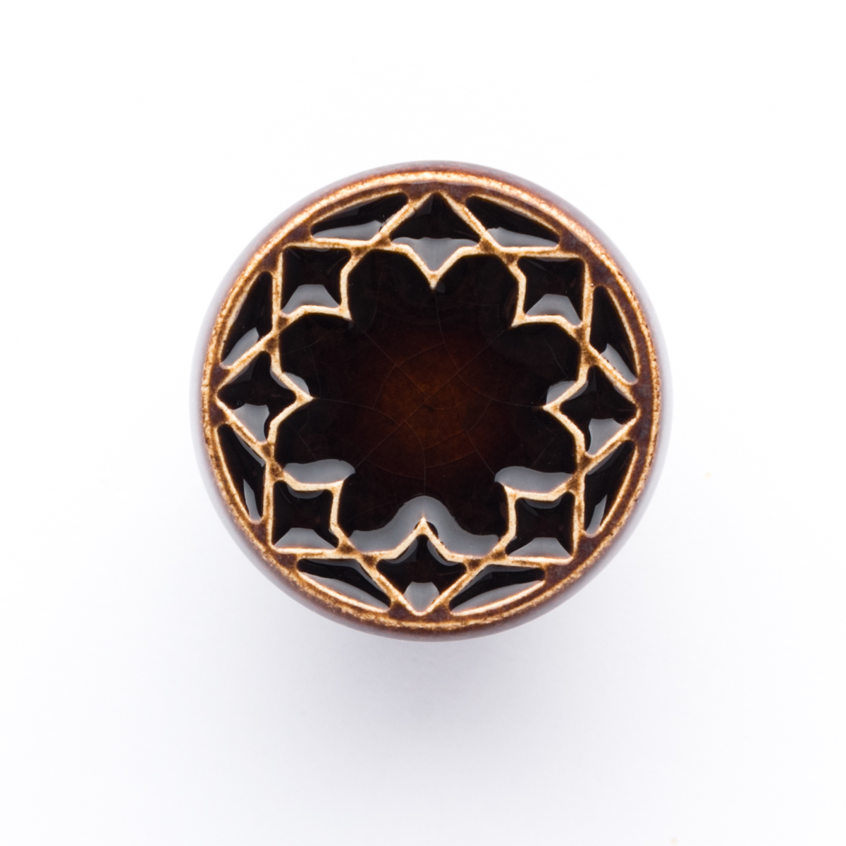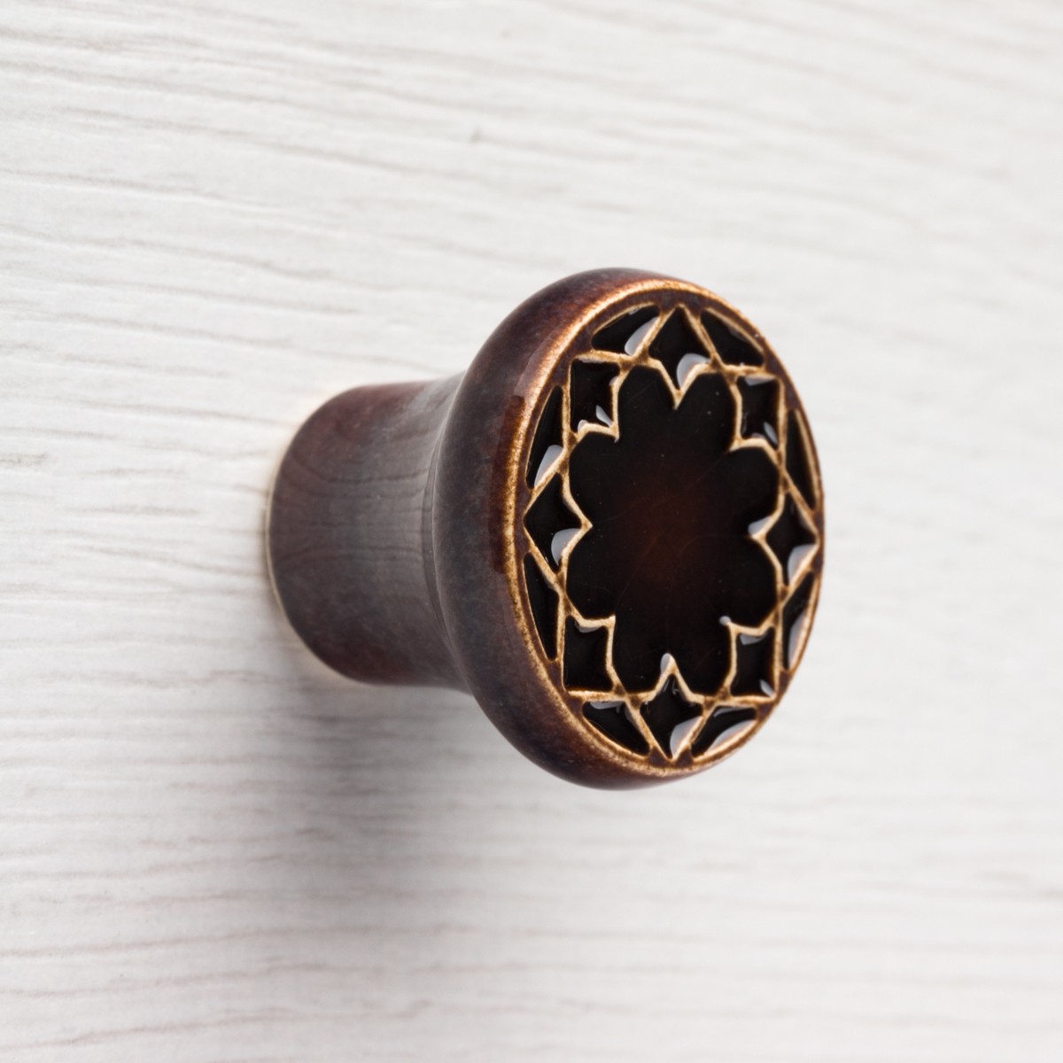 Ceramiczna gałka do mebli z lekko wypukłym ornamentem. Ręcznie wykonana z jasnej gliny, pokryta błyszczącym szkliwem. Twoje meble zyskają nowy, niepowtarzalny, jedyny w swoim rodzaju wygląd.