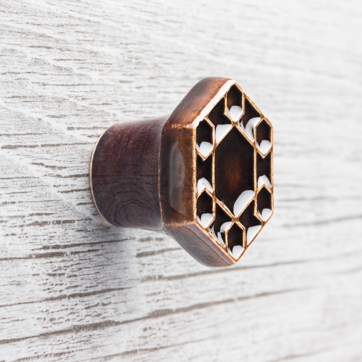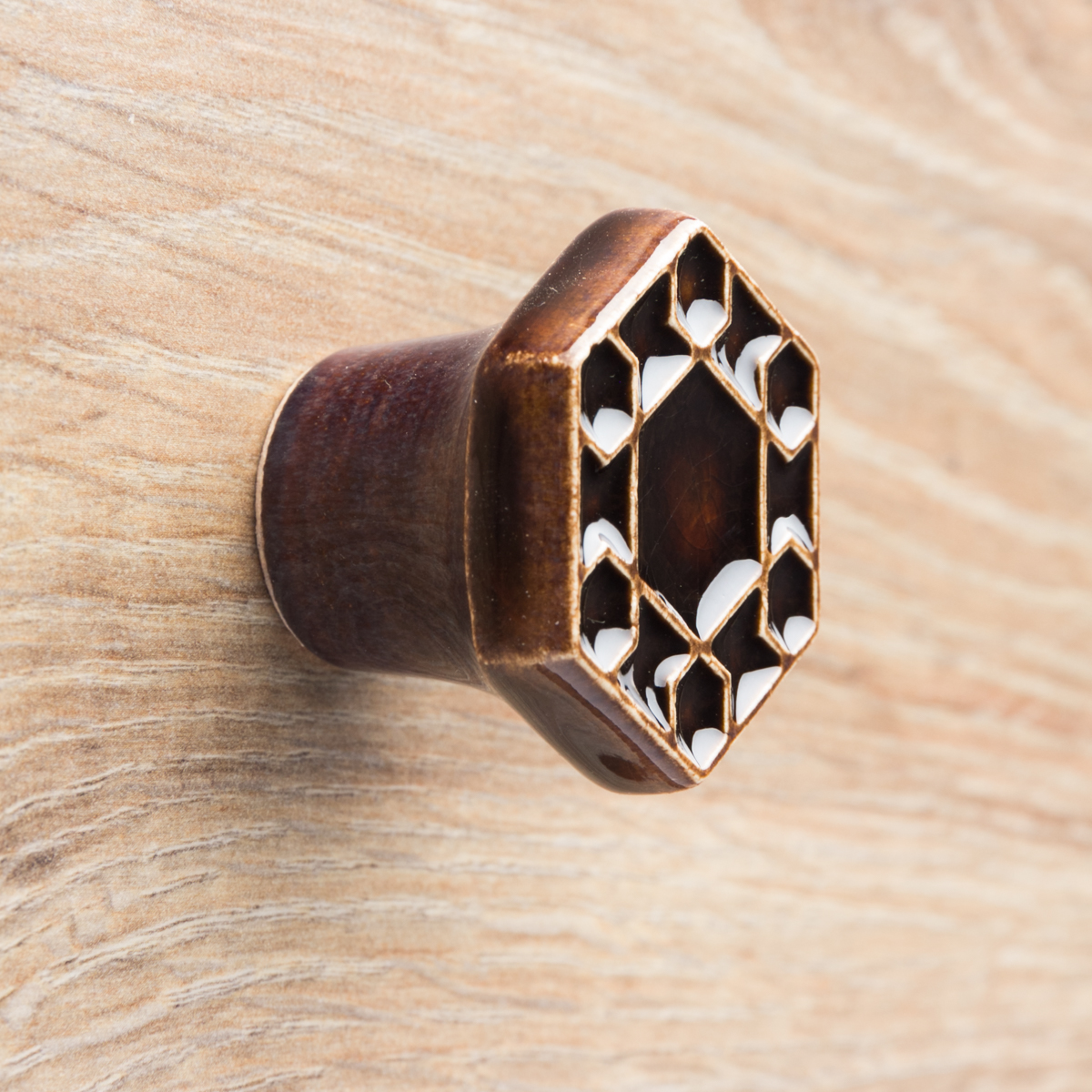 Ceramiczna gałka do mebli z lekko wypukłym ornamentem. Ręcznie wykonana z jasnej gliny, pokryta błyszczącym szkliwem. Twoje meble zyskają nowy, niepowtarzalny, jedyny w swoim rodzaju wygląd.