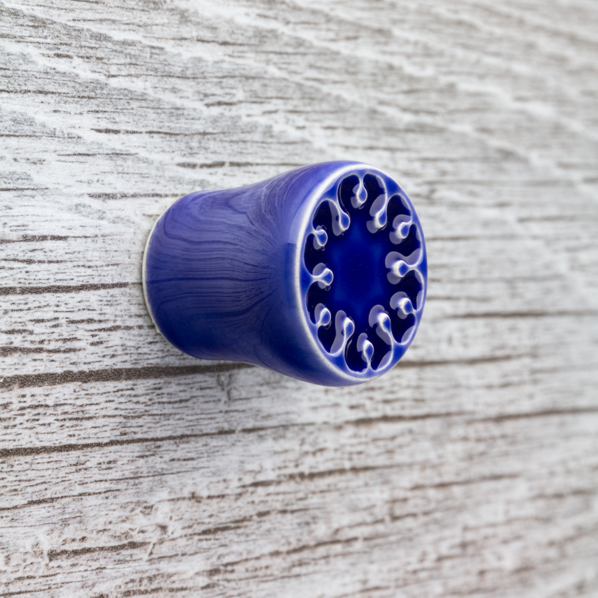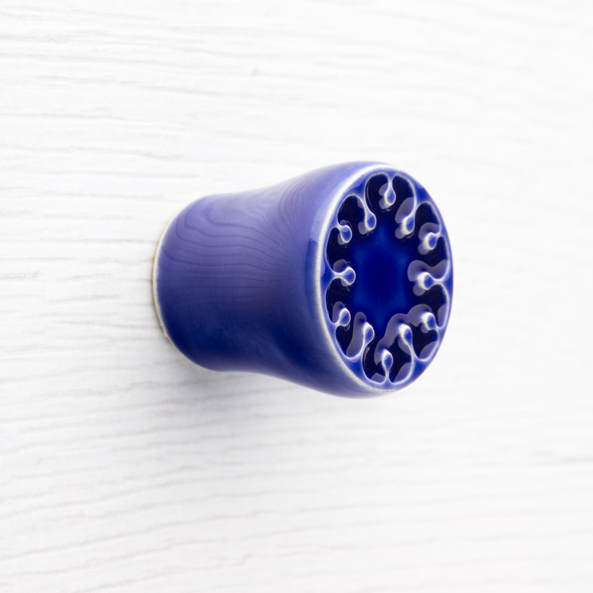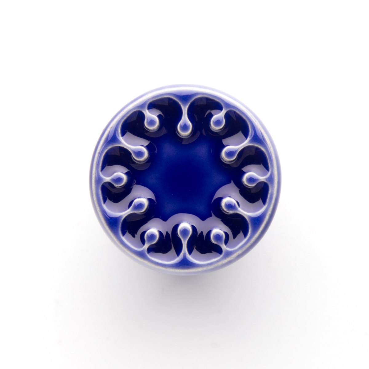 Ceramiczna ręcznie zrobiona gałka do mebli, z lekko wypukłym ornamentem. Wykonana z jasnej gliny, pokryta błyszczącym szkliwem, wypalona dwukrotnie w wysokiej temperaturze.