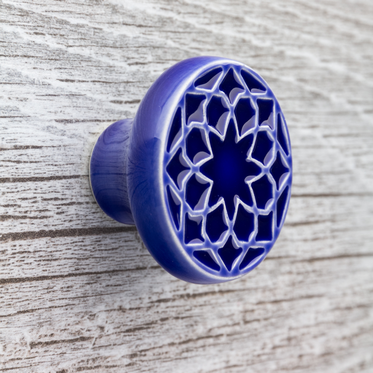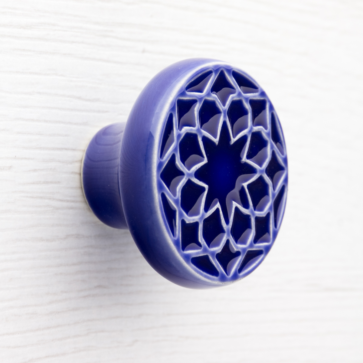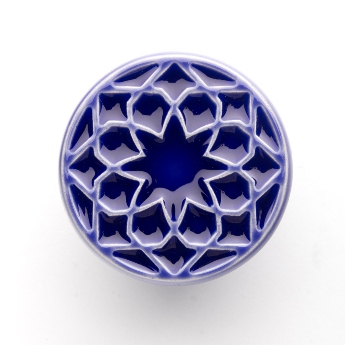 Ceramiczna gałka do mebli z lekko wypukłym ornamentem. Ręcznie wykonana z jasnej gliny, pokryta błyszczącym, ciemnoniebieskim szkliwem.