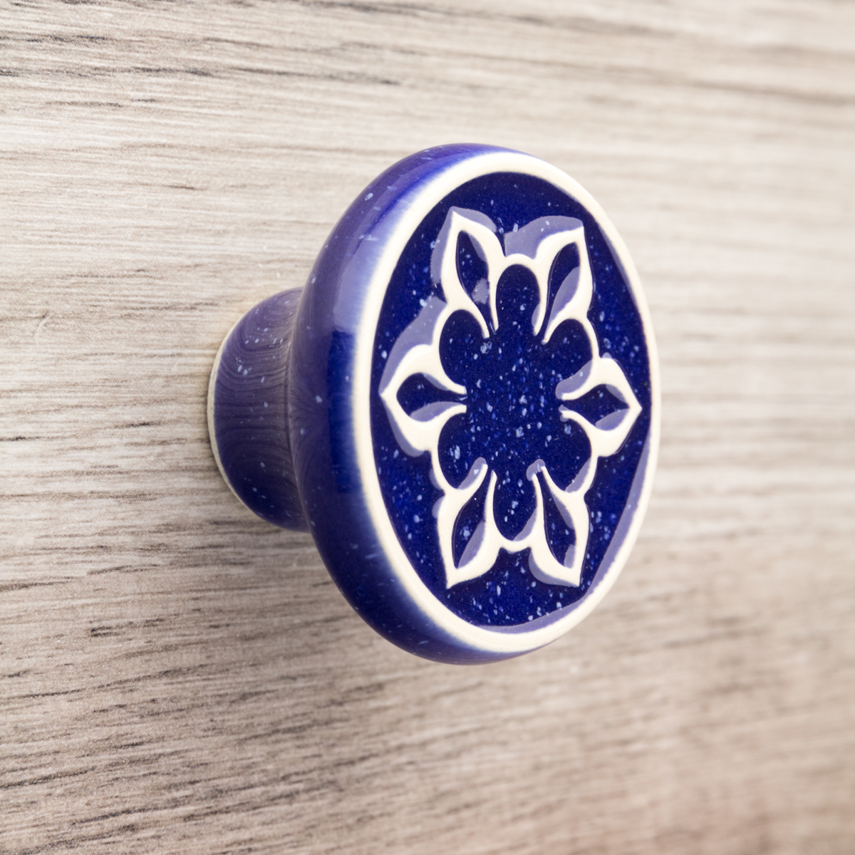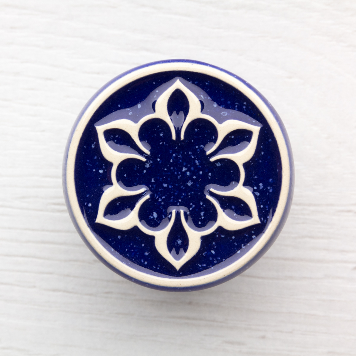 Ceramiczna, ornamentowa gałka do mebli – ręcznie wykonana z jasnej gliny, pokryta błyszczącym, ciemnoniebieskim szkliwem.