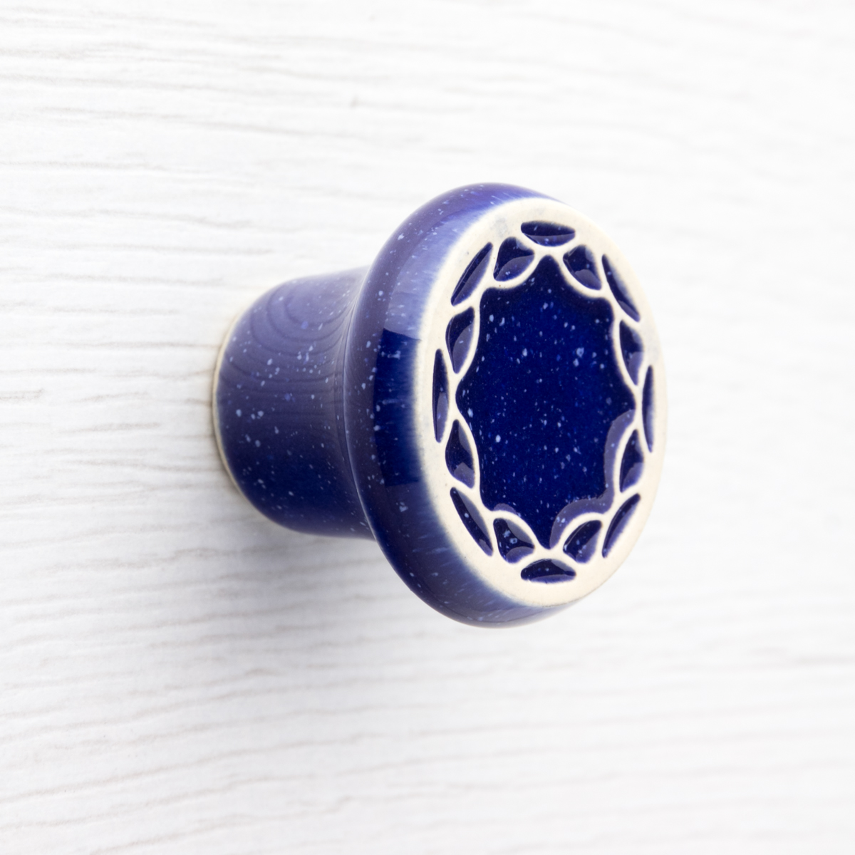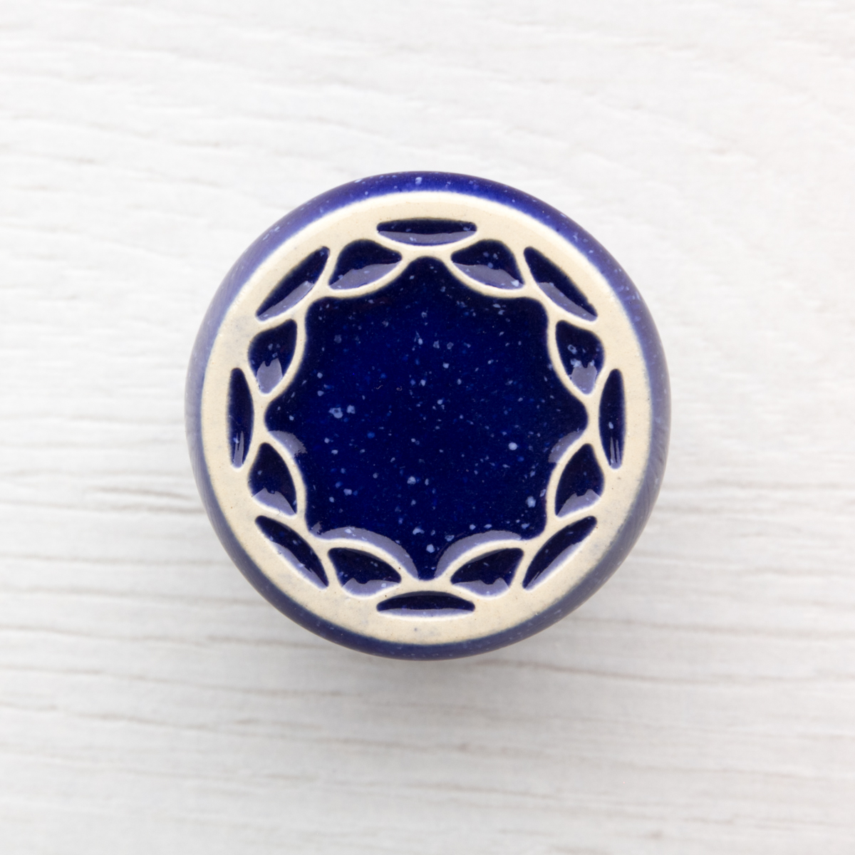 Okrągła, ceramiczna gałka do mebli z lekko wypukłym ornamentem. Ręcznie wykonana z jasnej gliny, pokryta błyszczącym szkliwem. Twoje meble zyskają nowy, niepowtarzalny, jedyny w swoim rodzaju wygląd.
