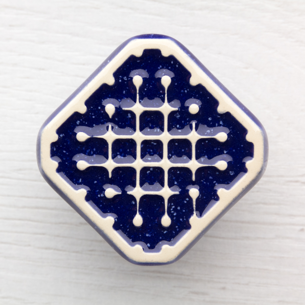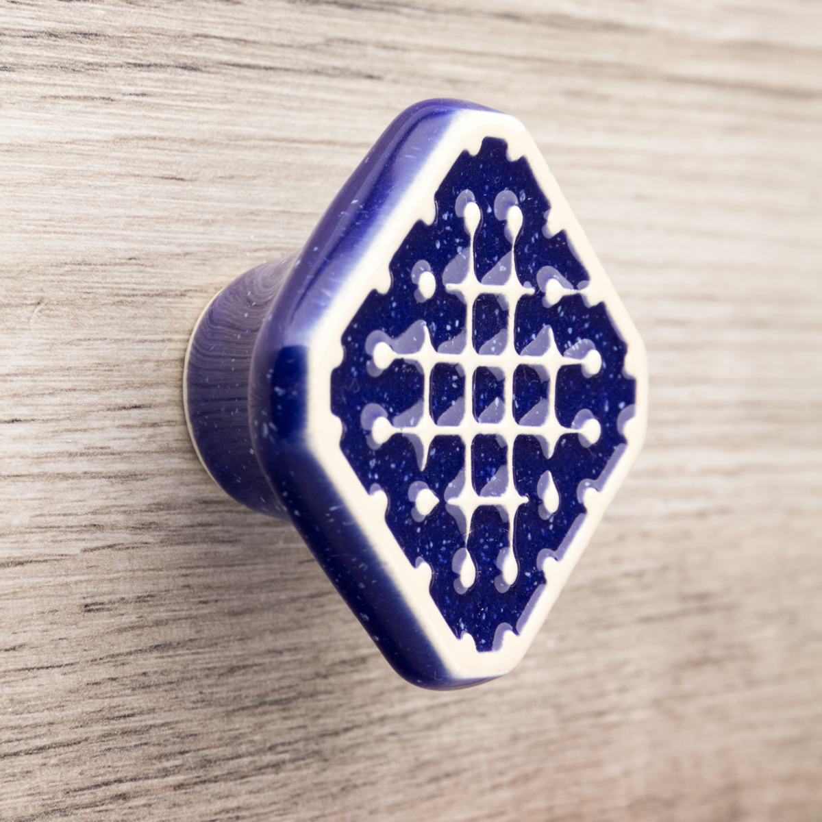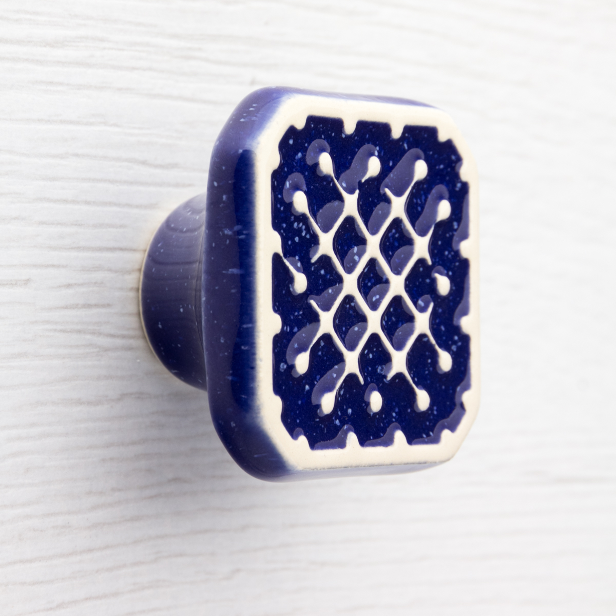 Ceramiczna gałka do mebli z lekko wypukłym ornamentem. Ręcznie wykonana z jasnej gliny, pokryta błyszczącym szkliwem.