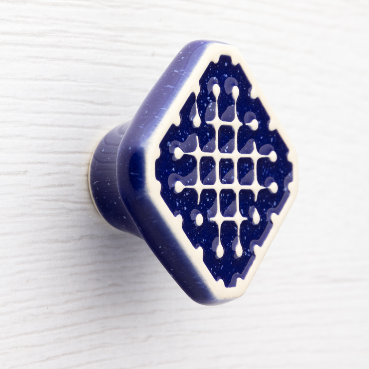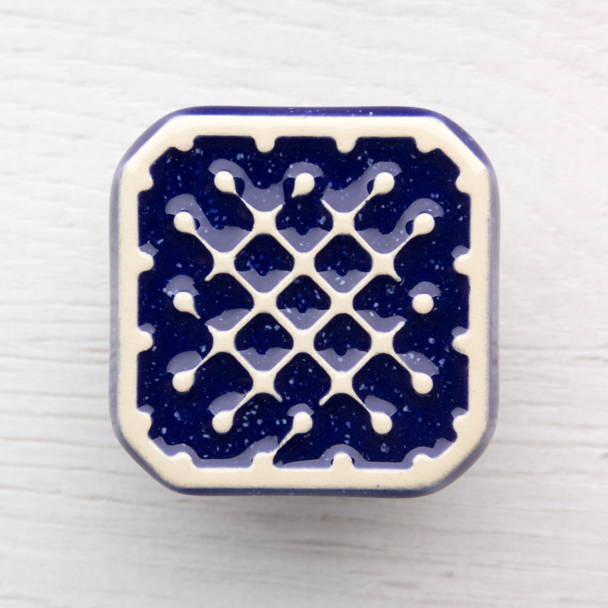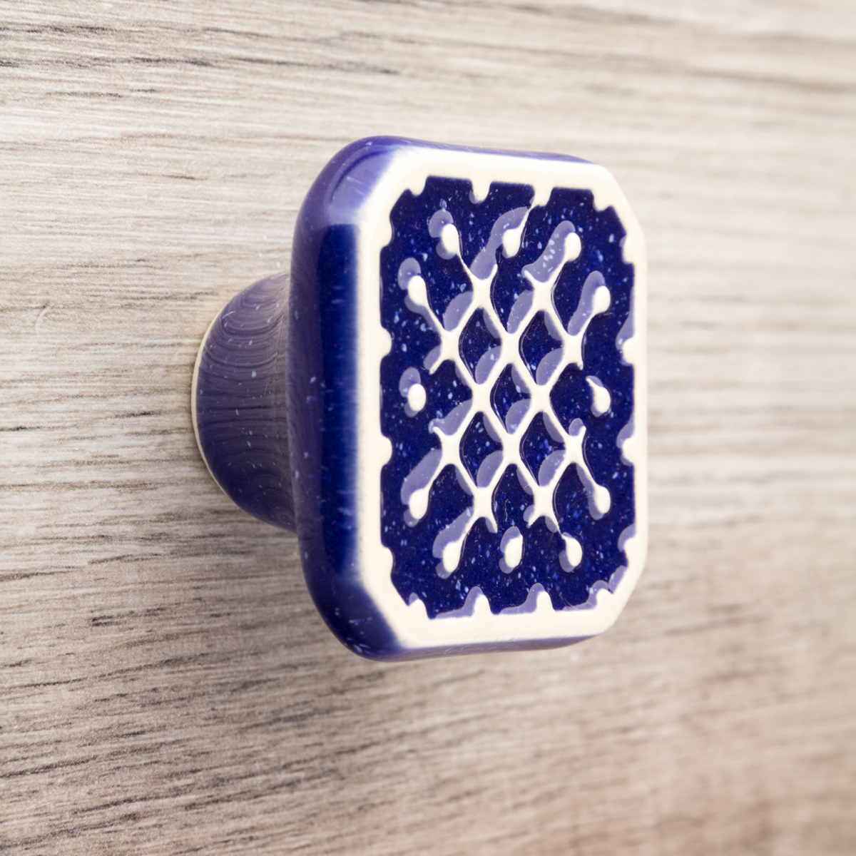 Ceramiczna gałka do mebli z lekko wypukłym ornamentem. Ręcznie wykonana z jasnej gliny, pokryta błyszczącym szkliwem.