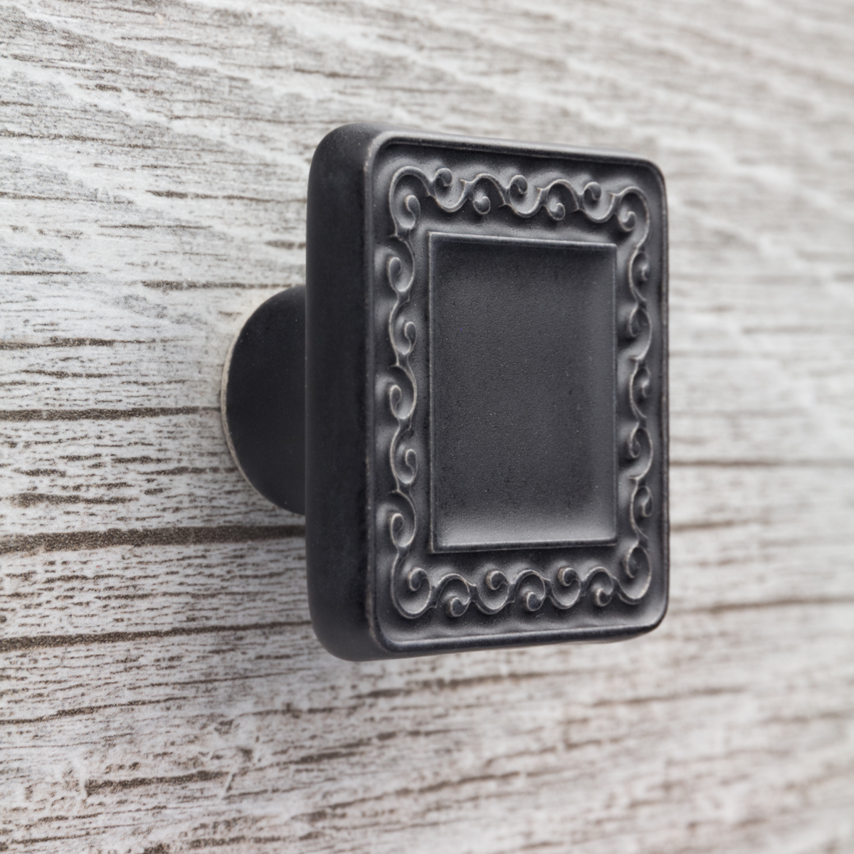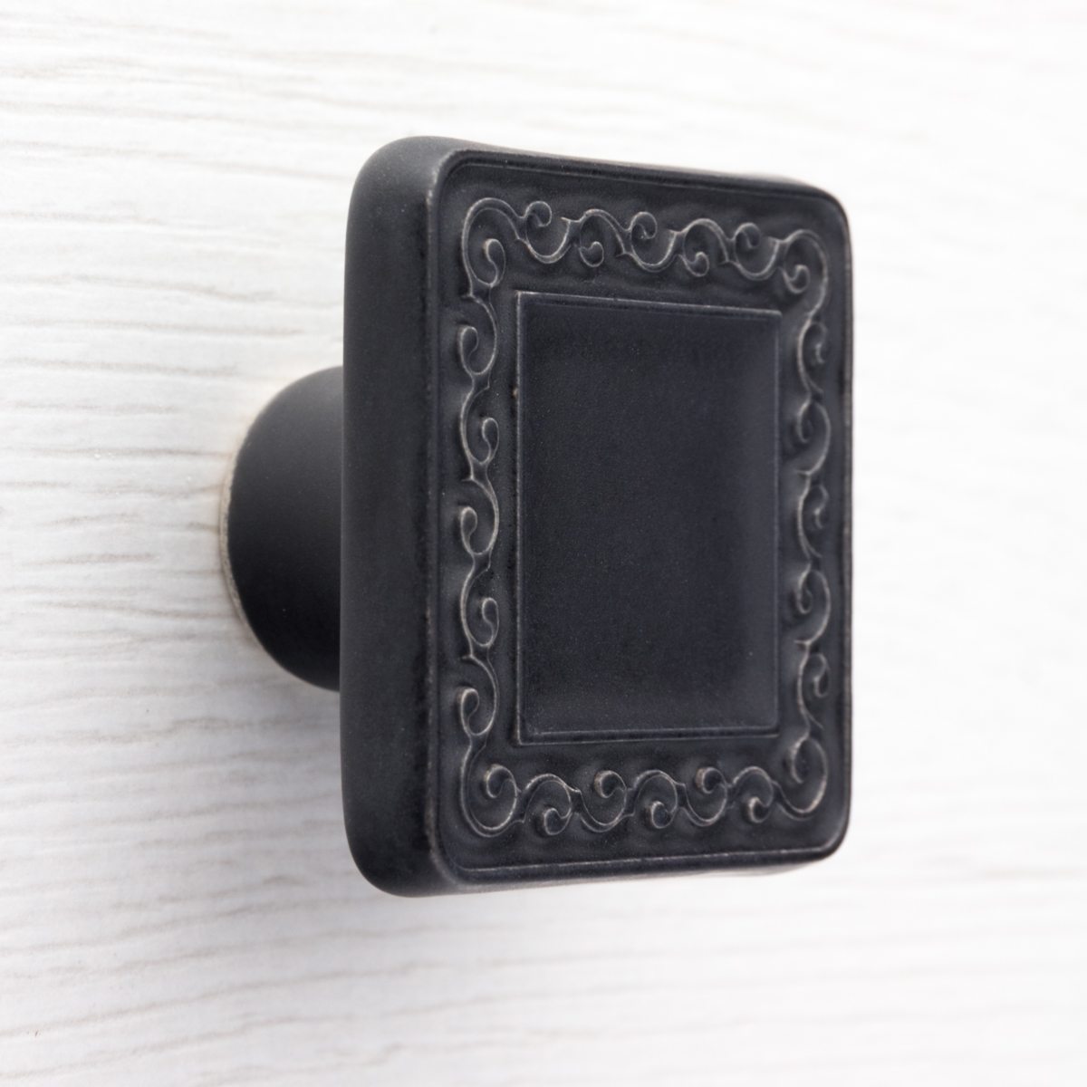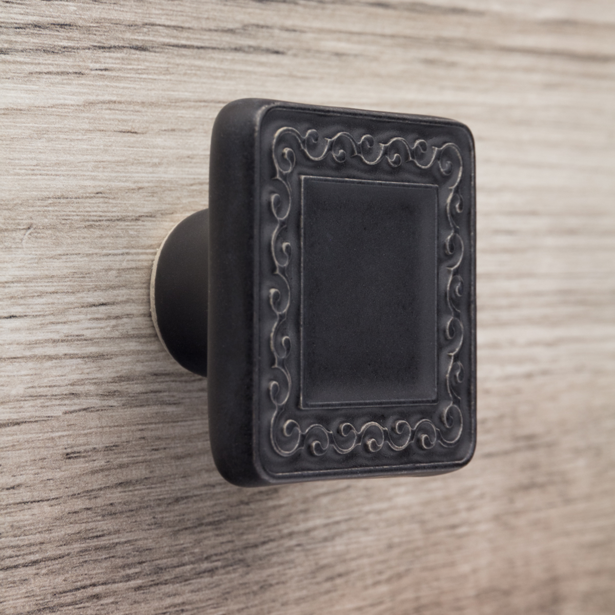 Ceramiczna gałka do mebli z lekko wypukłym ornamentem. Ręcznie wykonana z jasnej gliny, pokryta szkliwem o satynowym połysku.