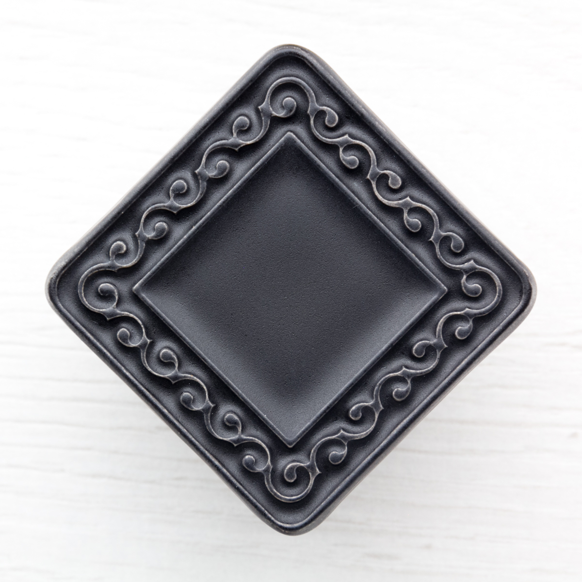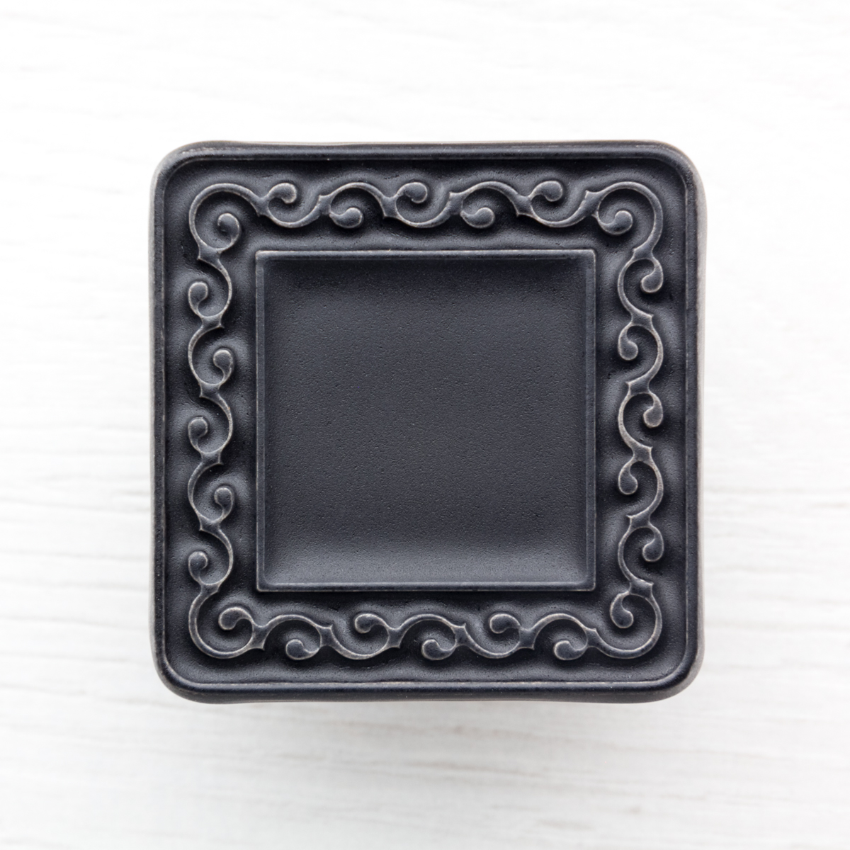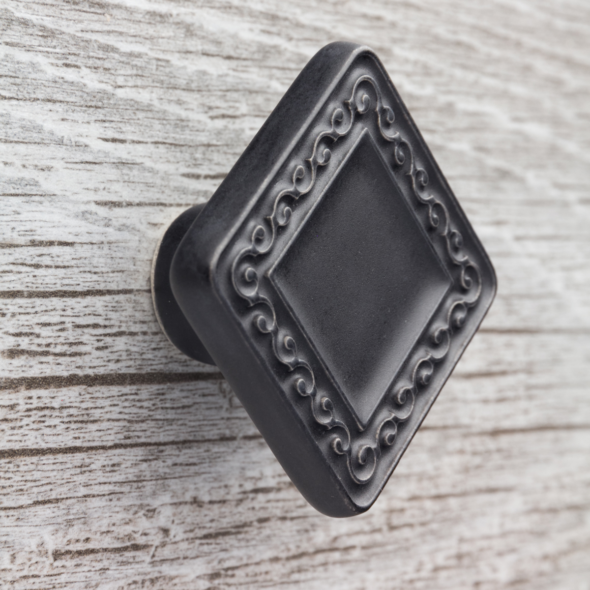 Ceramiczna gałka do mebli z lekko wypukłym ornamentem. Ręcznie wykonana z jasnej gliny, pokryta szkliwem o satynowym połysku.