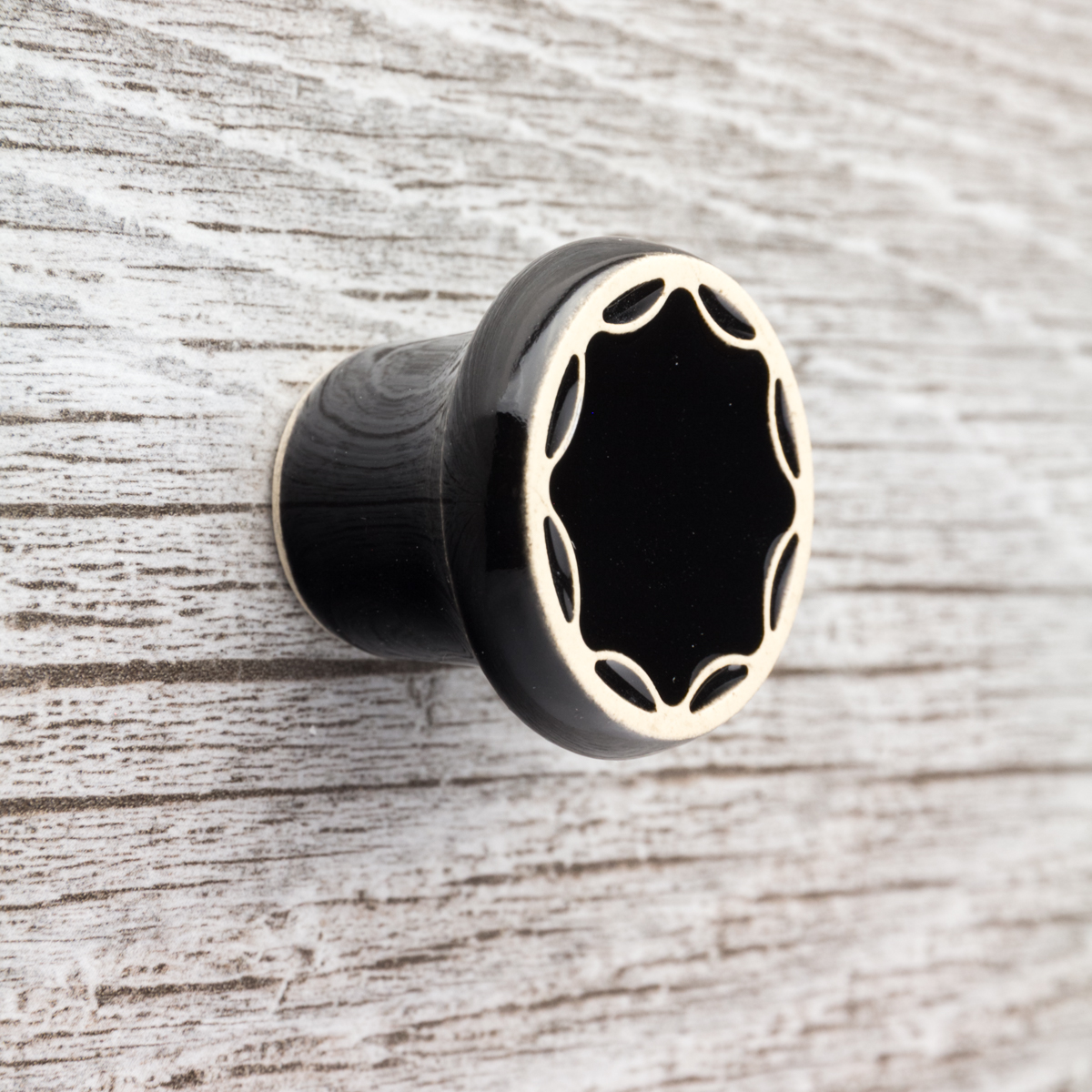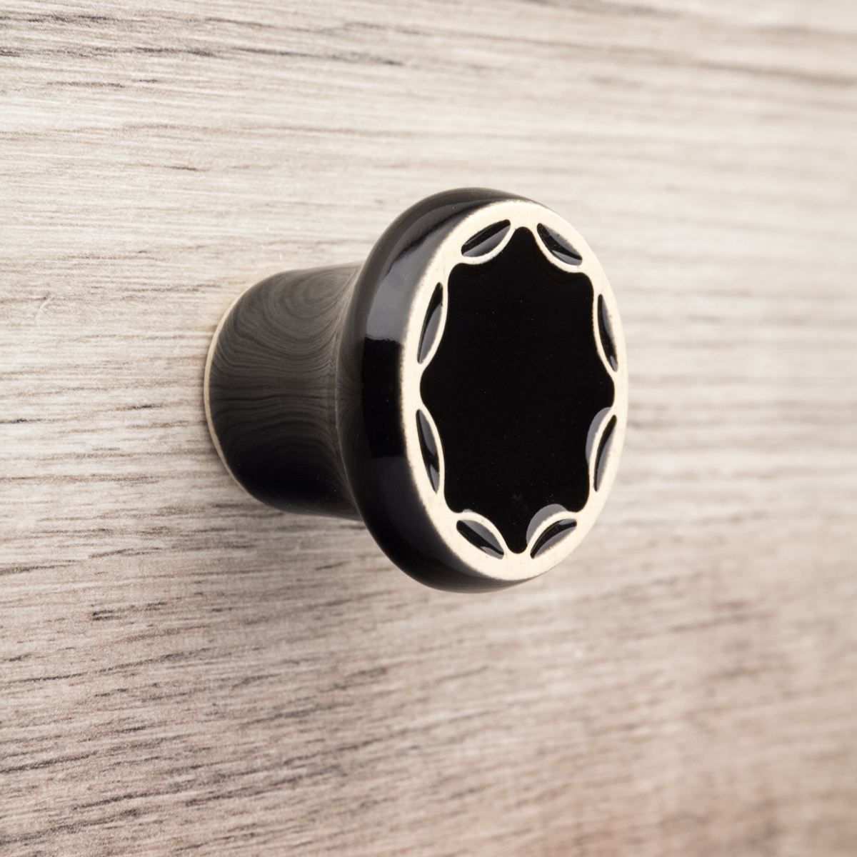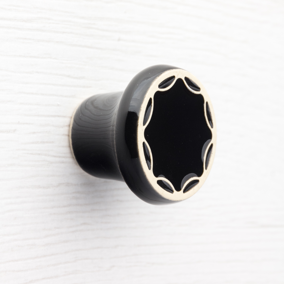 Ceramiczna gałka do mebli – ręcznie wykonana, ornamentowa, wg własnego projektu. Wykonana z jasnej gliny, pokryta błyszczącym szkliwem.