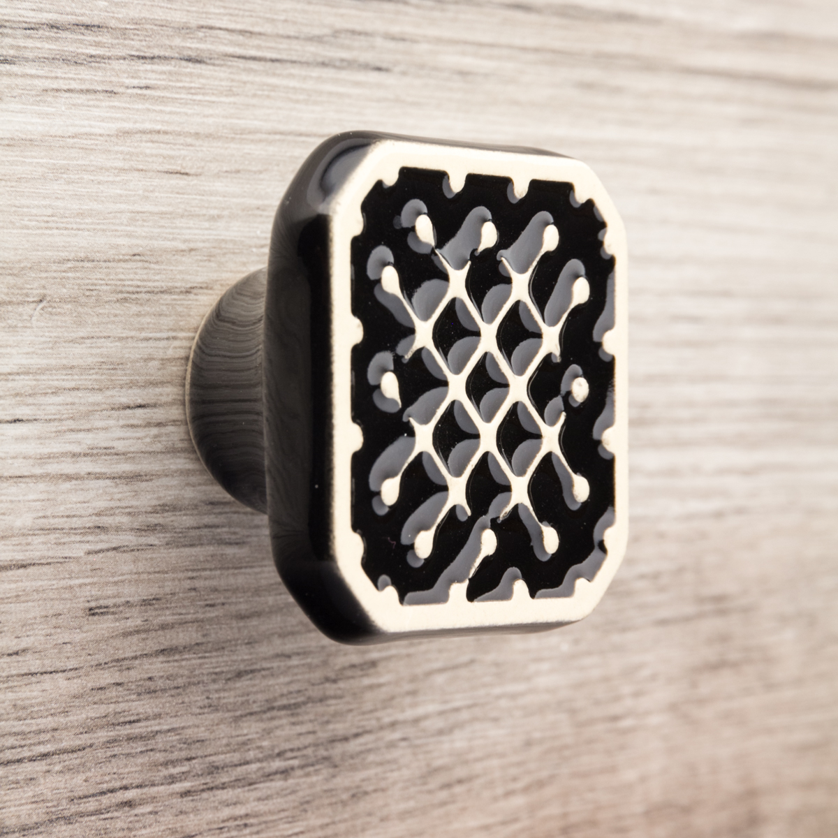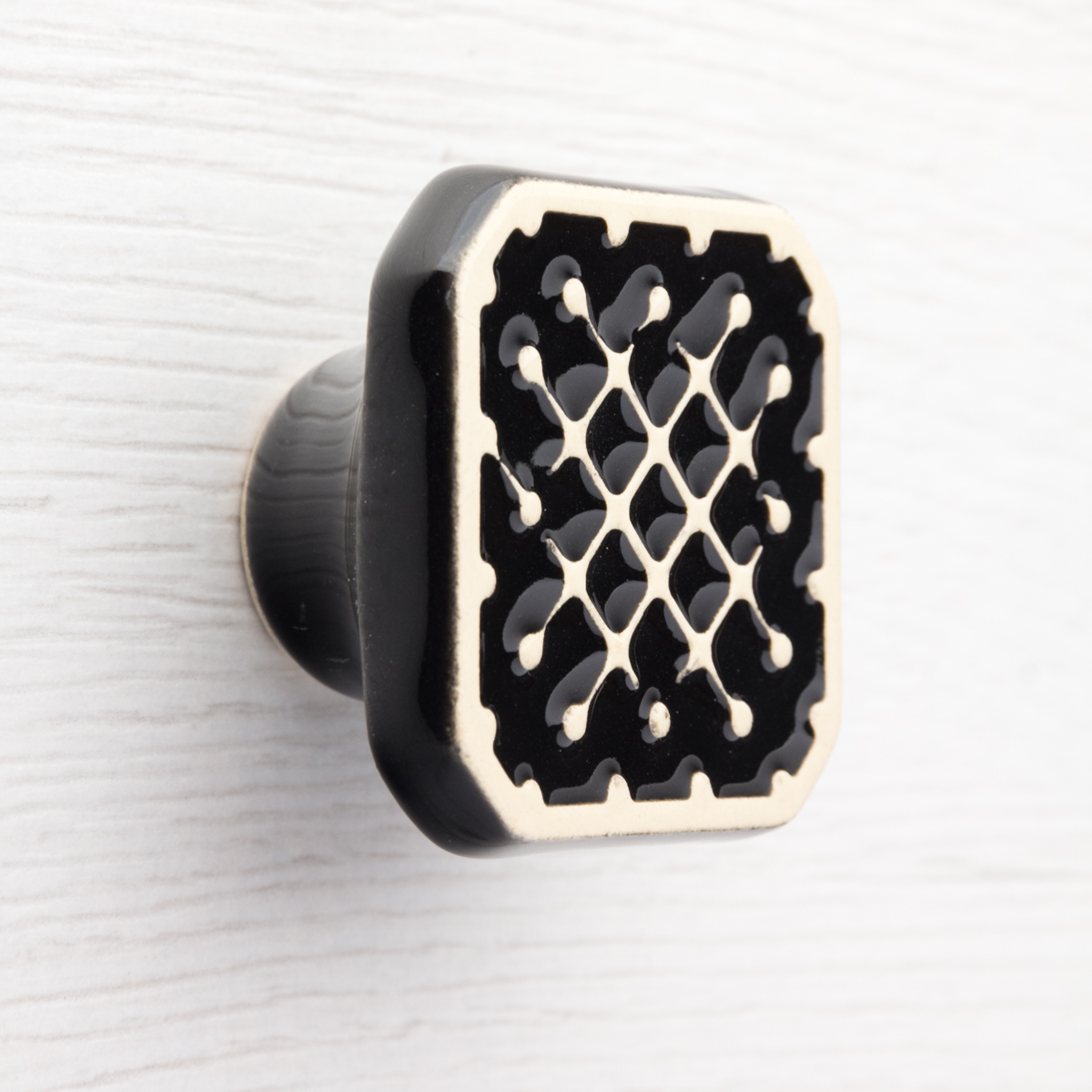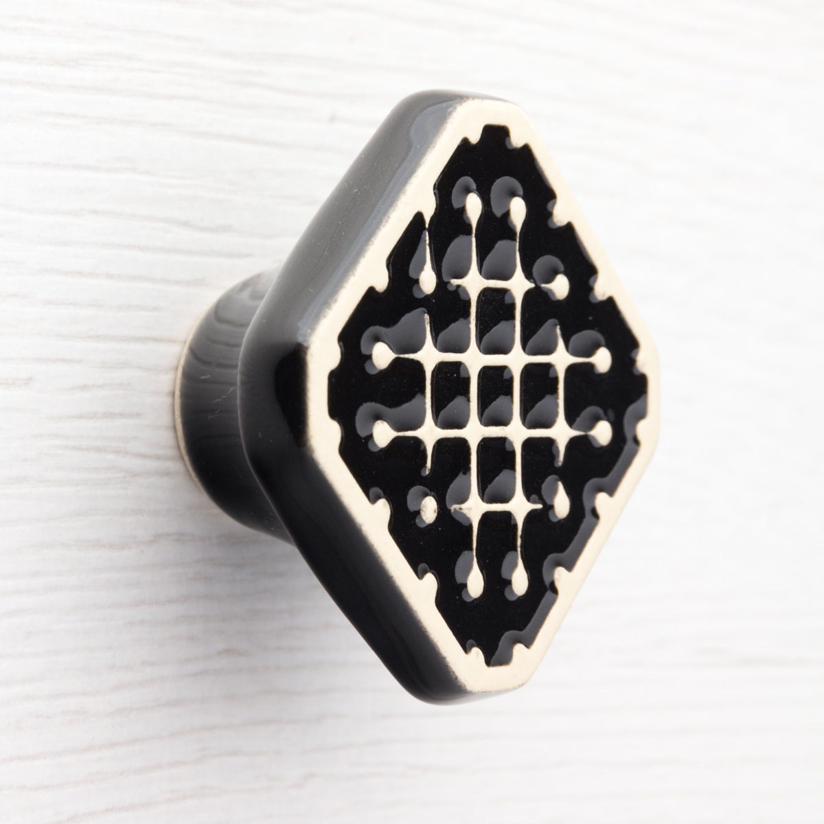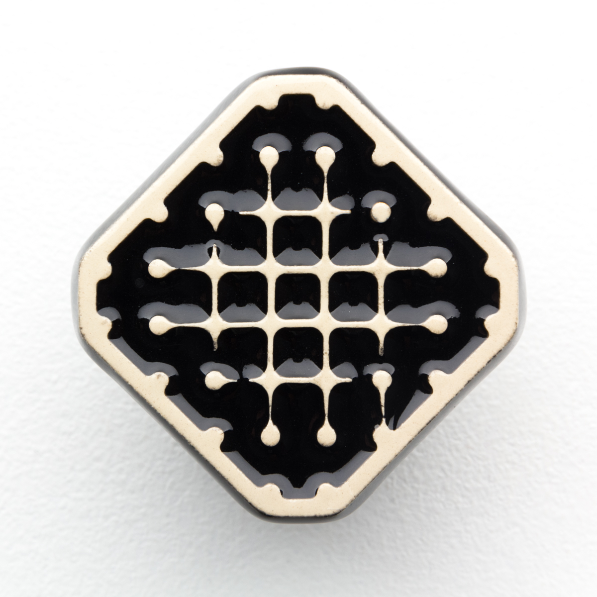 Ceramiczna gałka do mebli z lekko wypukłym ornamentem. Ręcznie wykonana z jasnej gliny, pokryta błyszczącym szkliwem.