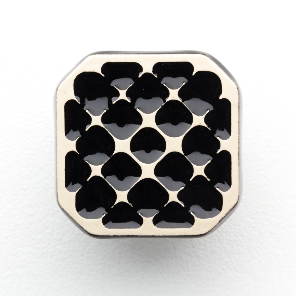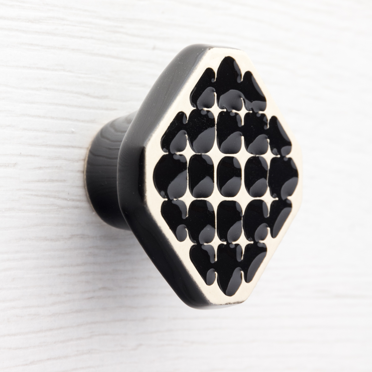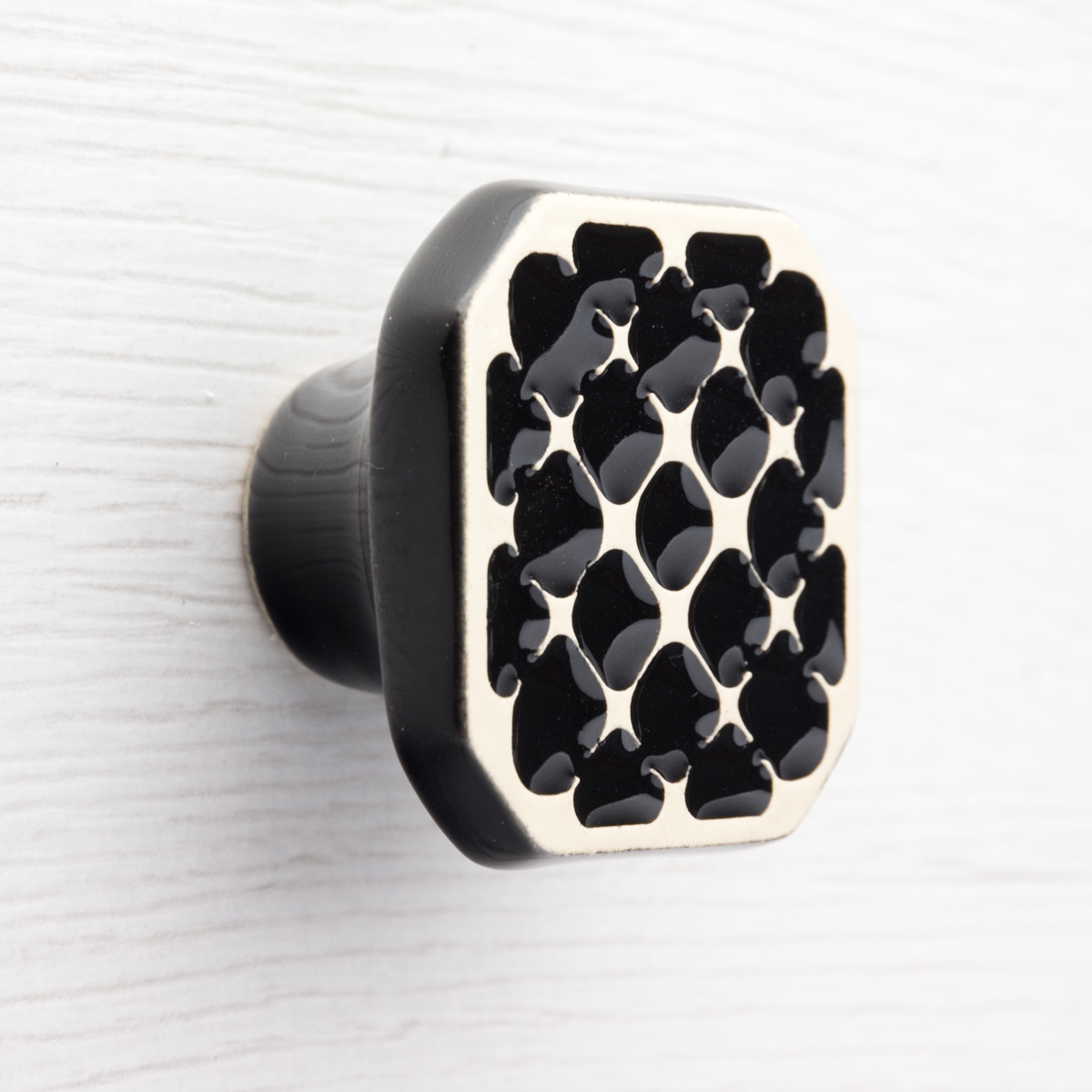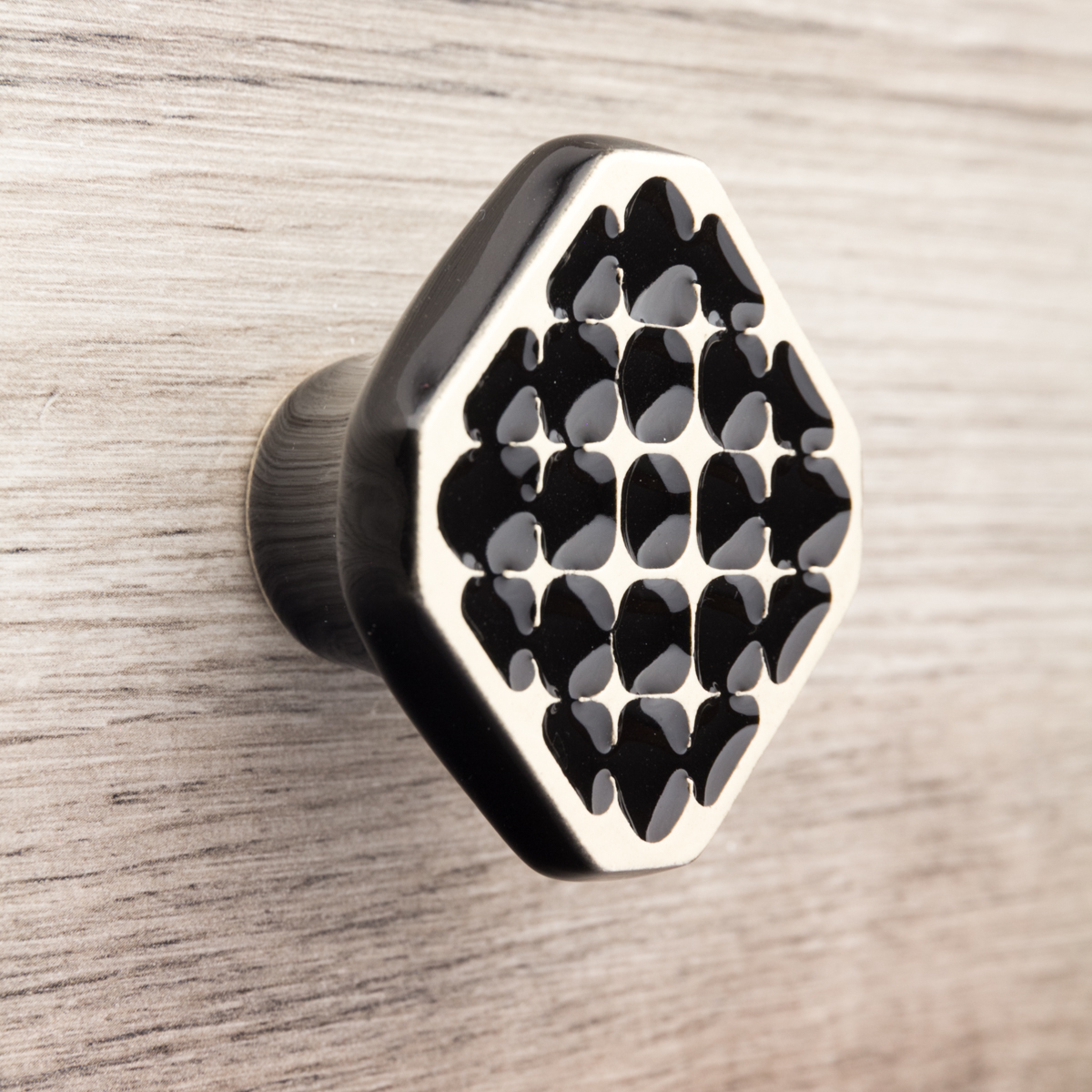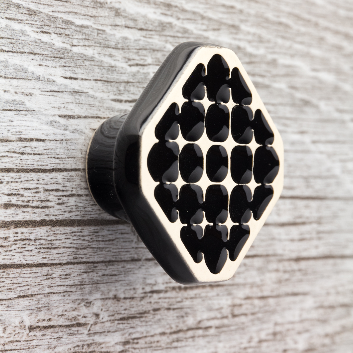Ceramiczna gałka do mebli z lekko wypukłym ornamentem. Ręcznie wykonana z jasnej gliny, pokryta błyszczącym, szkliwem, wypalona dwukrotnie w wysokiej temperaturze.