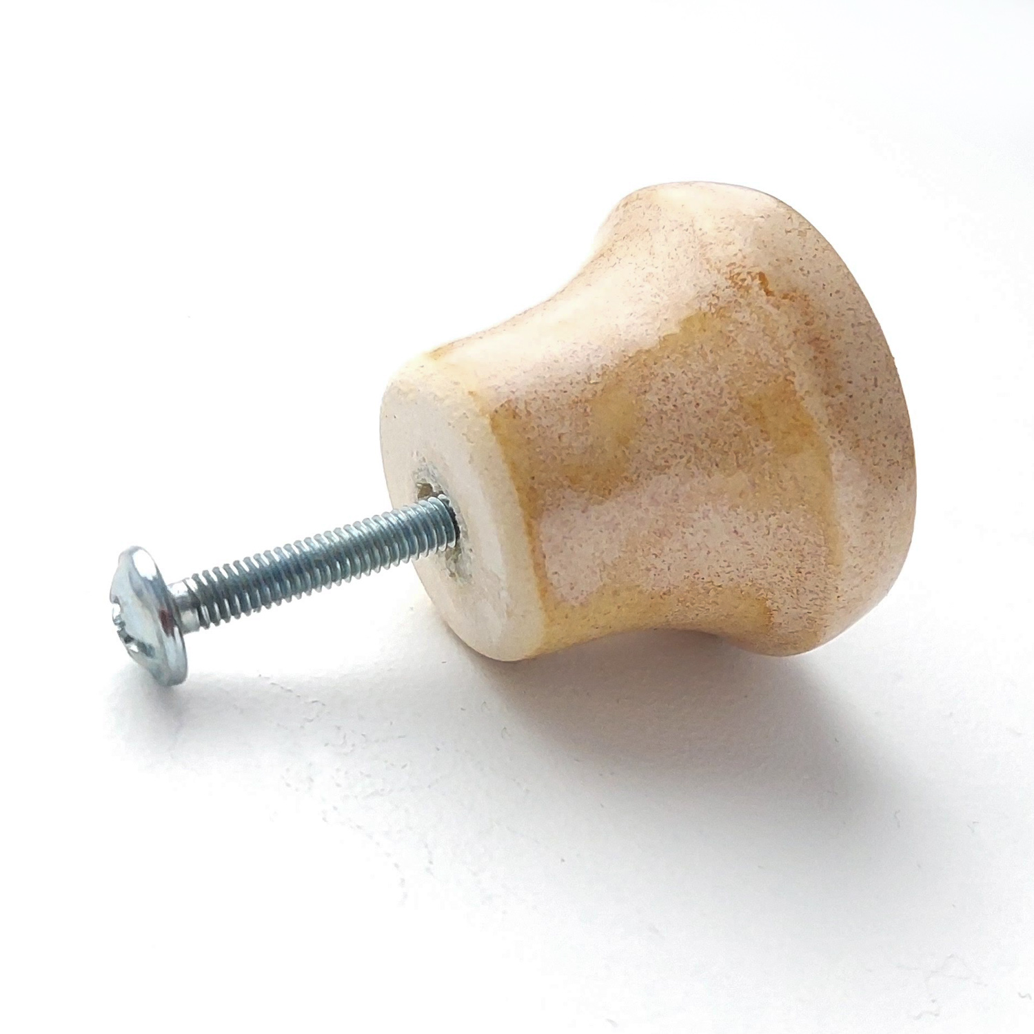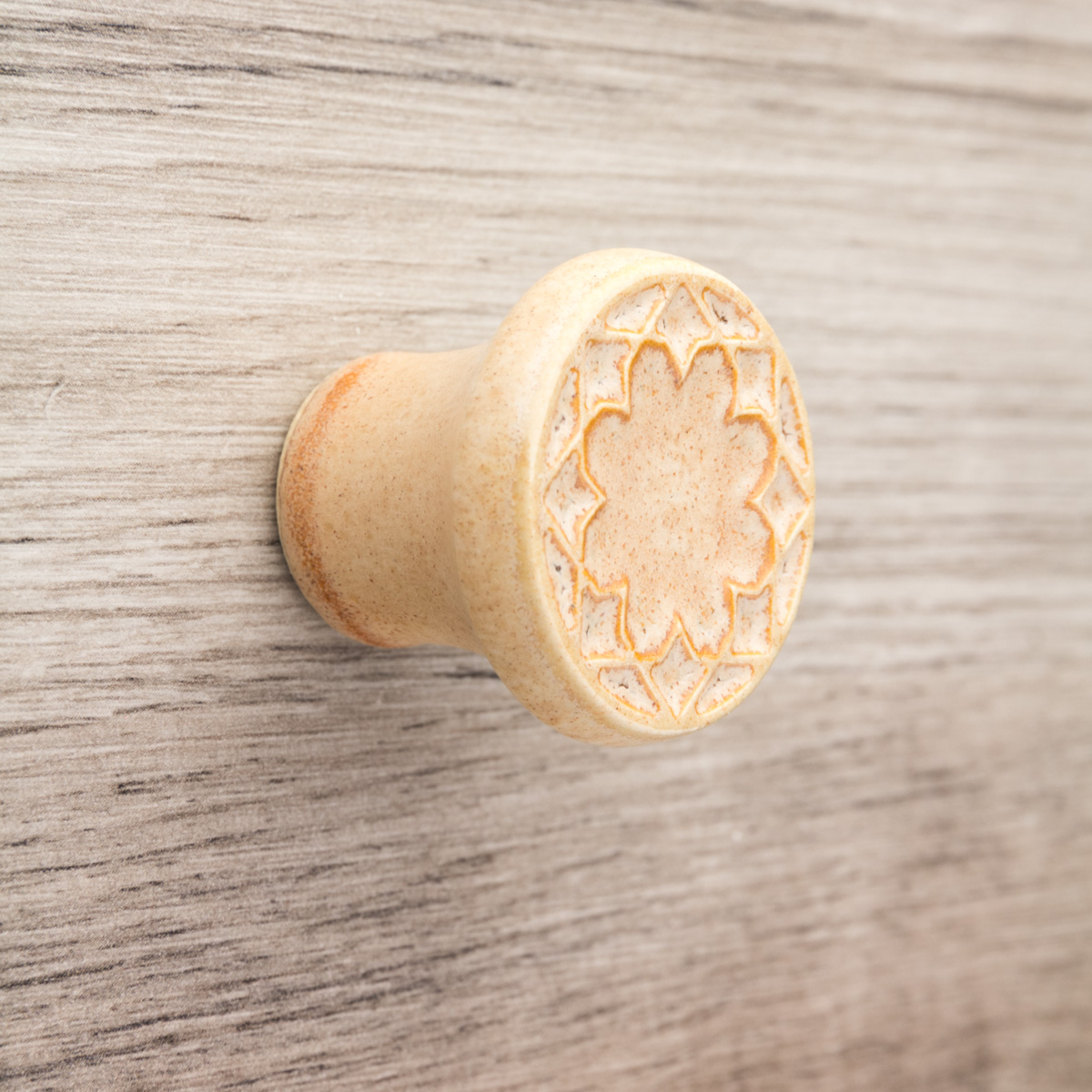 Ceramiczna gałka do mebli – ręcznie wykonana, ornamentowa, wg własnego projektu. Wykonana z jasnej gliny, pokryta szkliwem o satynowym połysku.