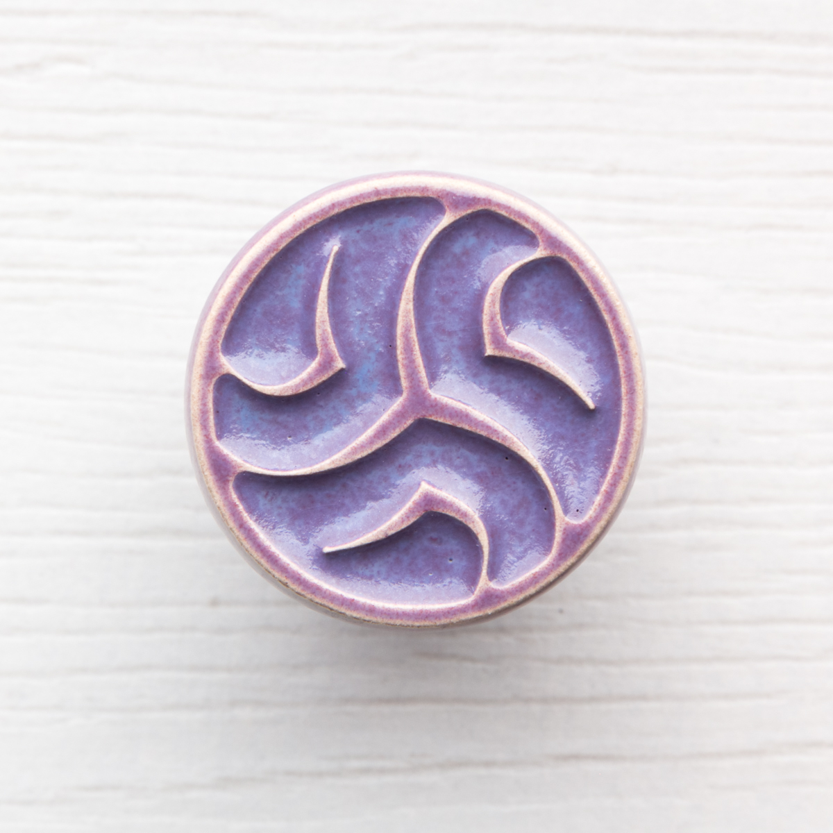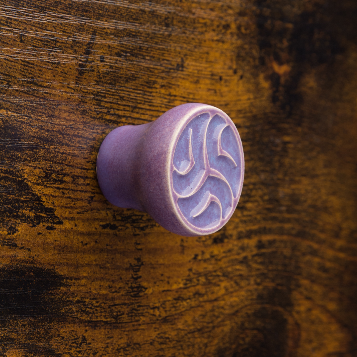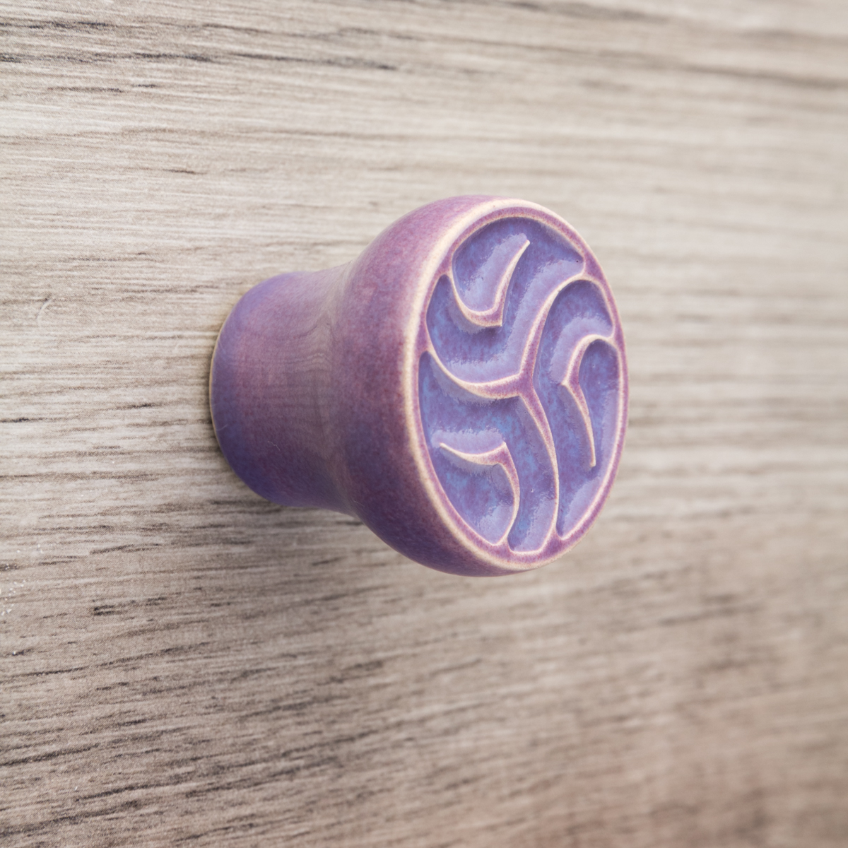 Ceramiczna gałka do mebli z lekko wypukłym ornamentem. Ręcznie wykonana z jasnej gliny, pokryta szkliwem o satynowym połysku.