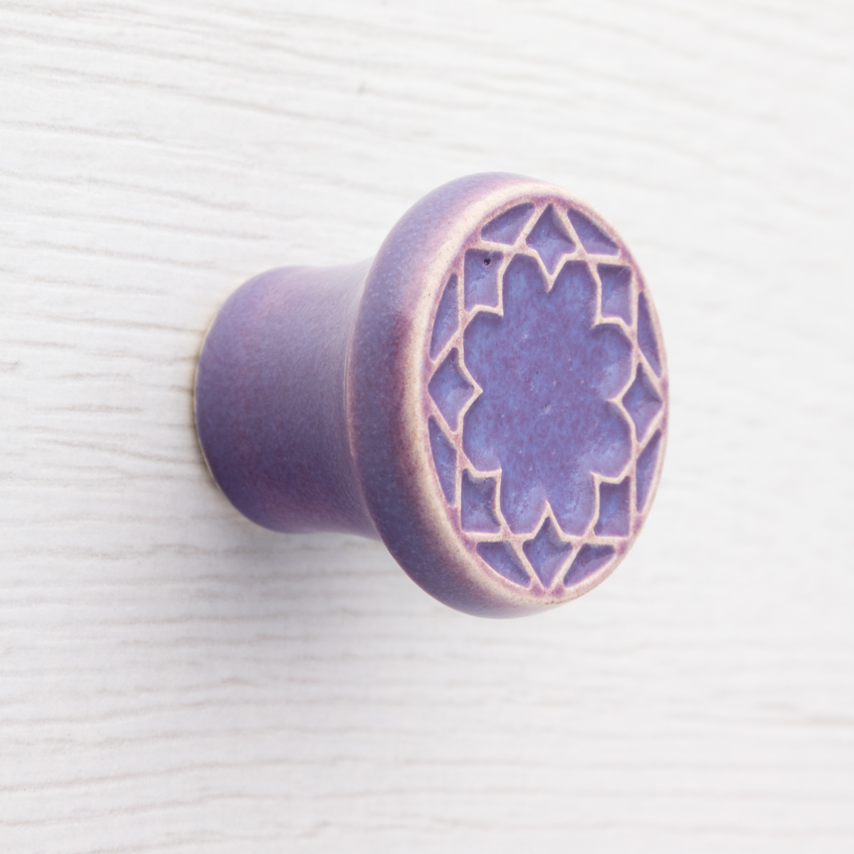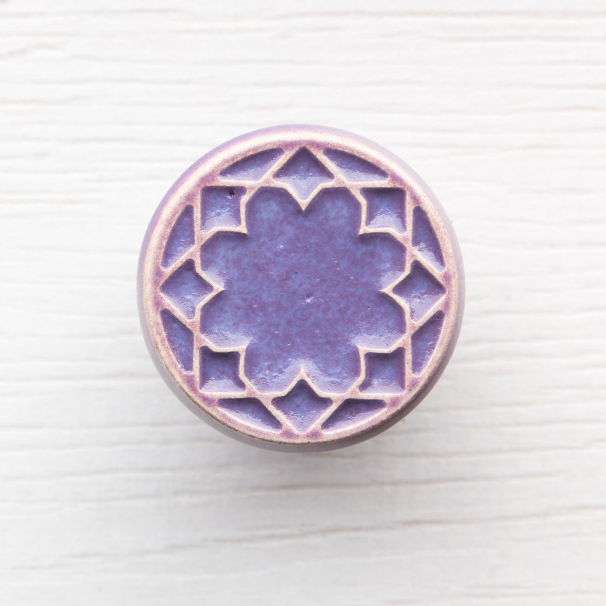 Ceramiczna gałka do mebli z lekko wypukłym ornamentem. Ręcznie wykonana z jasnej gliny, pokryta szkliwem o satynowym połysku.