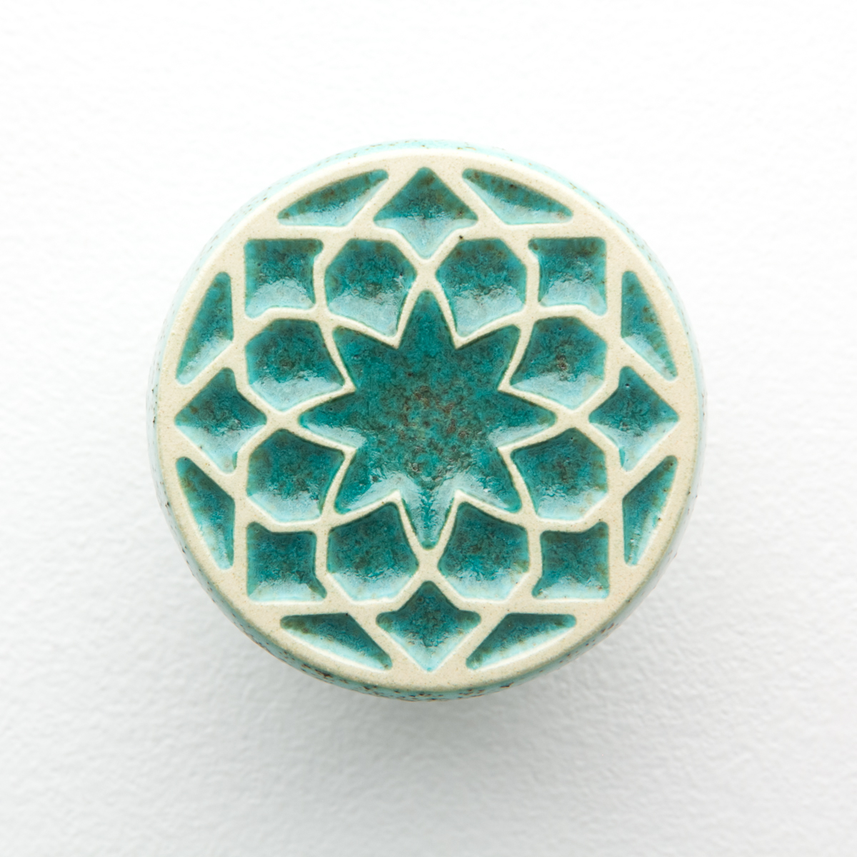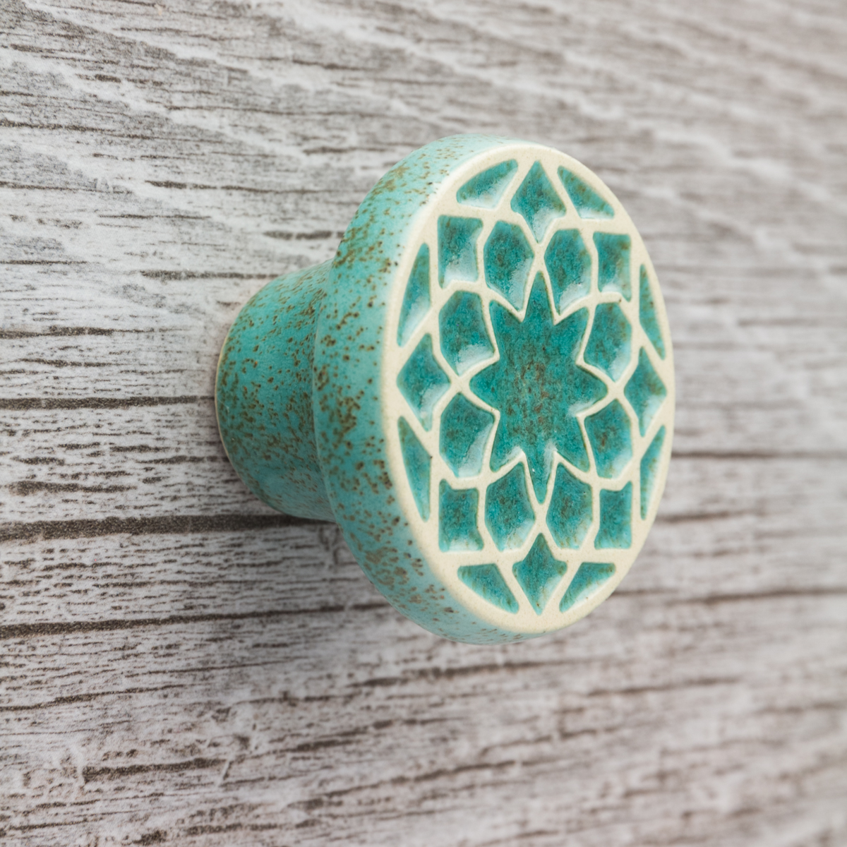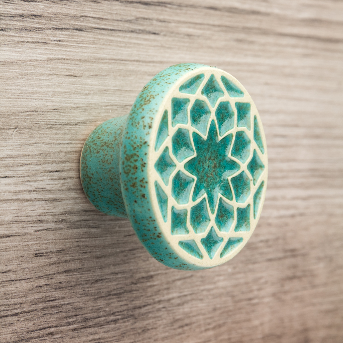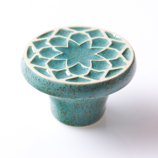 Ceramiczna gałka do mebli – ręcznie wykonana, ornamentowa, wg własnego projektu. Wykonana z jasnej gliny, pokryta szkliwem o satynowym połysku.