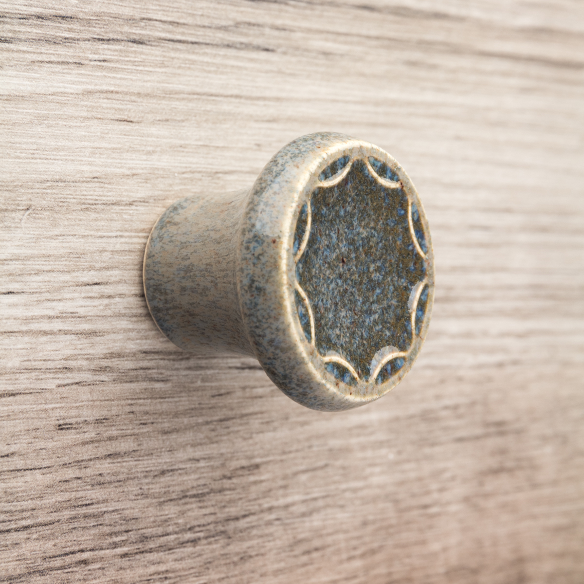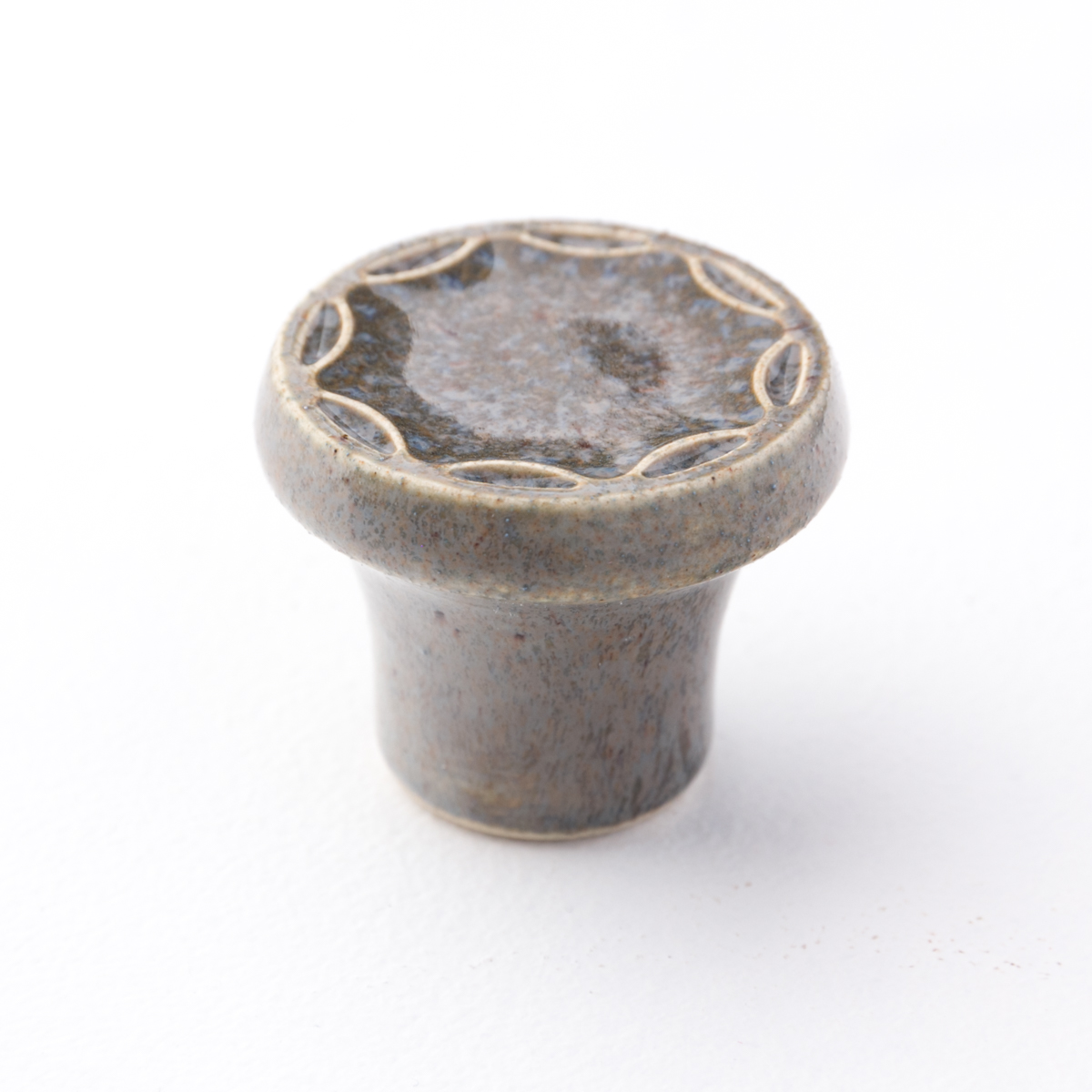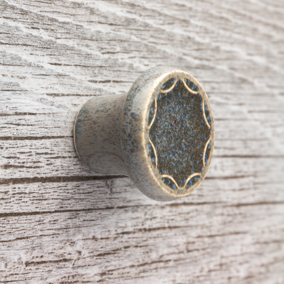 Ceramiczna gałka do mebli z lekko wypukłym ornamentem. Ręcznie wykonana z jasnej gliny, pokryta błyszczącym szkliwem.