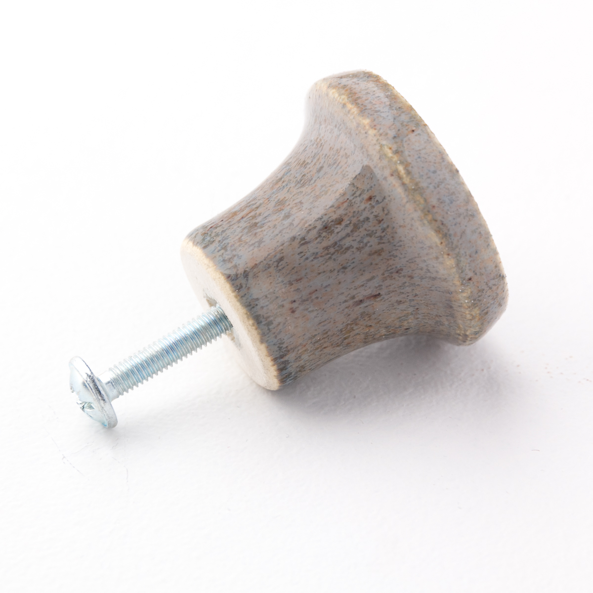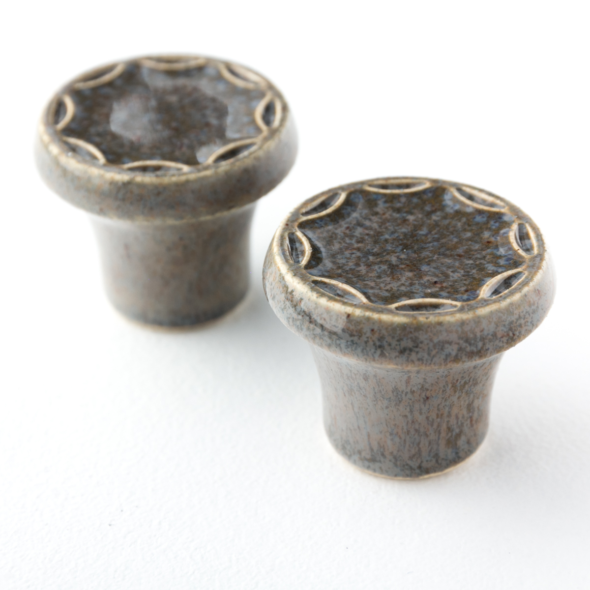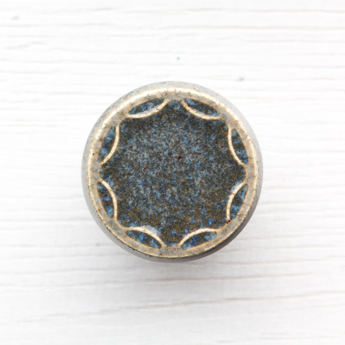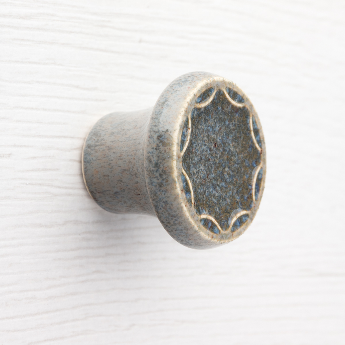 Ceramiczna gałka do mebli z lekko wypukłym ornamentem. Ręcznie wykonana z jasnej gliny, pokryta błyszczącym szkliwem.