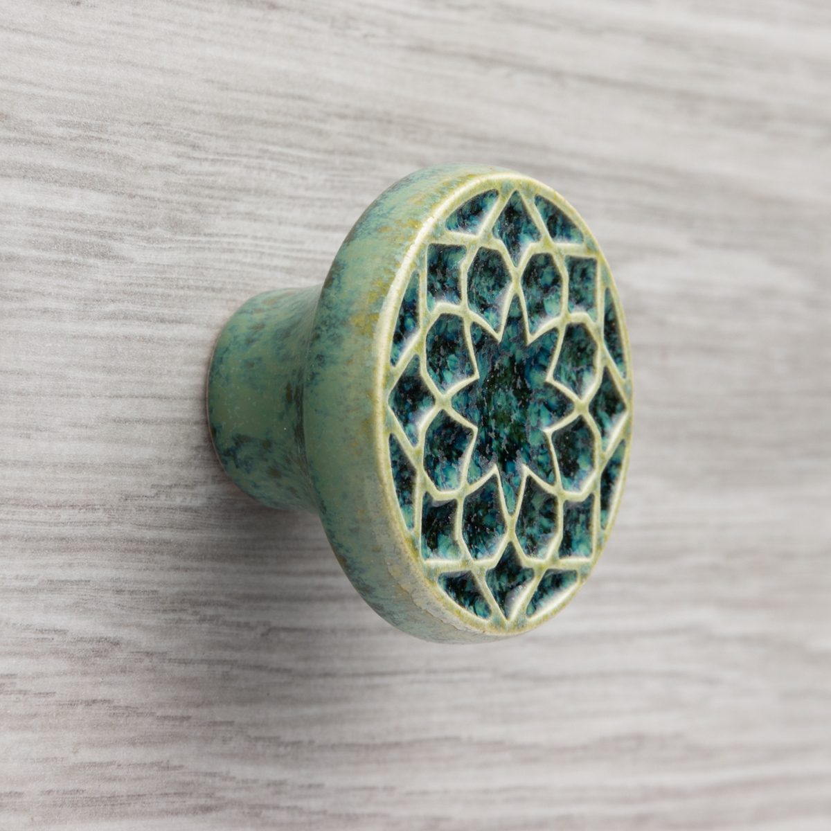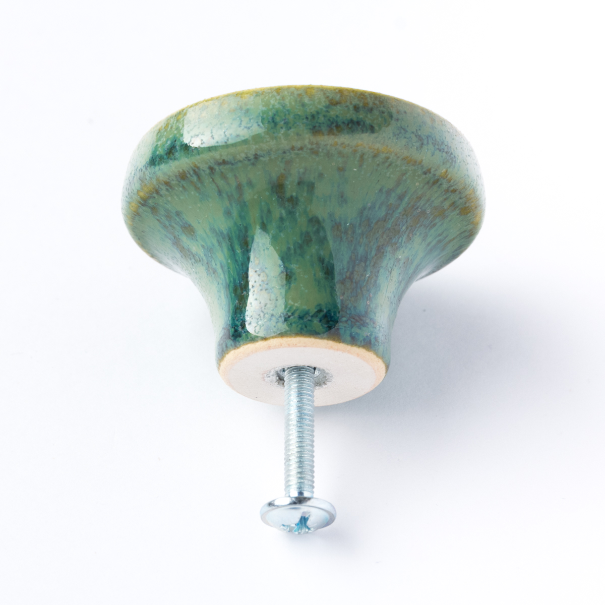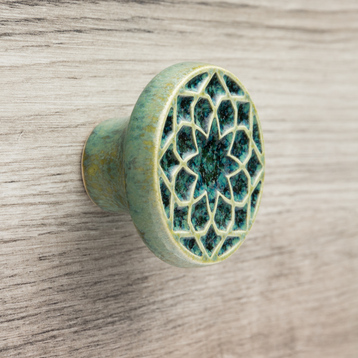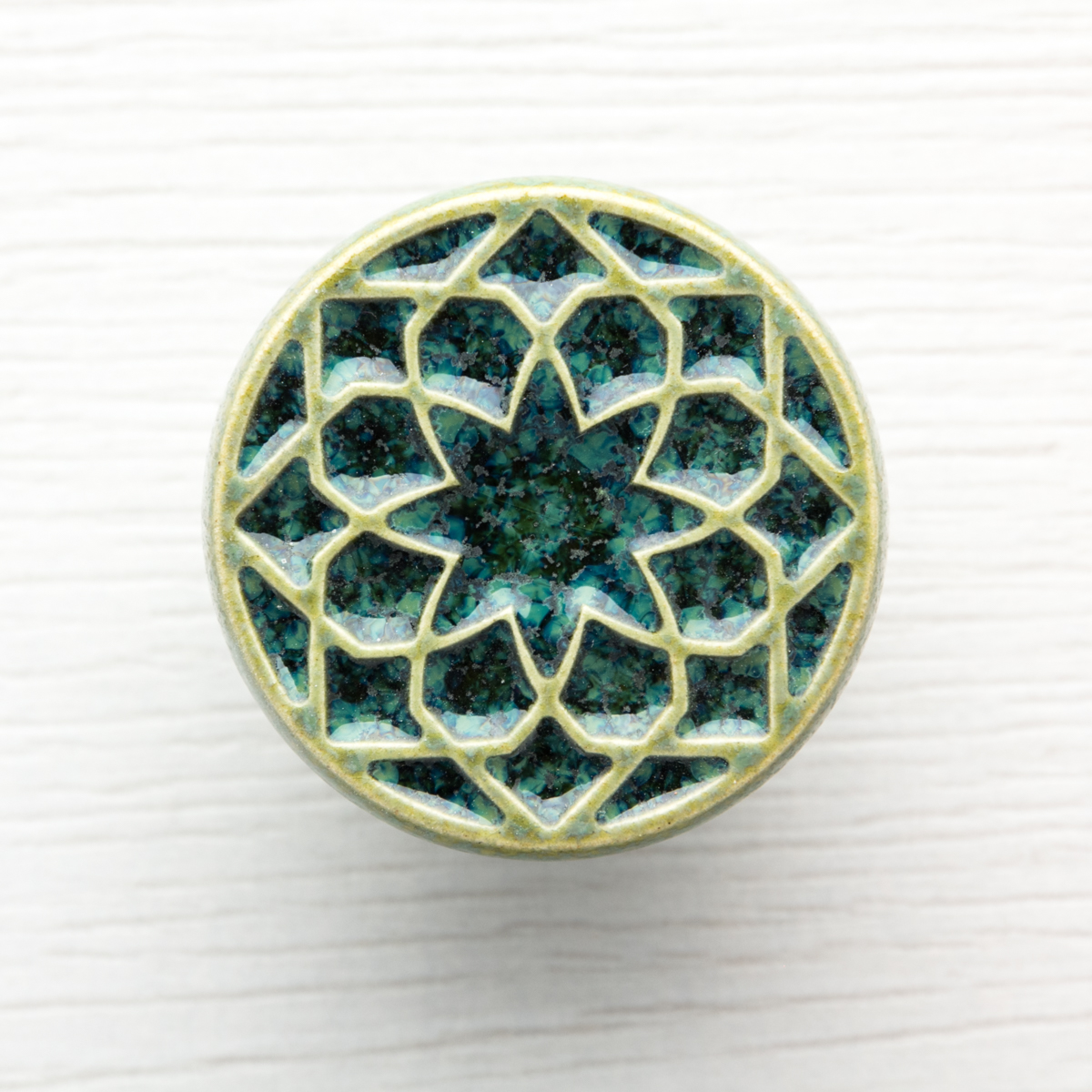 Ceramiczna gałka do mebli – ręcznie wykonana, ornamentowa, wg własnego projektu. Wykonana z jasnej gliny, pokryta błyszczącym szkliwem.