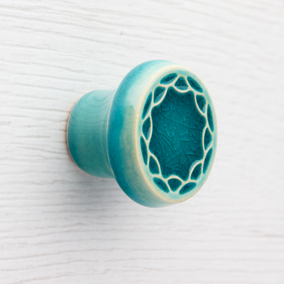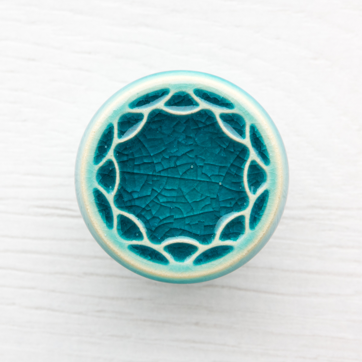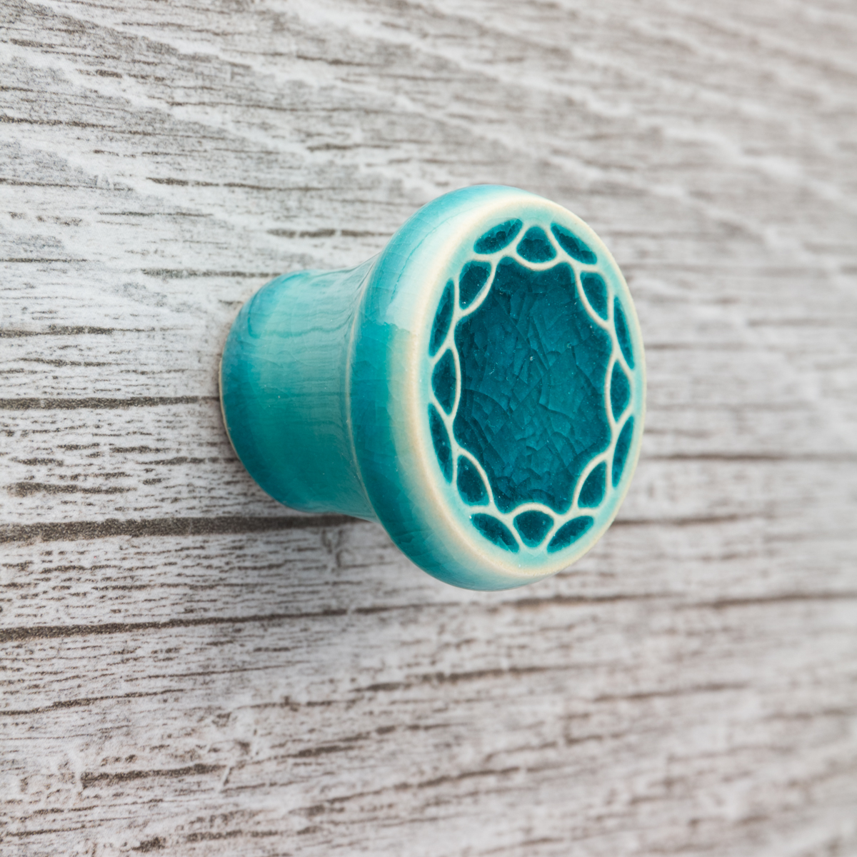 Okrągła, ceramiczna gałka do mebli z lekko wypukłym ornamentem. Ręcznie wykonana z jasnej gliny, pokryta błyszczącym szkliwem. Twoje meble zyskają nowy, niepowtarzalny, jedyny w swoim rodzaju wygląd.