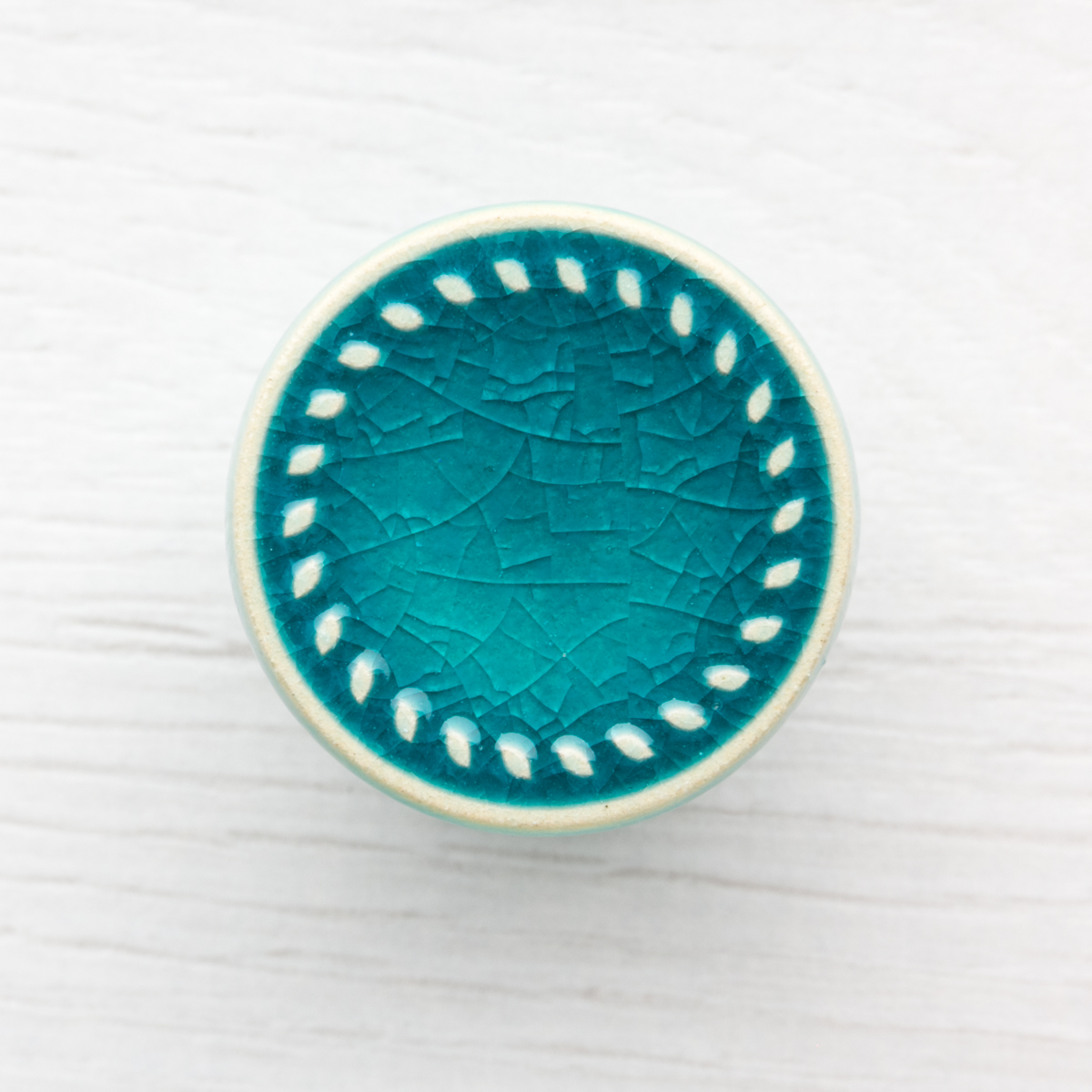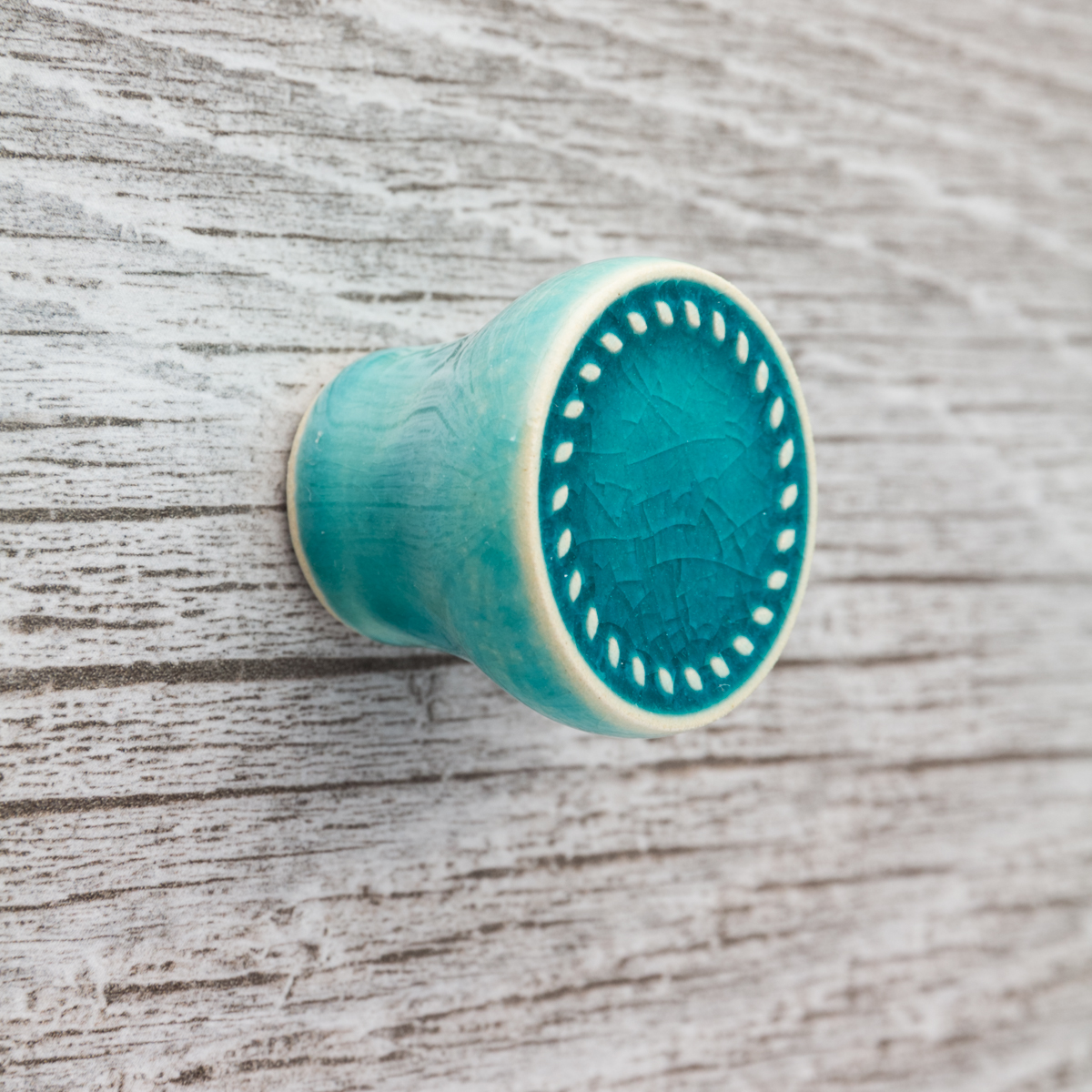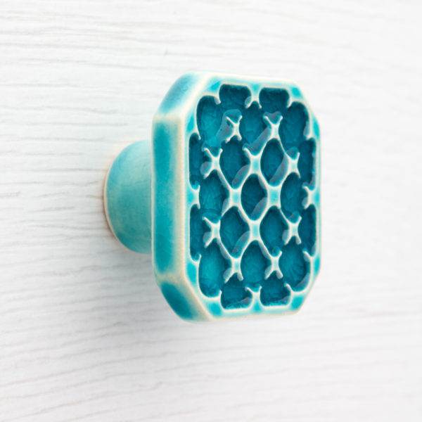 Ceramiczna gałka do mebli – ręcznie wykonana, ornamentowa, wg własnego projektu. Wykonana z jasnej gliny, pokryta błyszczącym szkliwem.