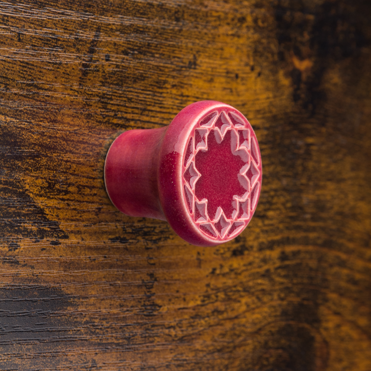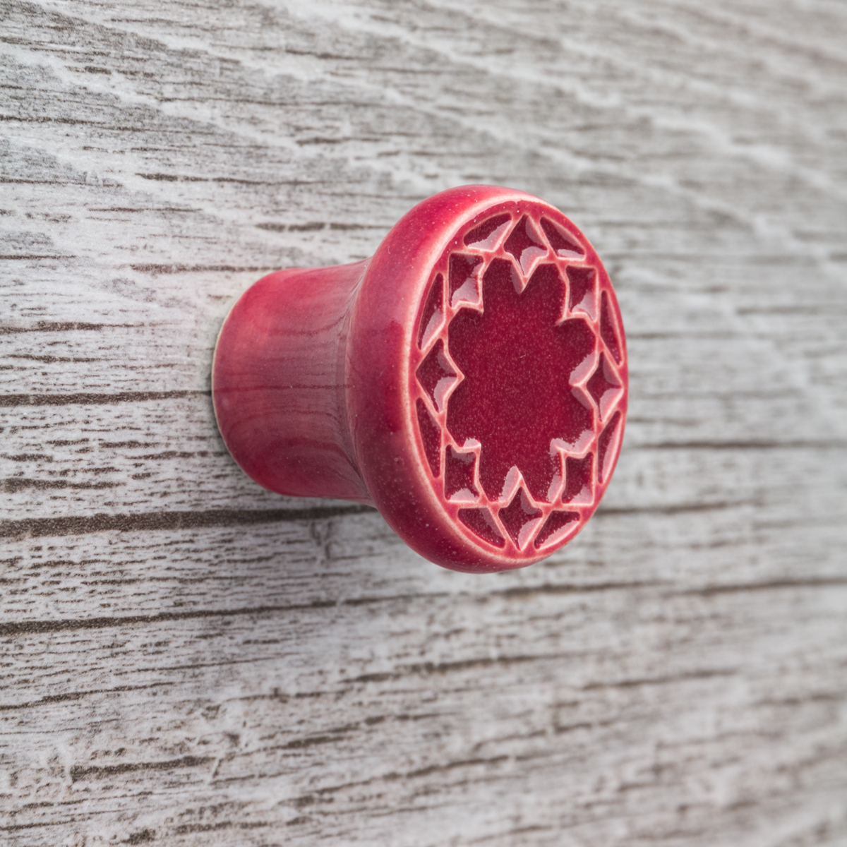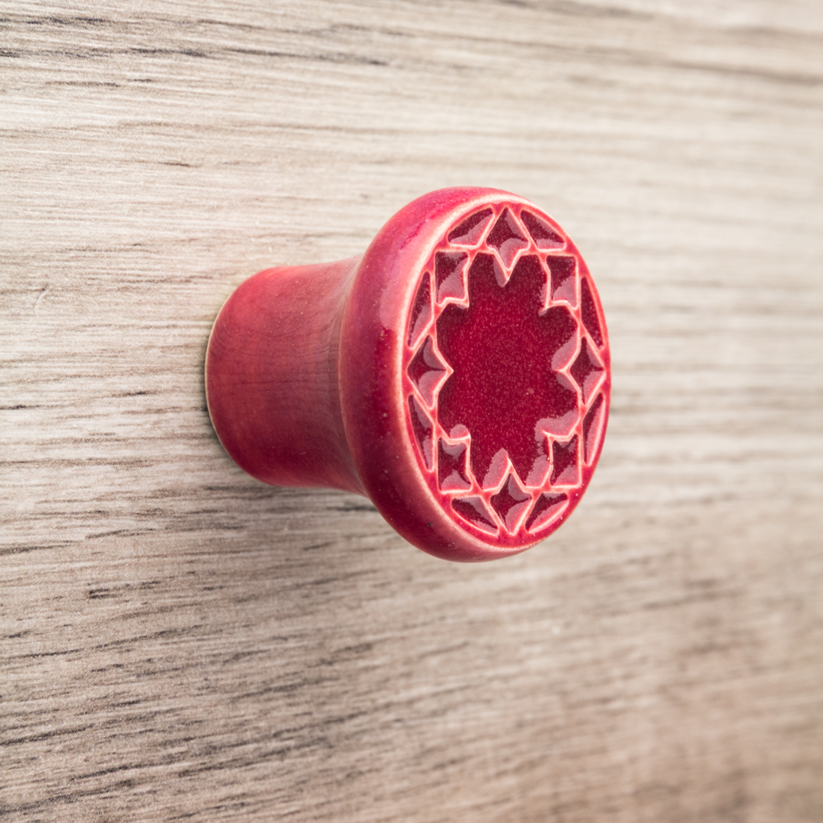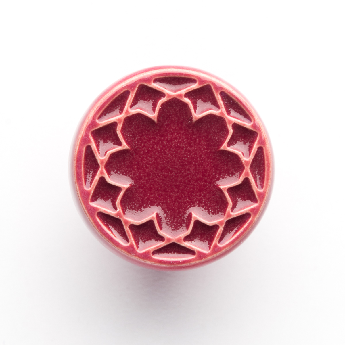 Ceramiczna gałka do mebli z lekko wypukłym ornamentem. Ręcznie wykonana z jasnej gliny, pokryta błyszczącym szkliwem.