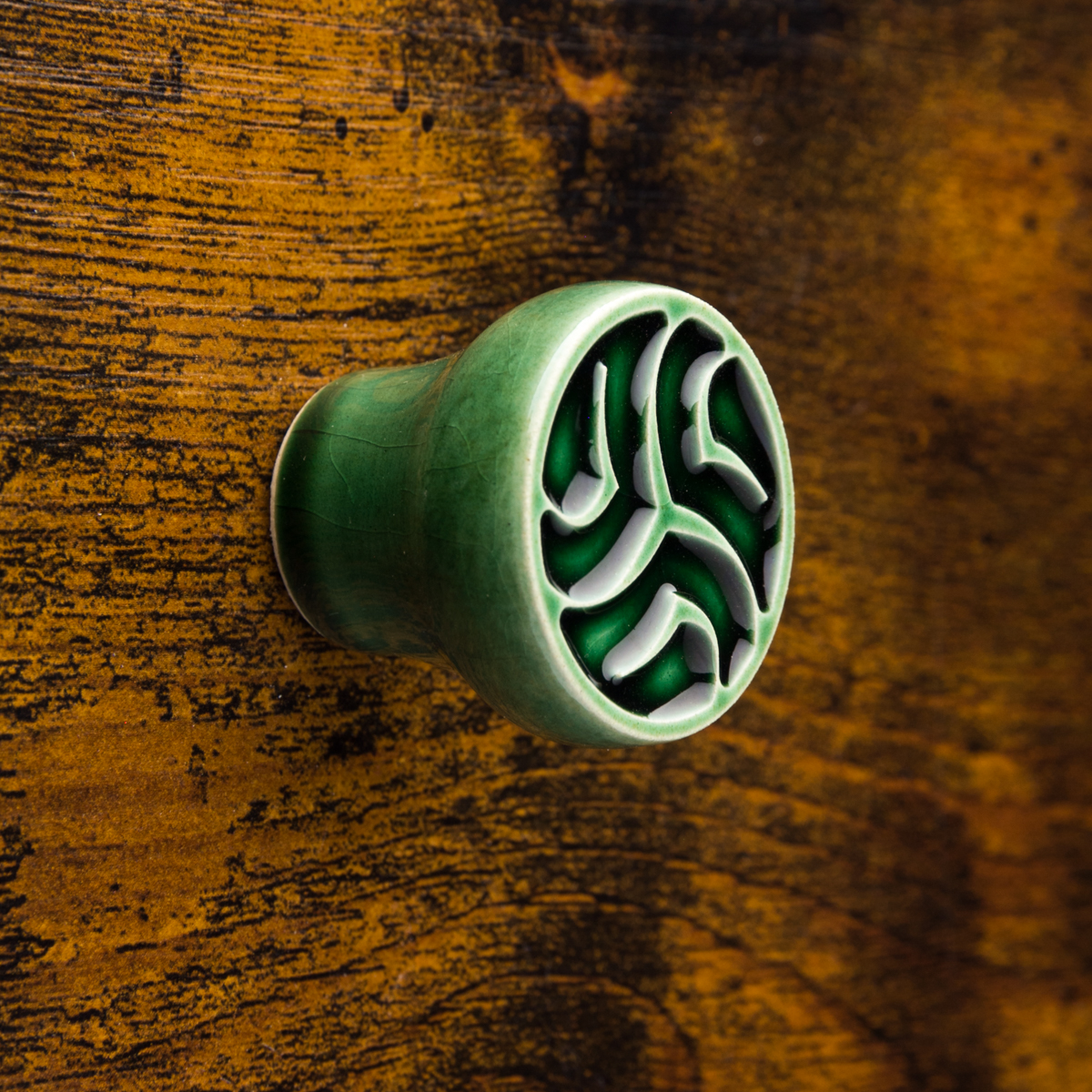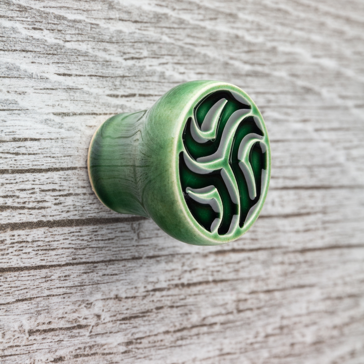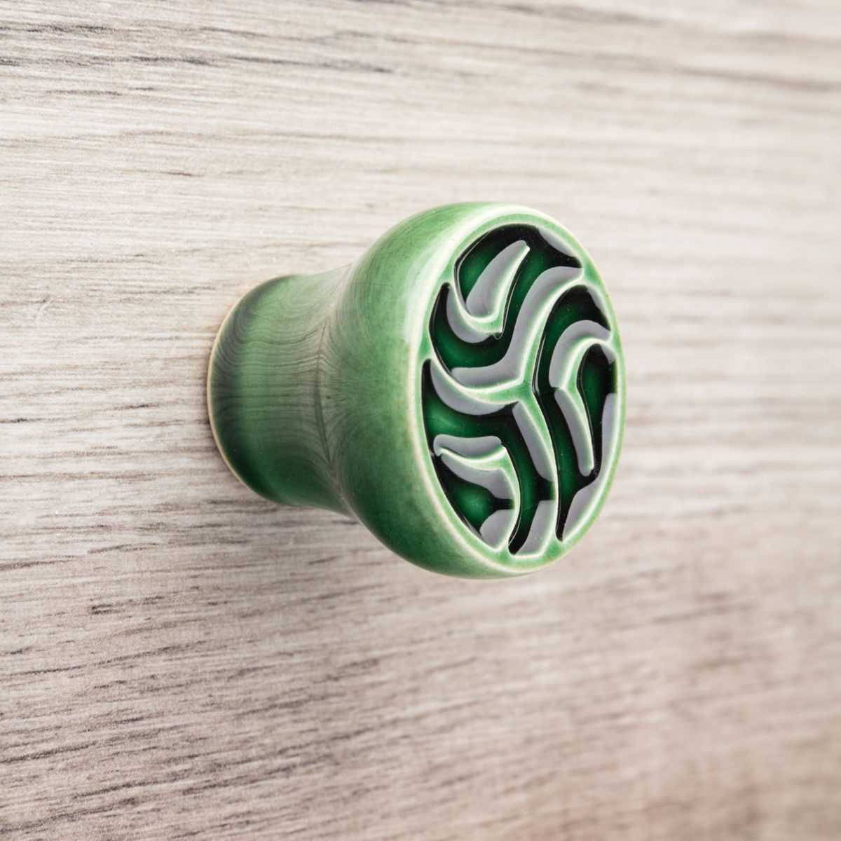 Ceramiczna gałka do mebli z lekko wypukłym ornamentem. Ręcznie wykonana z jasnej gliny, pokryta błyszczącym szkliwem.
