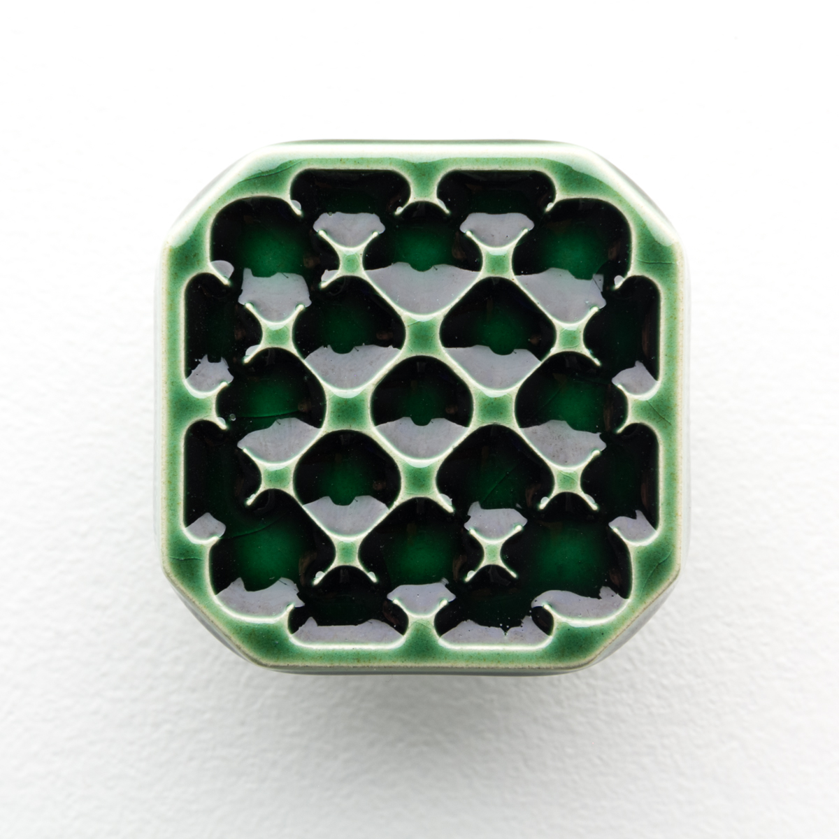 Ceramiczna gałka do mebli z lekko wypukłym ornamentem. Ręcznie wykonana z jasnej gliny, pokryta błyszczącym, szkliwem, wypalona dwukrotnie w wysokiej temperaturze.