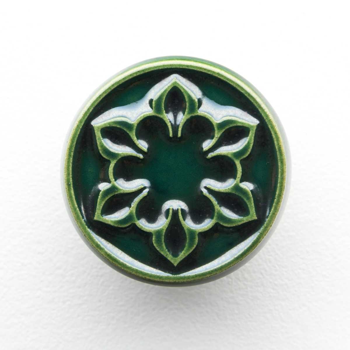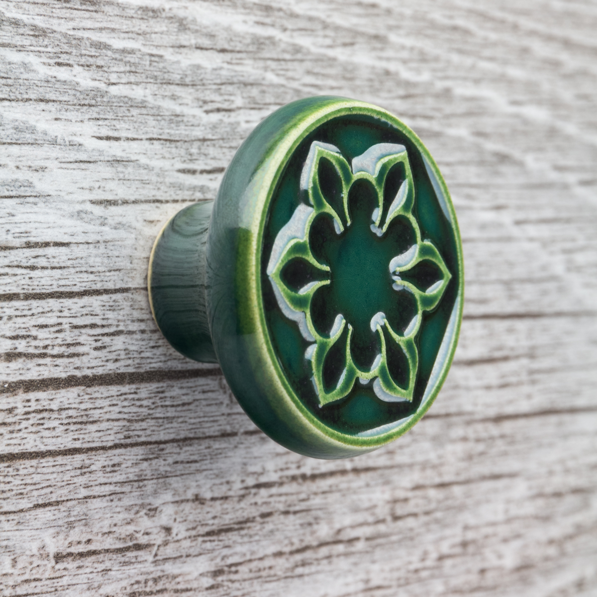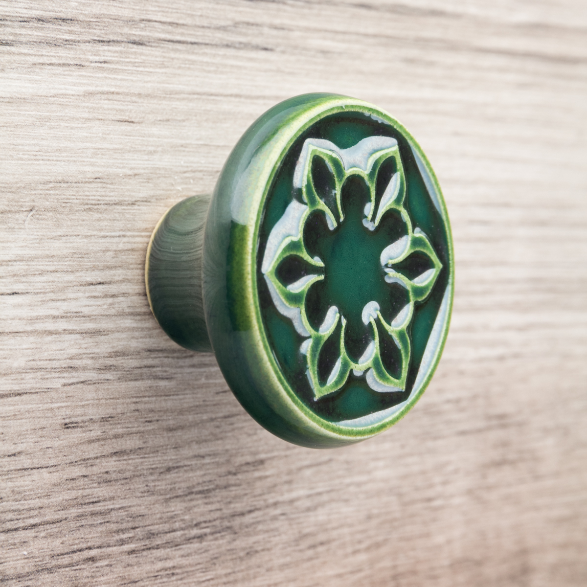 Ceramiczna gałka do mebli – ręcznie wykonana, ornamentowa, wg własnego projektu. Wykonana z jasnej gliny, pokryta błyszczącym szkliwem.