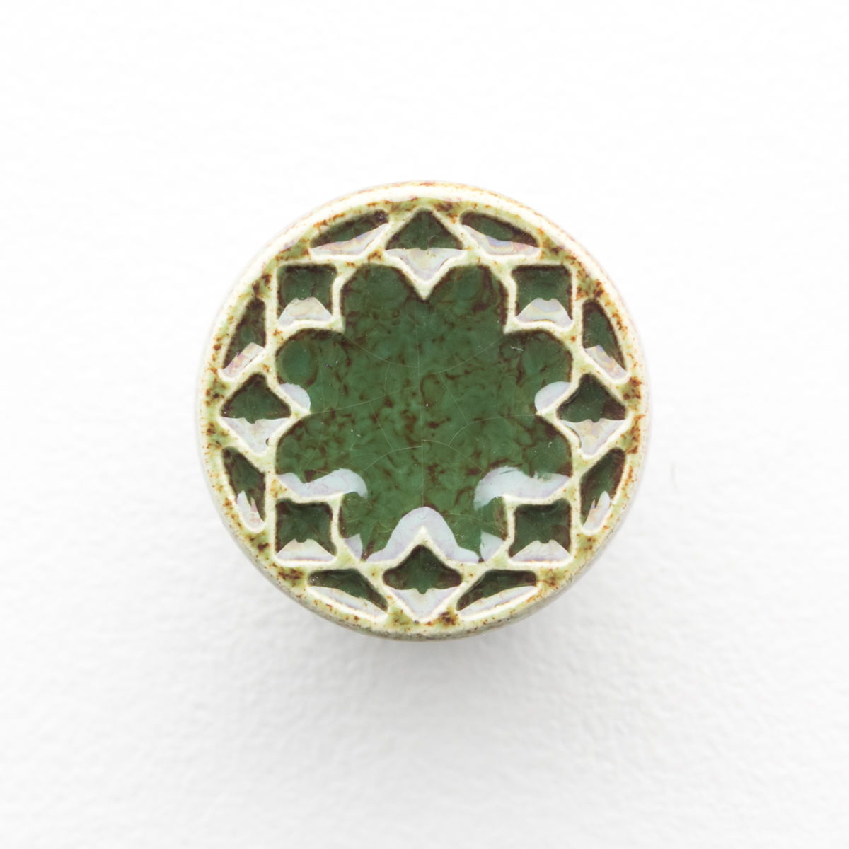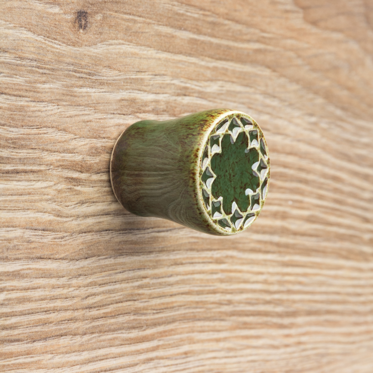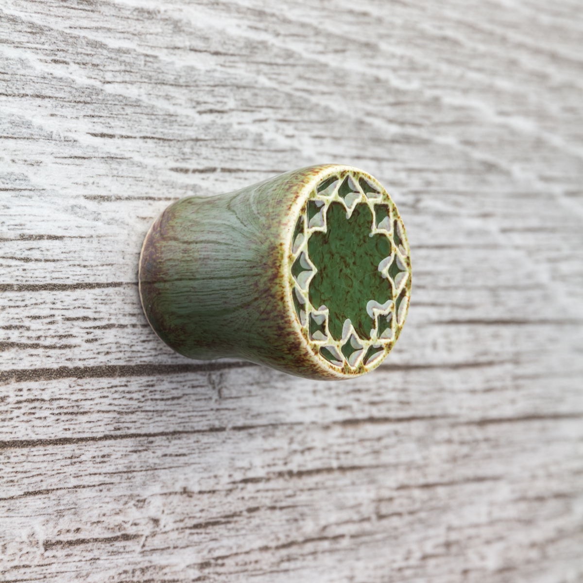 Ceramiczna gałka do mebli z lekko wypukłym ornamentem. Ręcznie wykonana z jasnej gliny, pokryta błyszczącym szkliwem. Twoje meble zyskają nowy, niepowtarzalny, jedyny w swoim rodzaju wygląd.